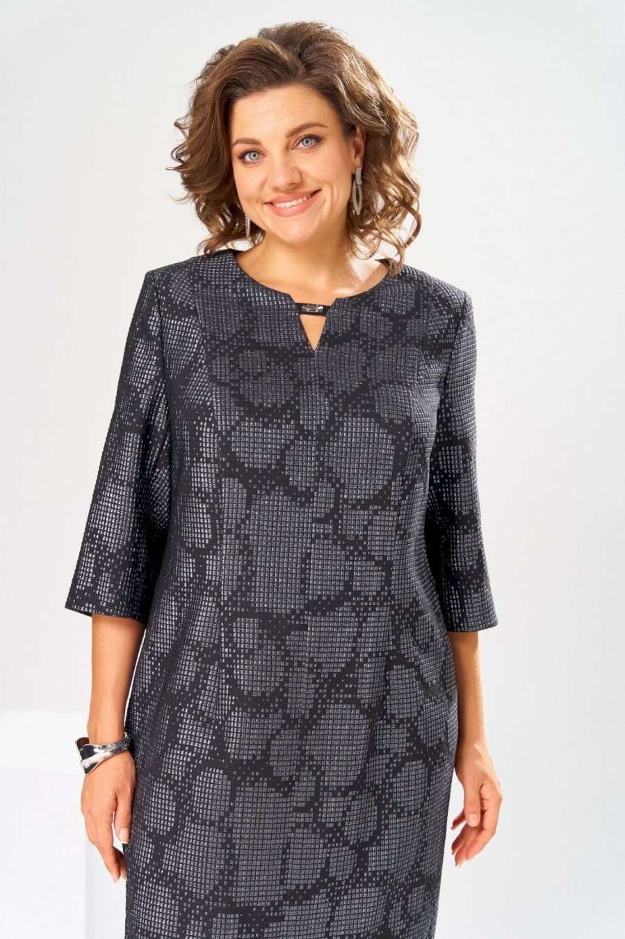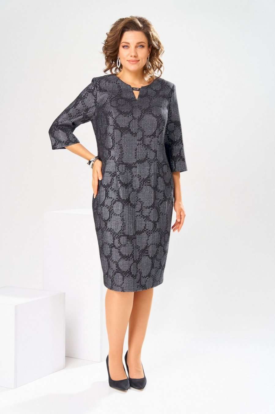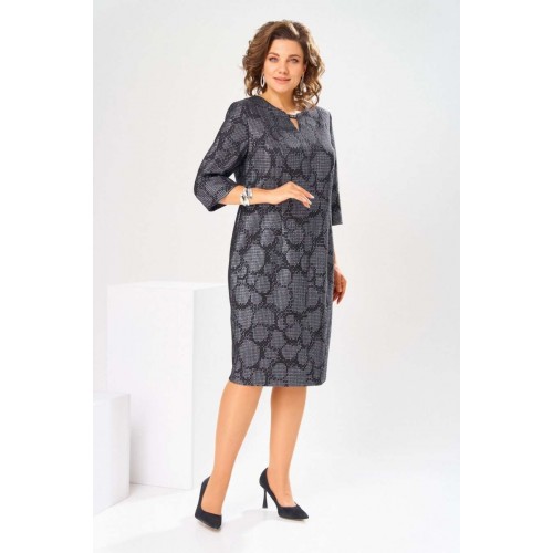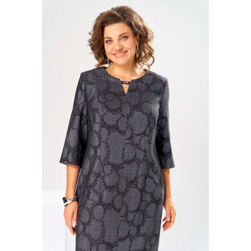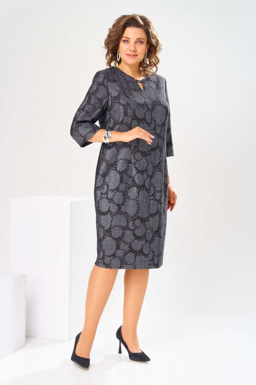 Платье относится к торжественно-нарядной одежде. Платье женское, полу прилегающего силуэта, длиной за колено. Перед с 2-мя рельефами, выходящими из плечевых швов и средним швом. Спинка с 2-мя таллиевыми вытачками и средним швом, заканчивающимся шлицей. Застёжка на потайную тесьму молнией в среднем шве спинки. Горловина круглая, обточная, без воротника с V-образным разрезом по переду, декорированным отделочной планкой, с пришивной стразой. Рукав во втачной, 2-х шовный, длиной 3/4. Платье на подкладке. Платье с плечевыми накладками. Длина платья по спинке 103 см, длина рукава 43,5 см.
