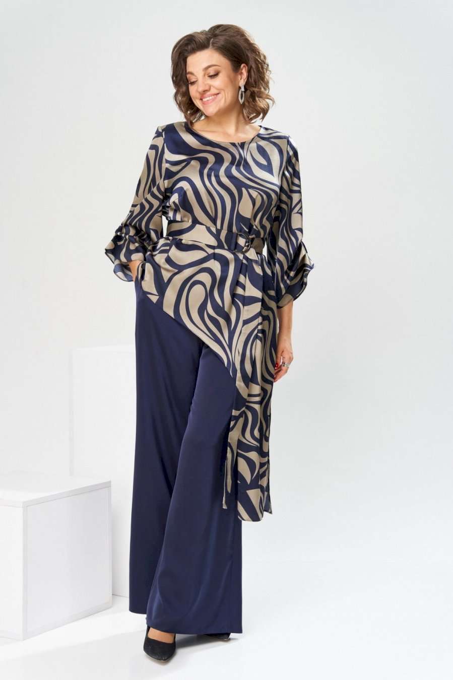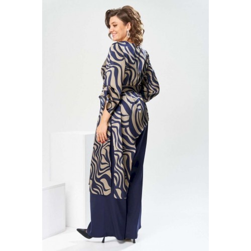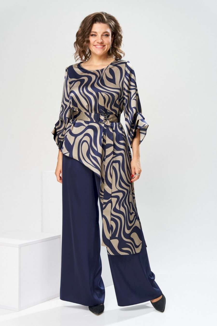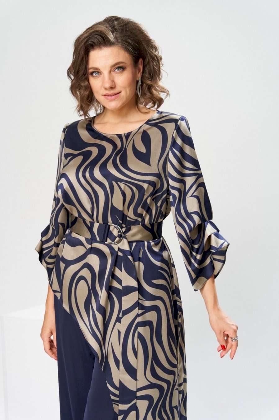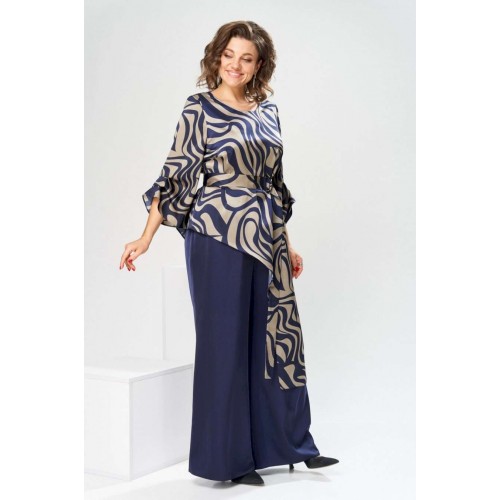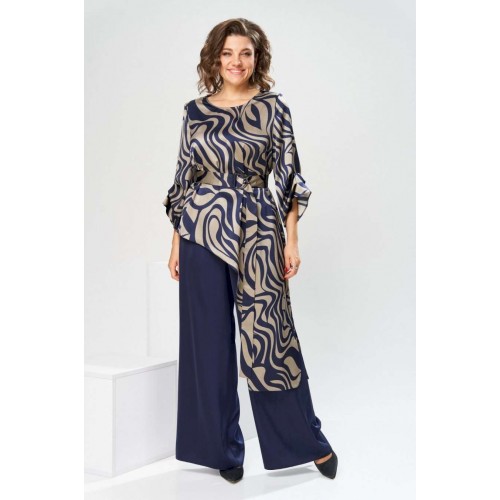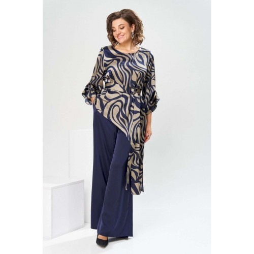 Костюм женский относится к торжественной одежде. Костюм женский 2-х предметный туника и брюки. Туника прямого силуэта, длиной до середины икры с ассиметричным подрезом переда и спинки. Перед с 2-мя нагрудными вытачками. Спинка цельнокроеная. Горловина круглая, обточная, без воротника. Рукав втачной, одно шовный, длиной 3/4, с 2-мя декоративными защипами, внизу шириной 3 см. Туника с плечевыми накладками. Брюки женские прямые длинные. Передние половинки с карманами в боковых швах. Задние половинки с таллиевыми вытачками. Брюки с притачным поясом, собранным на эластичную тесьму, закреплённую 2-мя отделочными строчками. К костюму прилагается съёмный пояс, фиксирующийся на металлическую пряжку. Длина брюк по боковому шву 105 см. Длина спинки туники 61 см, длина рукава 40,5 см.