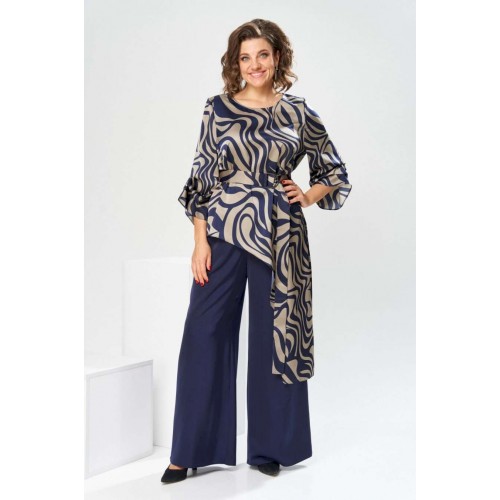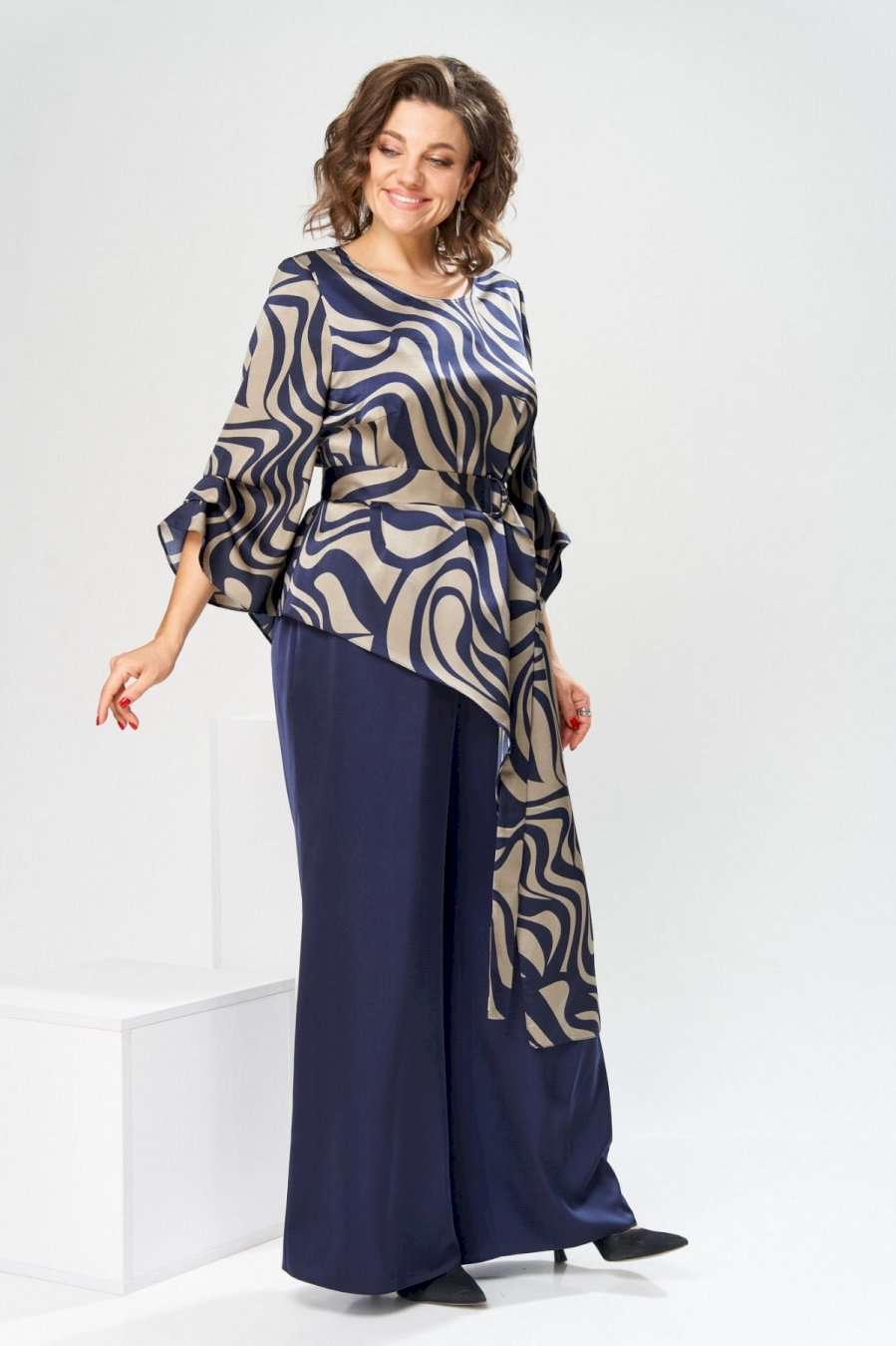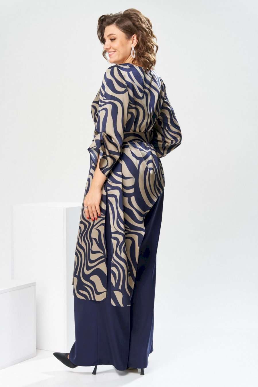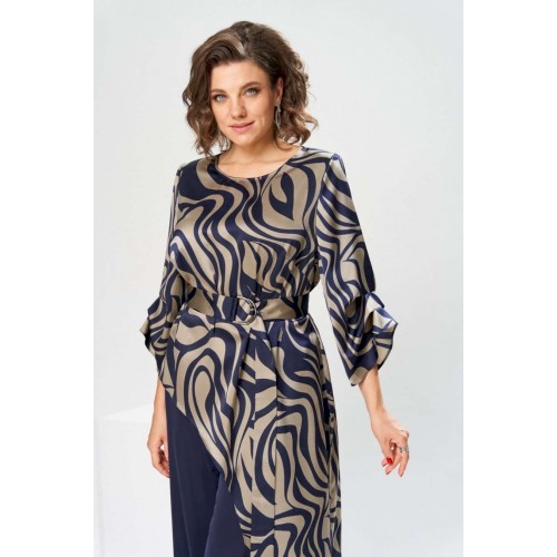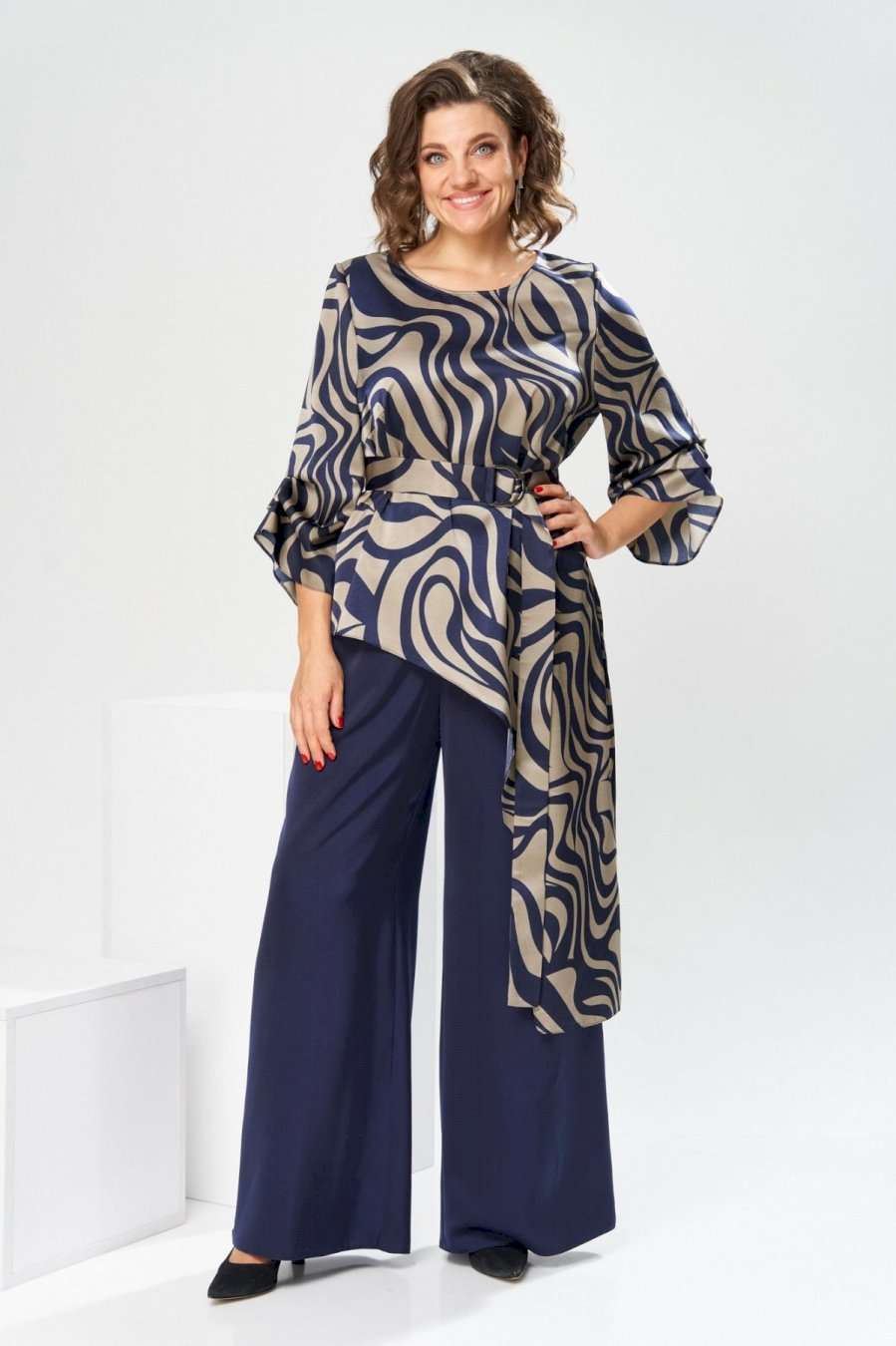 Костюм женский относится к торжественной одежде. Костюм женский 2-х предметный туника и брюки. Туника прямого силуэта, длиной до середины икры с ассиметричным подрезом переда и спинки. Перед с 2-мя нагрудными вытачками. Спинка цельнокроеная. Горловина круглая, обточная, без воротника. Рукав втачной, одно шовный, длиной 3/4, с 2-мя декоративными защипами, внизу шириной 3 см. Туника с плечевыми накладками. Брюки женские прямые длинные. Передние половинки с карманами в боковых швах. Задние половинки с таллиевыми вытачками. Брюки с притачным поясом, собранным на эластичную тесьму, закреплённую 2-мя отделочными строчками. К костюму прилагается съёмный пояс, фиксирующийся на металлическую пряжку. Длина брюк по боковому шву 105 см. Длина спинки туники 61 см, длина рукава 40,5 см.