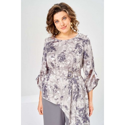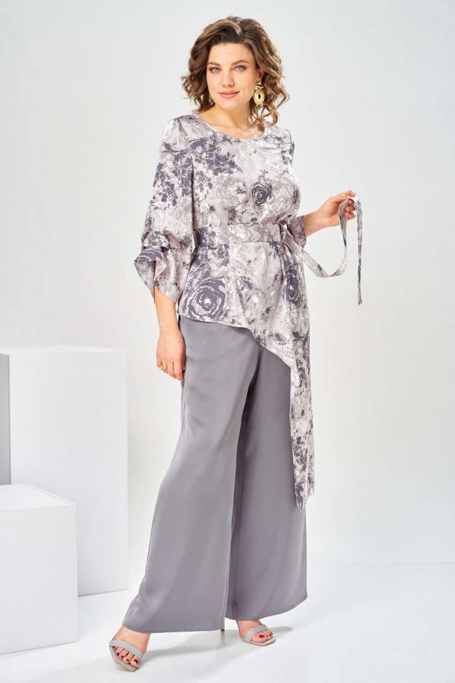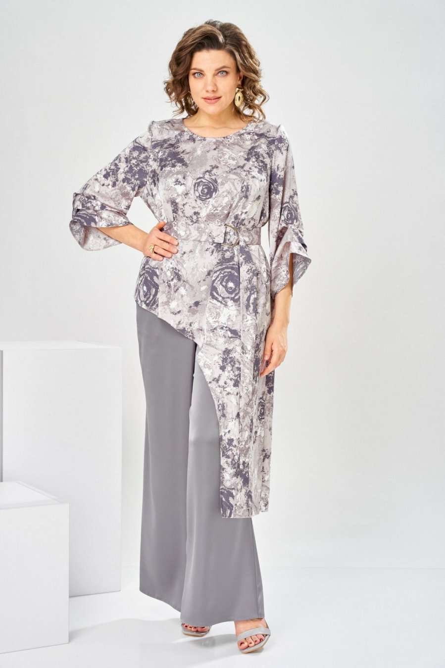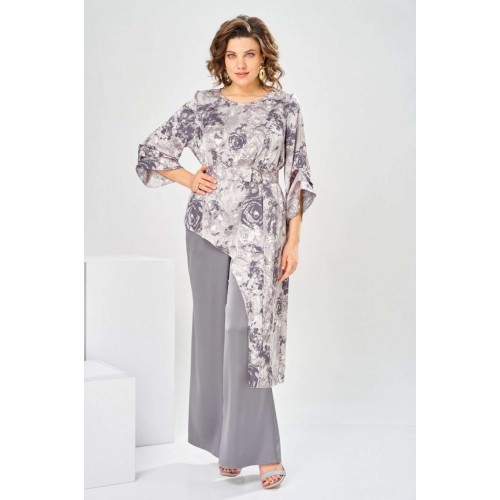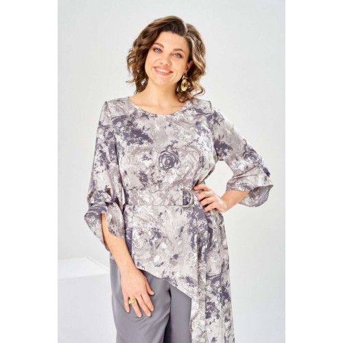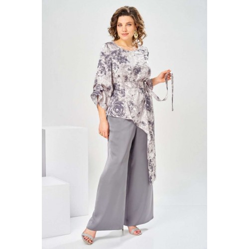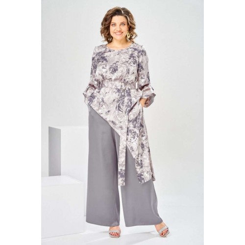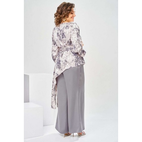Костюм женский относится к торжественной одежде. Костюм женский 2-х предметный туника и брюки. Туника прямого силуэта, длиной до середины икры с ассиметричным подрезом переда и спинки. Перед с 2-мя нагрудными вытачками. Спинка цельнокроеная. Горловина круглая, обточная, без воротника. Рукав втачной, одно шовный, длиной 3/4, с 2-мя декоративными защипами, внизу шириной 3 см. Туника с плечевыми накладками. Брюки женские прямые длинные. Передние половинки с карманами в боковых швах. Задние половинки с таллиевыми вытачками. Брюки с притачным поясом, собранным на эластичную тесьму, закреплённую 2-мя отделочными строчками. К костюму прилагается съёмный пояс, фиксирующийся на металлическую пряжку. Длина брюк по боковому шву 105 см. Длина спинки туники 61 см, длина рукава 40,5 см.