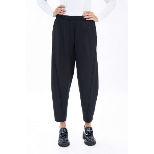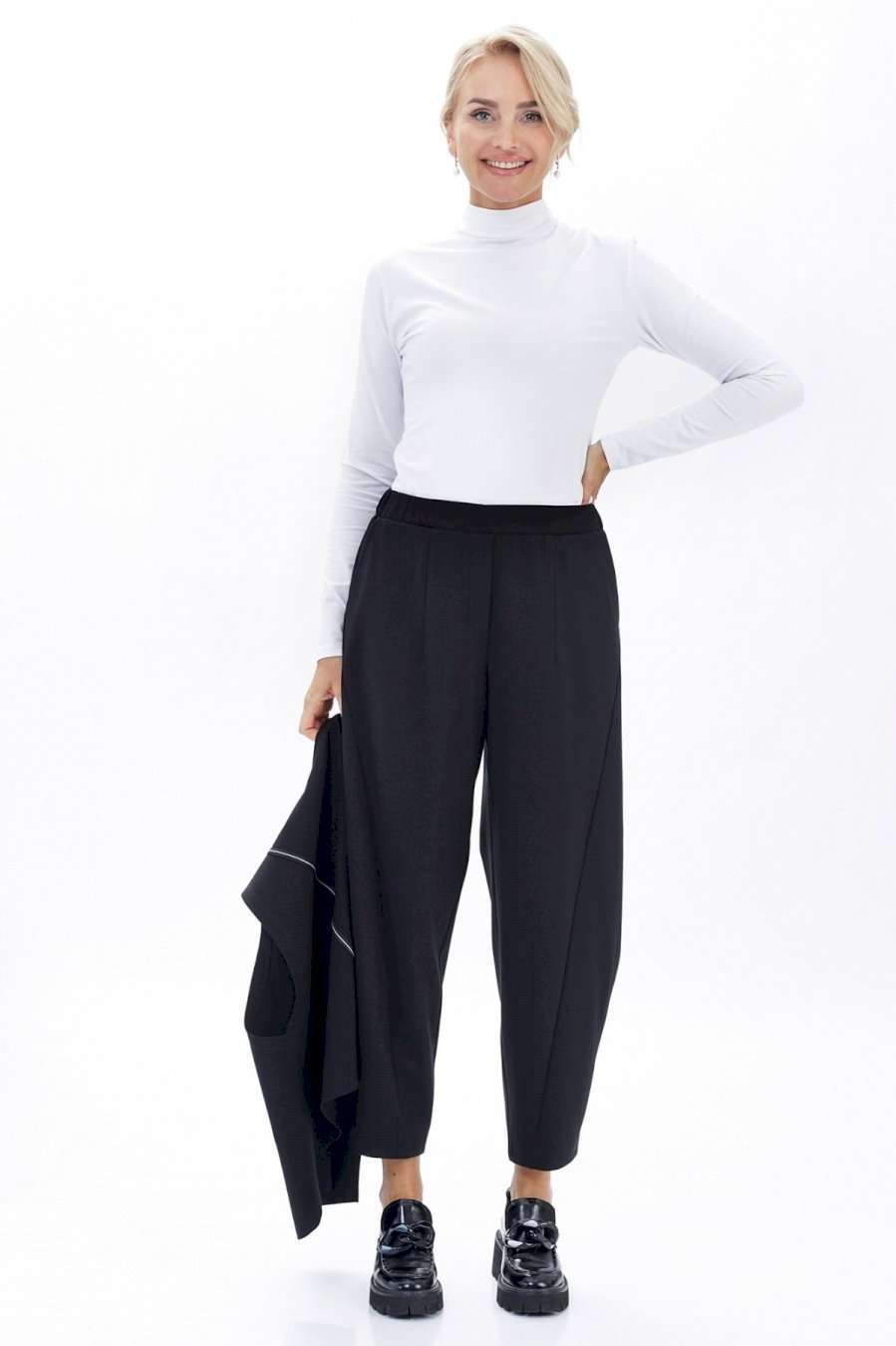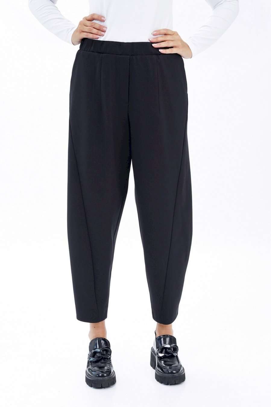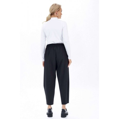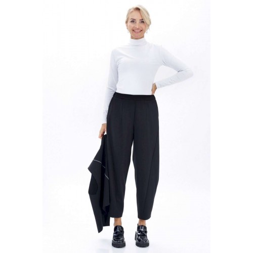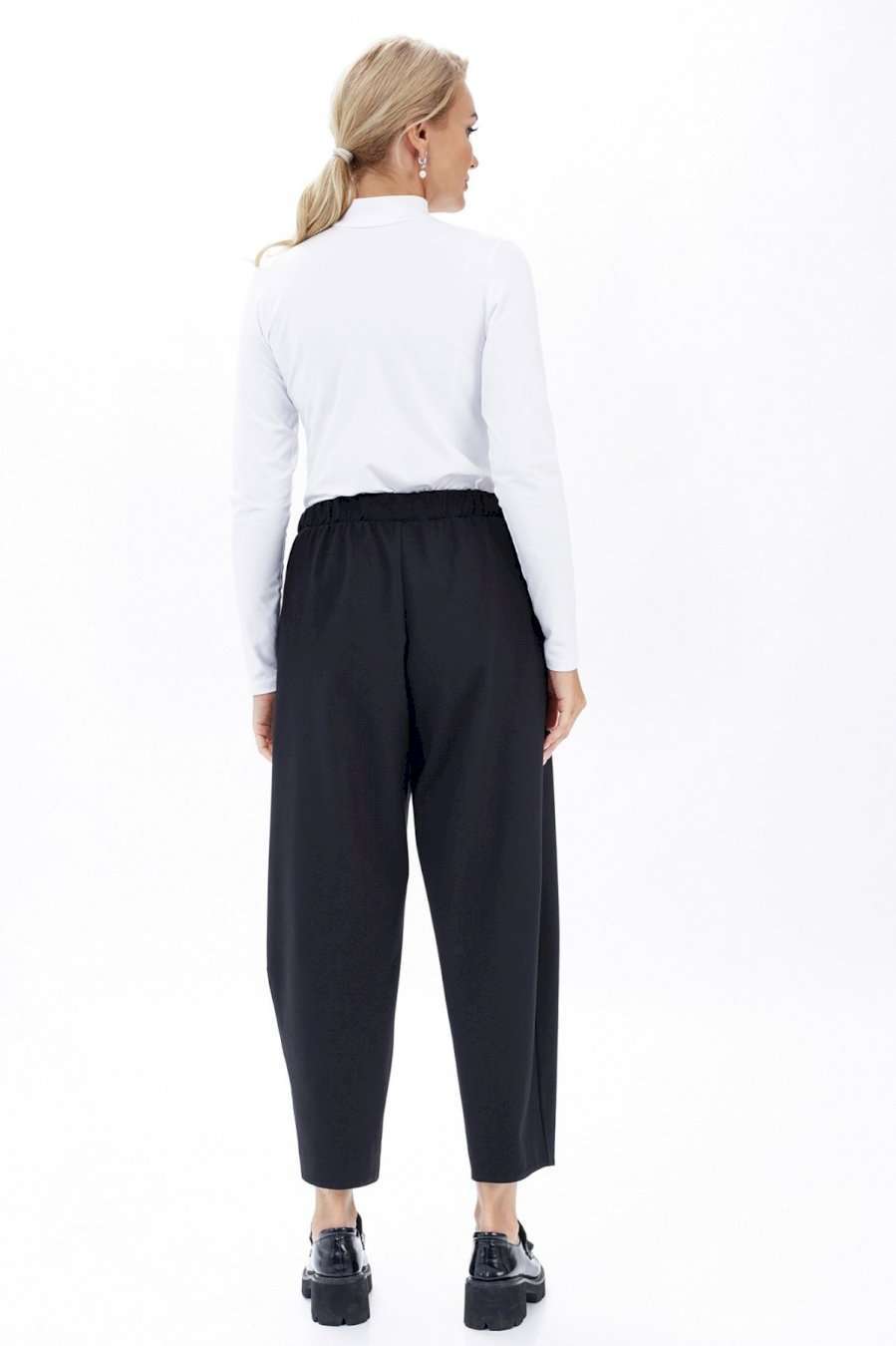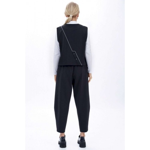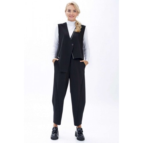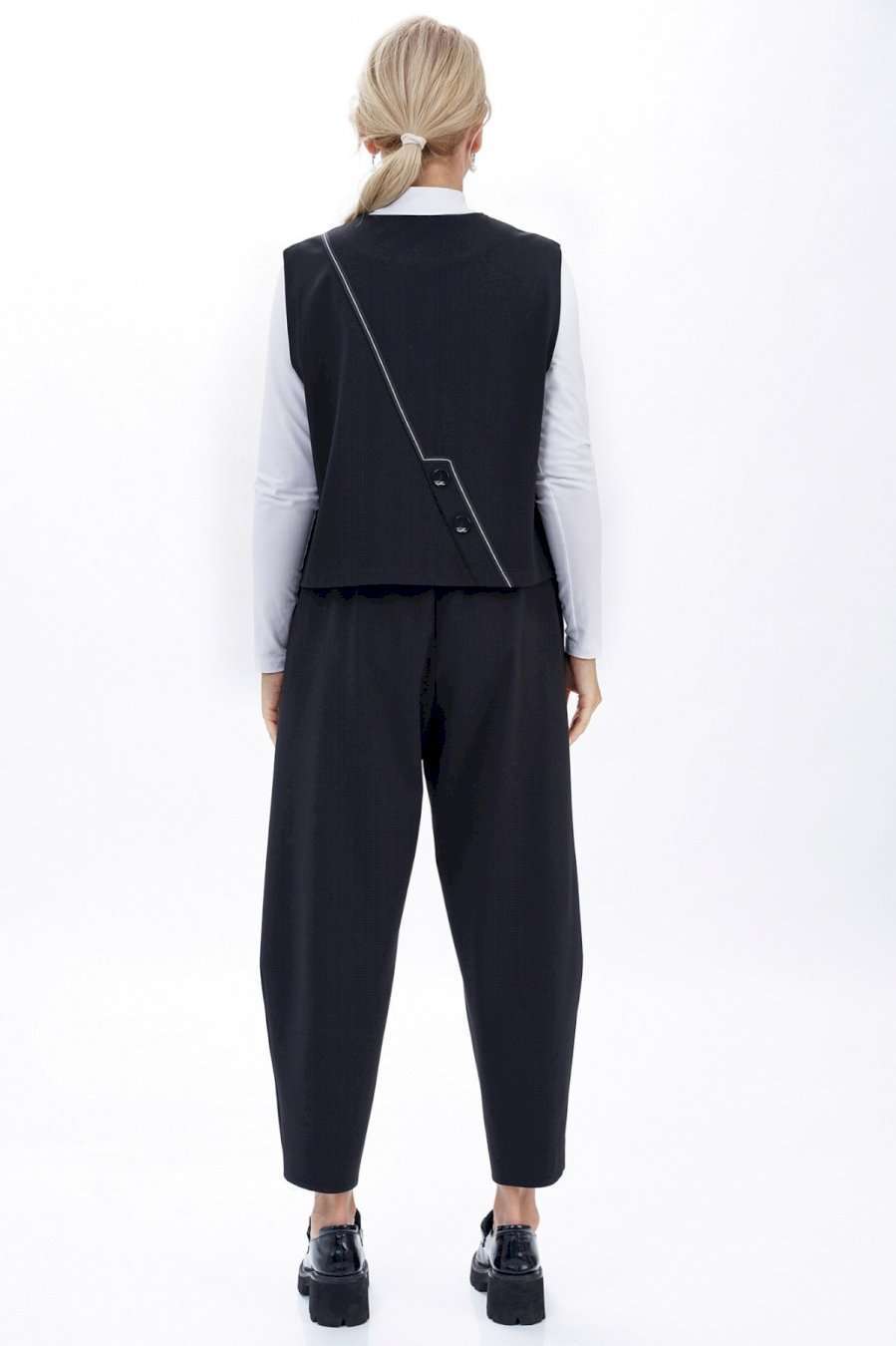 Комплект женский 3-х предметный состоит из жилета, блузы и брюк. Жилет прямого, свободного силуэта, с застёжкой на петлю, пуговицу, правая часть переда с фигурной линией низа и декорирована нашивкой. Спинка с рельефным швом понизу переходящий в закрытую шлицу с пришивными пуговицами. По левой части переда, по спинки отделочная тесьма. Блуза полуприлегающего силуэта, с втачными, одношовными, длинными рукавами. Воротник стойка. Брюки типа «банан», с притачным поясом на резинке, с имитацией застёжки типа «гульфик». С переходящими на перед фигурными боковыми швами, от линии низа по боковым конструктивные выточки. Низ обработан обтачкой. Передние части с косыми боковыми карманами и талевыми выточками.