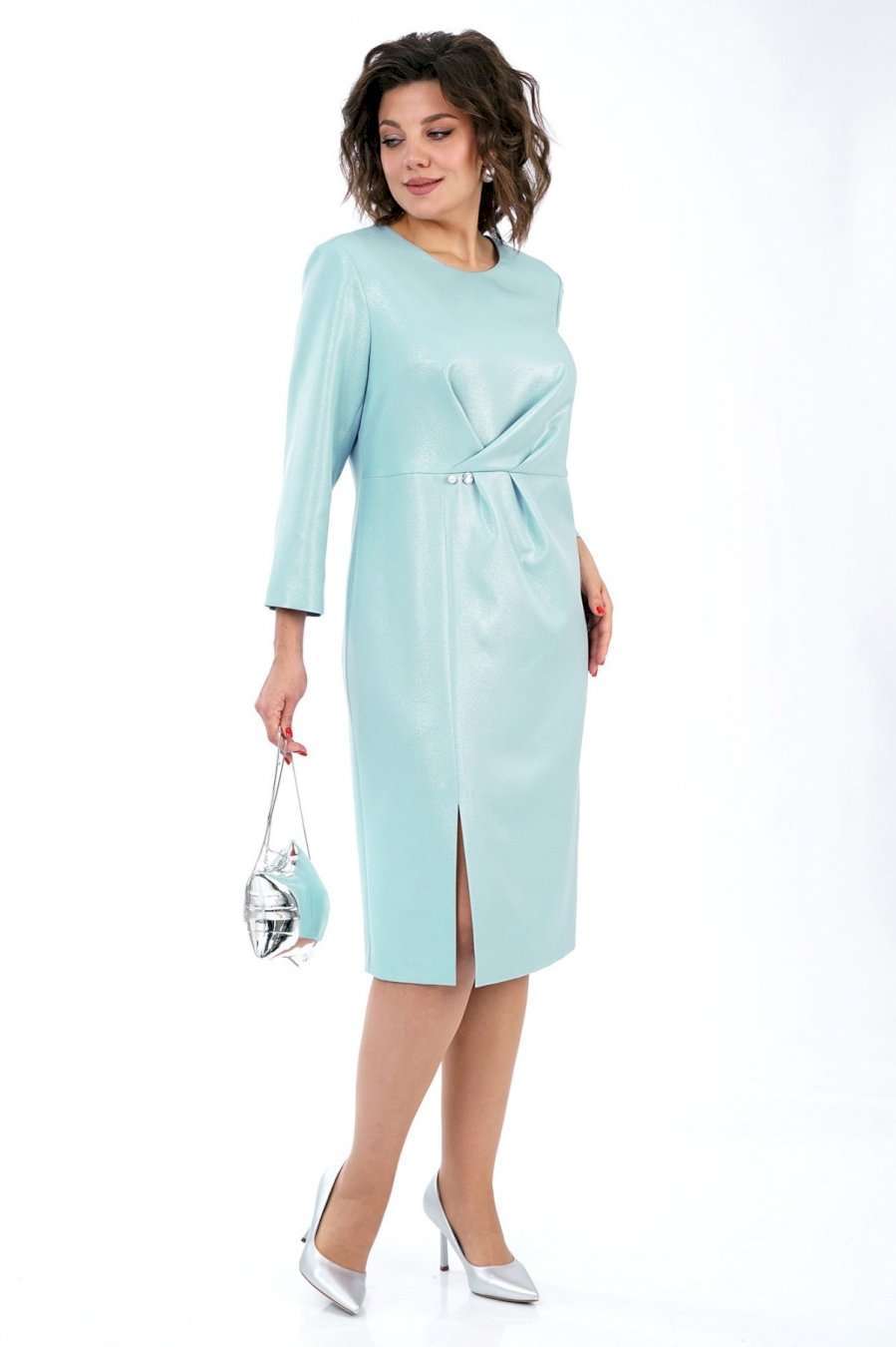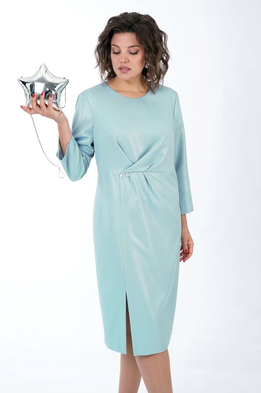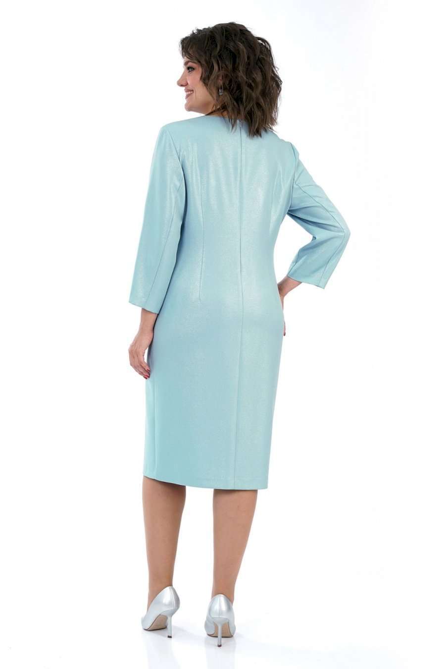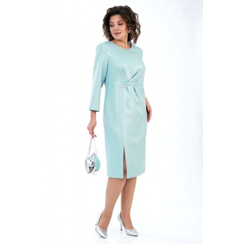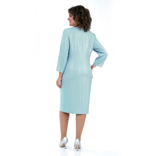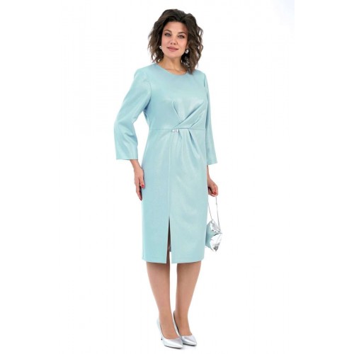 Платье полуприлегающего силуэта, на подкладке, с застёжкой на потайную молнию в среднем шве спинки. Перед отрезной по линии талии, по шву с мягкими складками декорированный съёмным украшением. Нижняя часть по правой стороне с рельефным швом заканчивающийся разрезом. Спинка с талевыми выточками. Рукава втачные, двухшовные, длиной ¾.