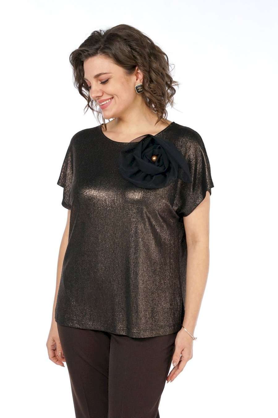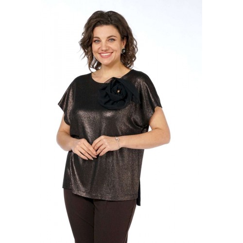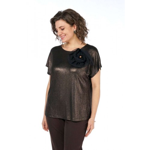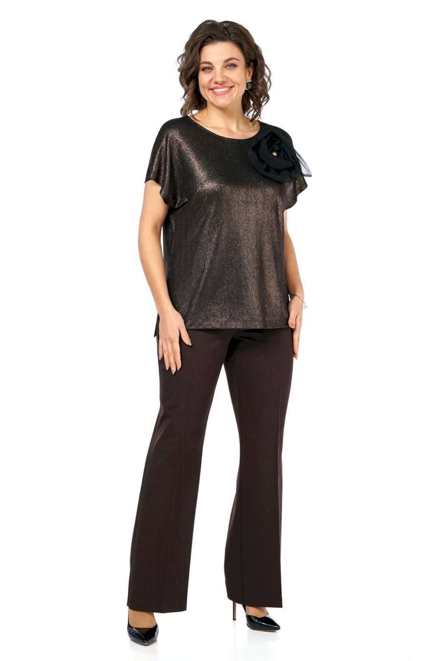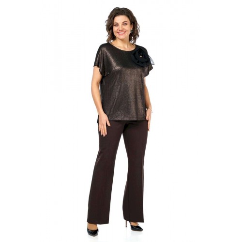 Блуза женская прямого, свободного силуэта, со спученной линией плеча, с разно-уровневым низом (спинка длиннее на 4,0см), по боковым с разрезами. Декорирована съёмным украшением. Брюки женские длинные, типа «клёш» прилегающего силуэта по бёдрам и от линии колена идут на расширение, со сгибом, на притачном поясе, застежка типа «гульфик» на молнию и по краю пояса на петлю и пуговицу. Задние части с талевыми выточками.