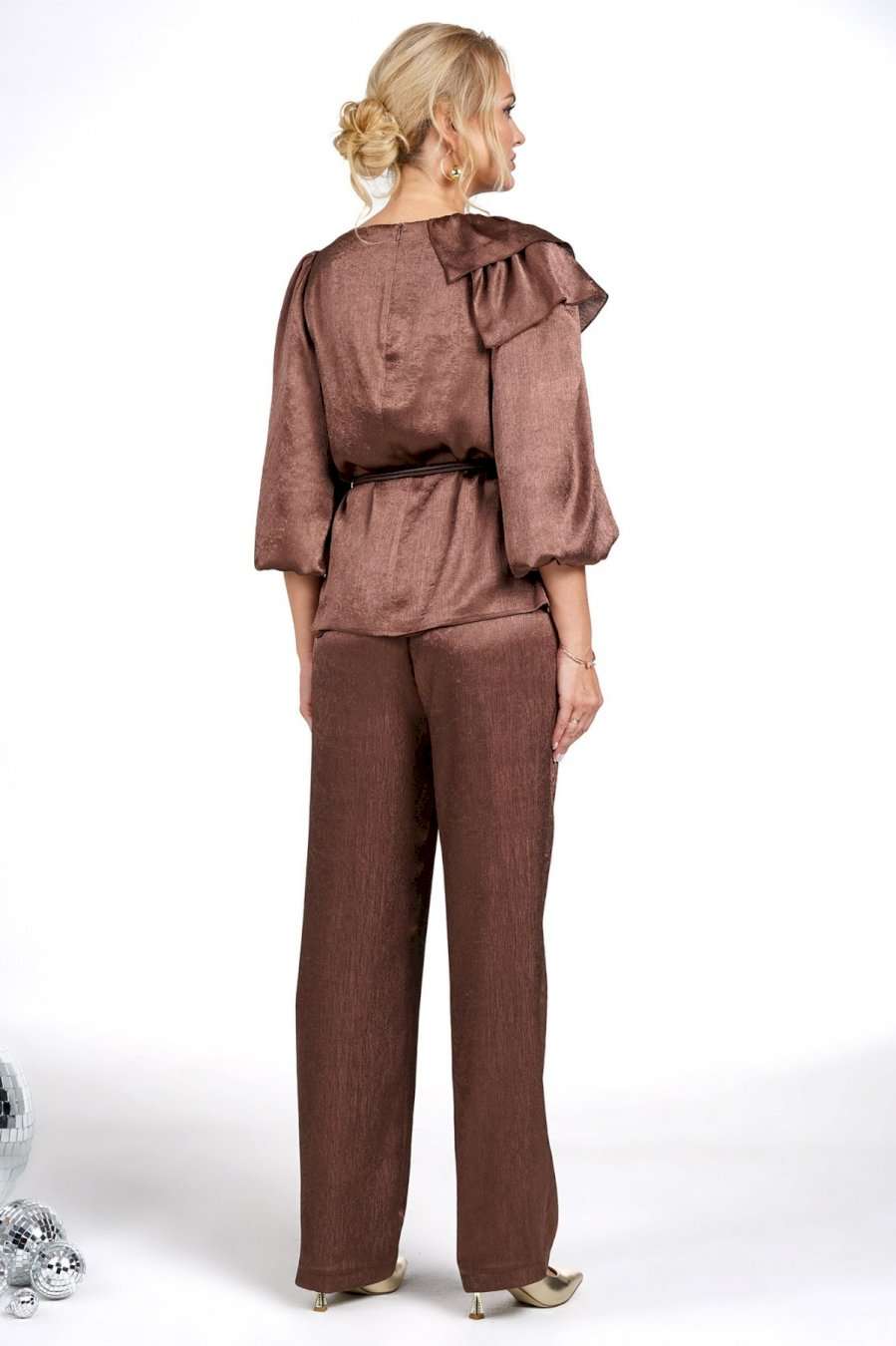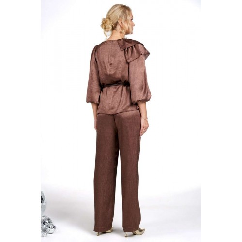 Комплект женский 2-х предметный состоит из блузы, брюк. Блуза прямого силуэта, с застёжкой на потайную молнию в среднем шве спинки в дополнении ремень. Перед с нагрудными выточками и рельефным швом, декорированный воланами. Рукава на подкладке, втачные, одношовные, длиной 3/4, понизу объёмной формы, по окату и низу со сборкой. Брюки прямого силуэта, с притачным поясом на резинке. Передние части с косыми боковыми карманами.