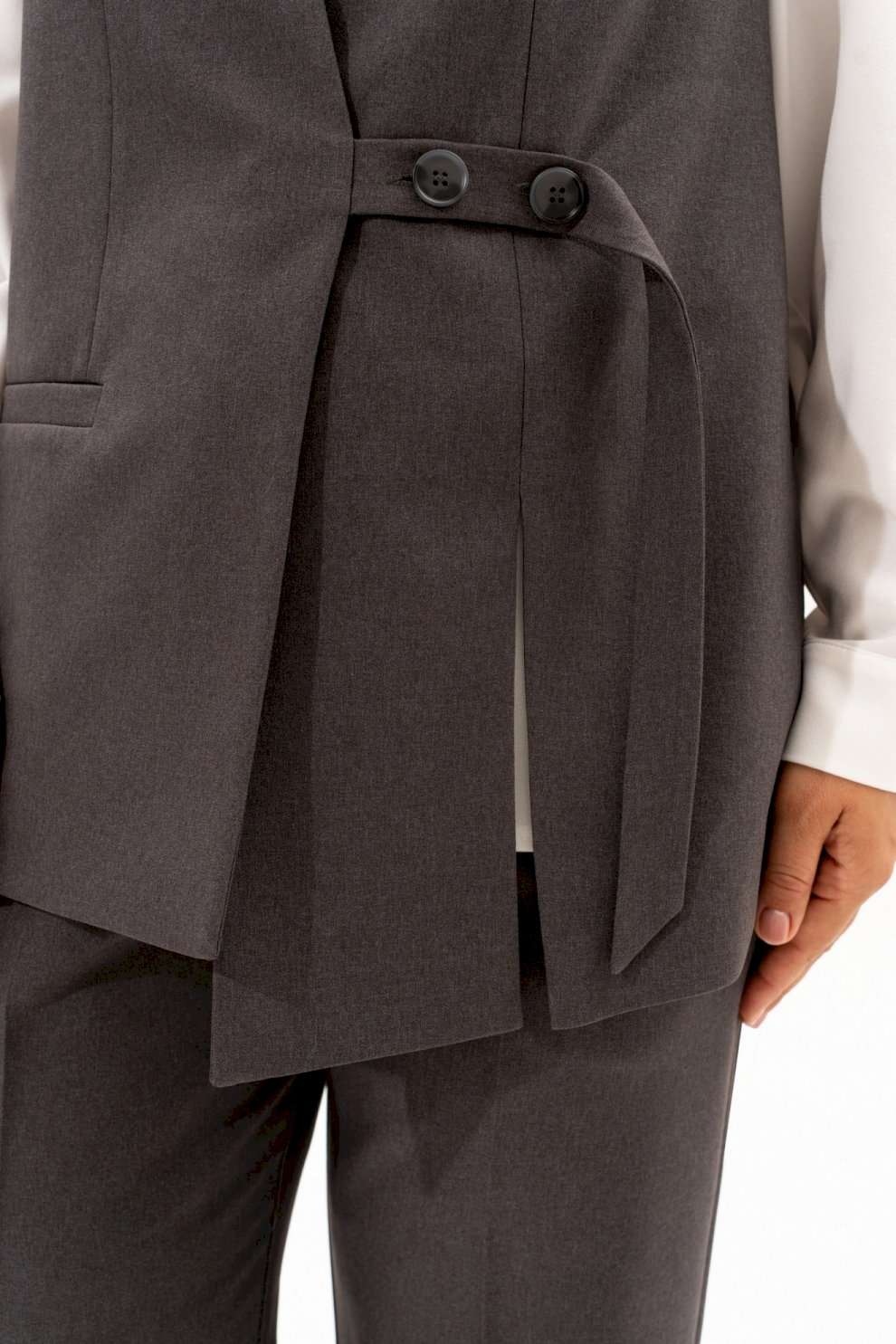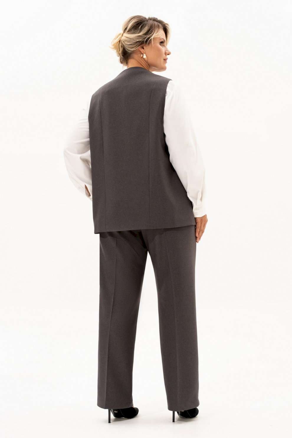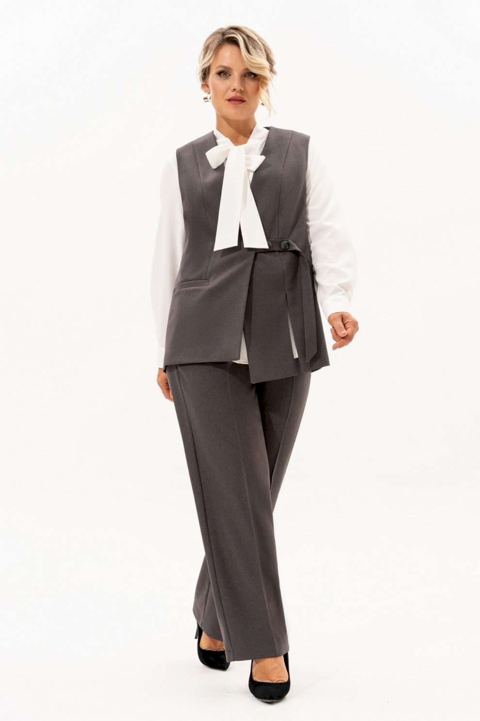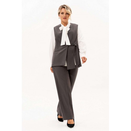 Костюм женский классический это идеальное решение для Вашего гардероба. Комплект состоит из двух предметов - прямые брюки с высокой посадкой прямого кроя на молнии и на резинке, с боковыми карманами сочетаются с любыми базовыми вещами. Универсальный классический жилет с V-образным вырезом горловины превосходно садится по фигуре, на правой полочке обработан прорезной карман с листочкой, на левой разрез , застежка обработана на отлетном хлястике ,на петлю и пуговицу. Этот элемент делает его более интересным. Жилет на подкладке . Ассиметричный жилет можно одевать поверх тонкой одежды. Базовый брючный костюм идеален для повседневного образа на работу в офис,школу, а при нарядной блузке комплект превращается в нарядный. Современный костюм также будет хорошо смотреться как вечерний наряд на различные мероприятия, праздники, день рождения, корпоратив. Шикарный нарядный станет незаменимым в Вашем гардеробе . Этот костюм подчеркнет Вашу уверенность и стиль.