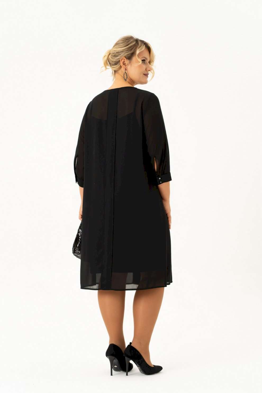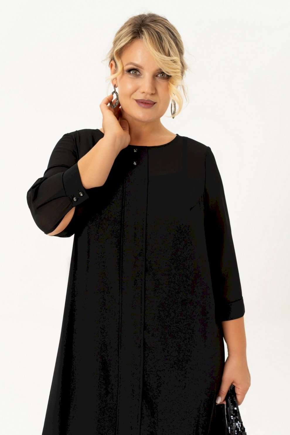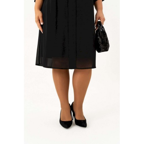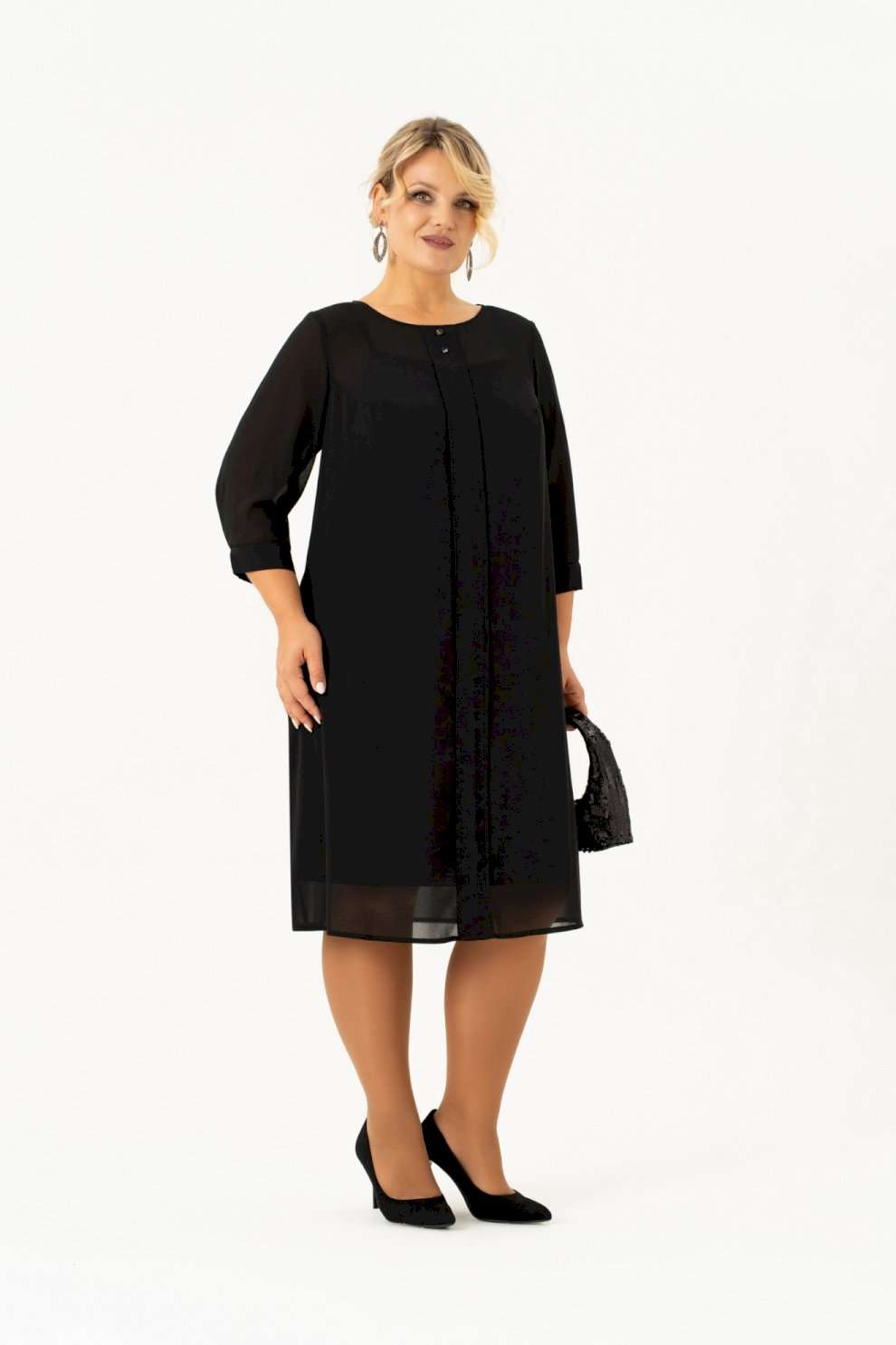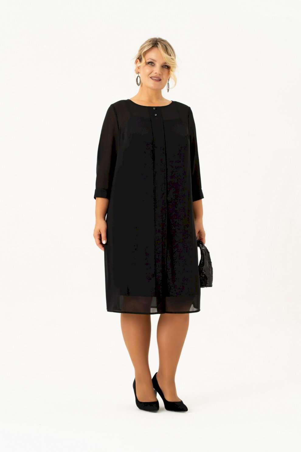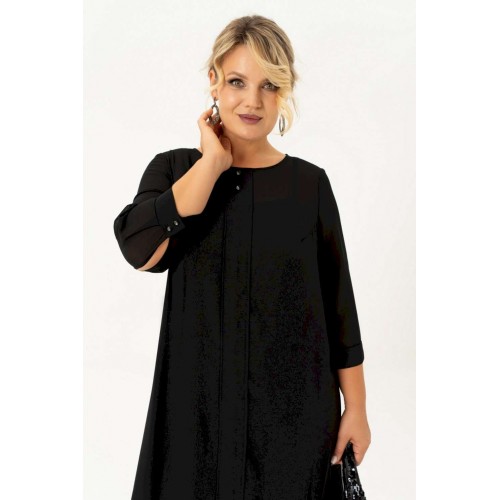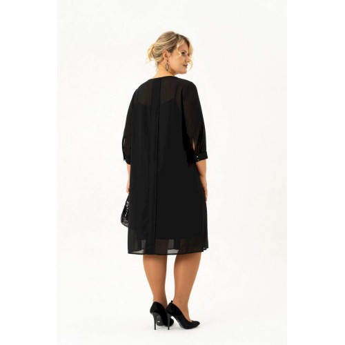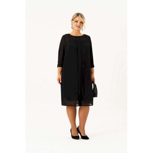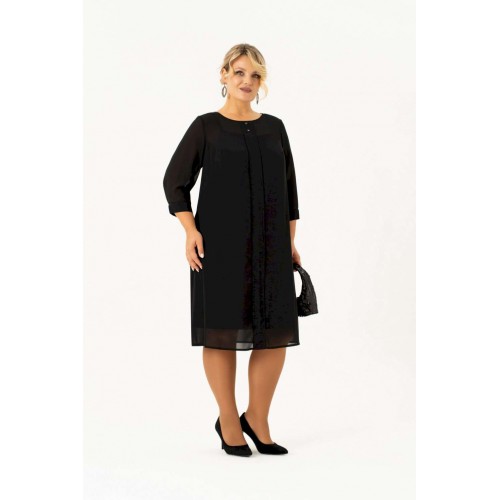 Нарядно повседневное, универсальное, элегантное черное платье с рукавом длиной ¾ на манжете и отдельным подкладом поможет Вам в создании абсолютно разных образов. Платье имеет классический прямой крой с бантовыми складками по переду и по спинке, которые добавляют романтичность и элегантность. Платье подойдет как высоким, так и невысоким женщинам, благодаря своей миди длине. Верхнее платье выполнено из шифона, горловина декорирована пуговицами. Нижнее платье из ткани \"масло\" на бретелях. Это платье Вы можете легко использовать как вечернее, платье для прогулки или на свидание, на день рождения или клуб, для фотосессии или романтического вечера. Такое платье будет уместно в любом гардеробе. Длина изделия (см): 106 Длина рукава (см): 47