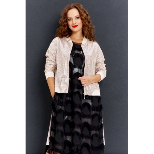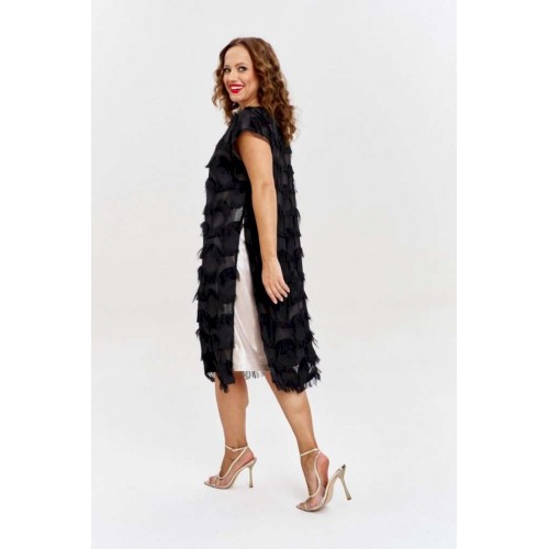 Двухслойное платье из жаккарда на шифоновой основе с бахромой, прямого силуэта, спущенным рукавом и круглой горловиной. По бокам высокие разрезы, на переде ажурная нашивка. Нижнее платье из золотистого трикотажа, без рукава, с карманами по бокам.