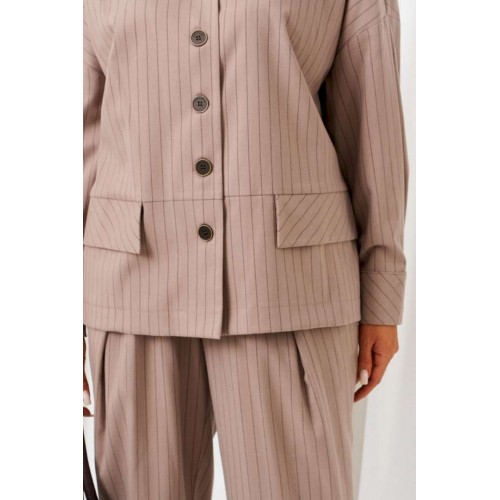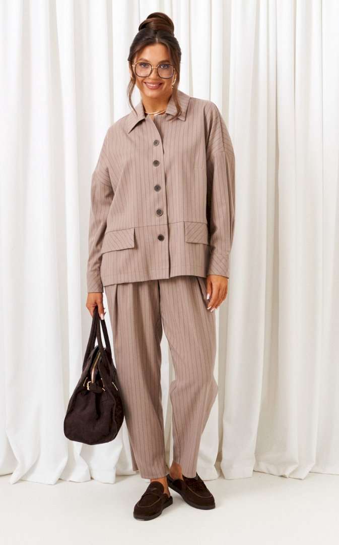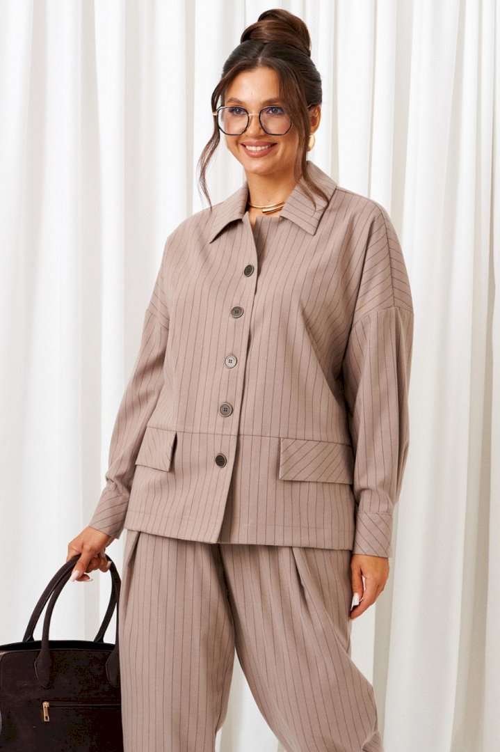 Стильный повседневный женский костюм в винтажном стиле, дополненный акцентными деталями, весьма актуален в будущем сезоне. Предметы костюма можно смело комбинировать по отдельности с другими вещами гардероба. Костюм состоит из 2-х предметов одежды: рубашки и брюк. Выполнен из костюмной ткани стильного дизайна в полоску. Рубашка прямого силуэта свободного кроя. Перед из двух симметричных деталей с нагрудными вытачками от бокового шва, с подрезами ниже уровня талии, в которые вставлены отделочные клапаны. Спинка цельная. Рукав рубашечный одношовный длинный, заканчивается притачной манжетой с застежкой на две петли и пуговицы. Застежка передняя центральная на прорезные петли и пуговицы. Воротник отложной с отрезной стойкой. Брюки свободного силуэта расширенные вверху и слегка зауженные к низу, длиной до щиколотки, с двумя верхними боковыми карманами и двумя заложенными глубокими складками от пояса спереди. Высота сиденья классическая. Брюки на притачном поясе, по кругу которого вставлена резинка