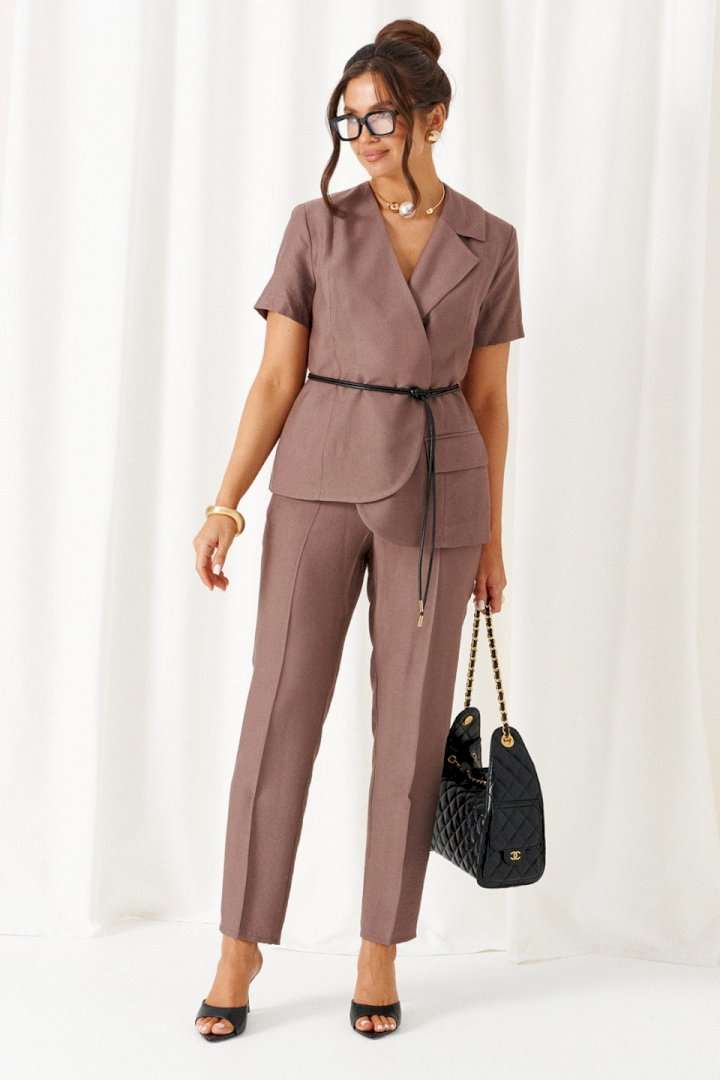 Женский льняной костюм с акцентными деталями и эффектные оттенки! Созданный отличительным кроем с подчеркнутыми деталями, костюм задаст уверенное настроение образу и подчеркнет индивидуальность при любом случае выхода. Выразительный костюм состоит из жакета и брюк, выполнен из мягкой смесовой ткани с натуральными волокнами льна и вискозы, практичен в носке. Жакет полуприлегающего силуэта, двубортный, асимметричный разноуровневый. На подкладке. Передняя часть из двух половинок, с вертикальными рельефами от плеча. На левой полочке расположен прорезной нижний карман с обтачкой и клапаном, вырез горловины оформлен пиджачным воротником с лацканом. Правая полочка укорочена и без дополнительных элементов. Спинка со средним швом и с вертикальными рельефами от плеча. Правый рельеф заканчивается функциональным разрезом-шлица. Рукав втачной, одношовный короткий. Застежка смещенная на потайные петли и пуговицы. Низ борта округлый. Дополнительным элементом служит декоративный пояс. Брюки длинной до щиколотки, слегка заужены к низу. Посадка классическая. Застежка центральная на молнию и на петлю с пуговицей на поясе. Спереди расположены боковые функциональные карманы. Пояс притачной, сзади на резинке, шириной 4см. длина жакета (по среднему шву спинки) – 65-66 см. длина рукава жакета – 21,5 см длина брюк (по боковому шву с поясом) – 100 см.