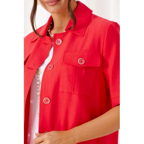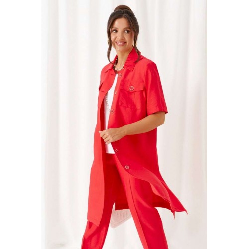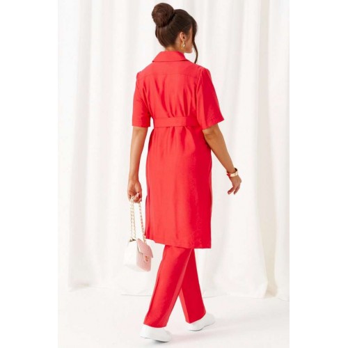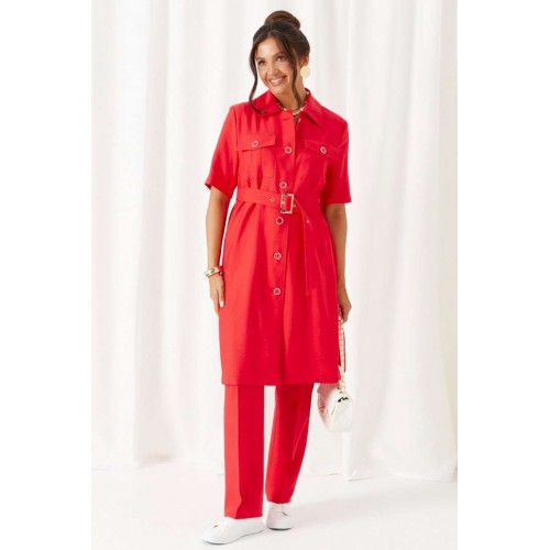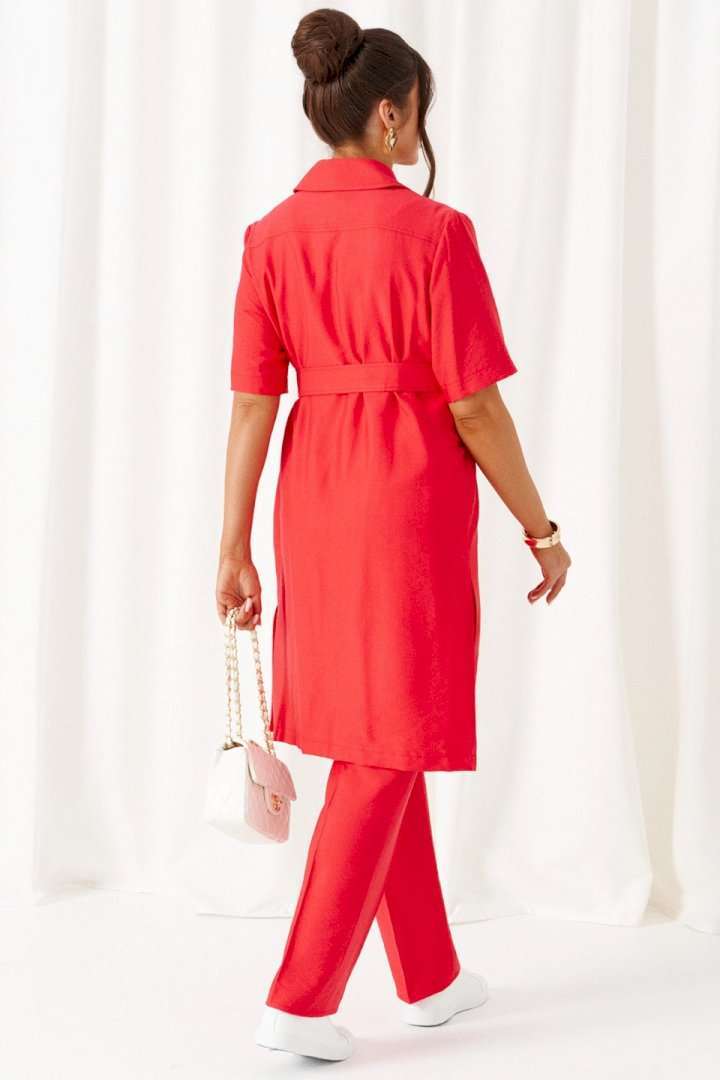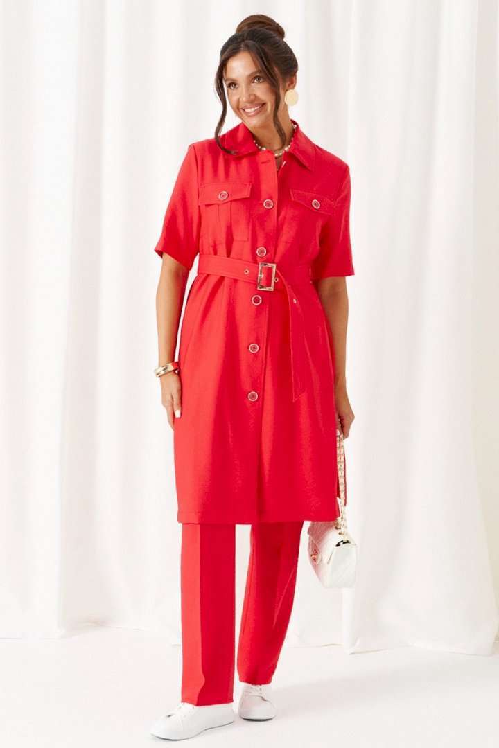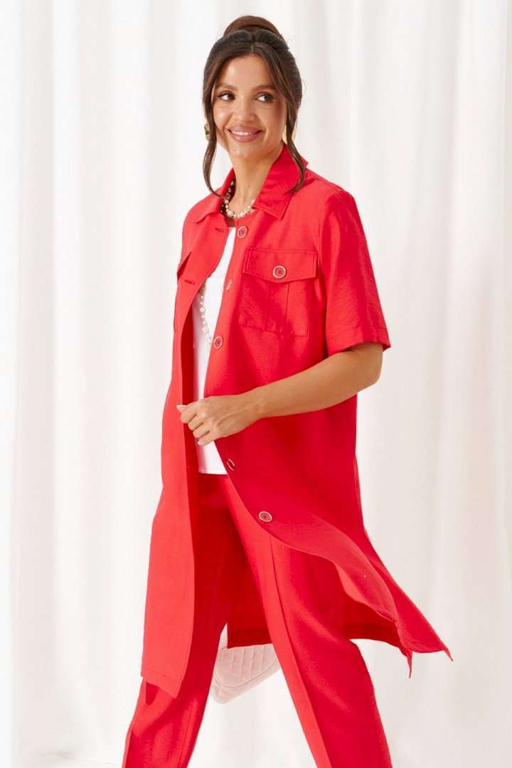Универсальный комплект из блузки, брюк и топа – изделие вне времени и трендов, созданное в различных интерпретациях: от оверсайза до классики. Выполнен из смесового полотна с содержанием натуральных волокон – льна и вискозы, предназначен для повседневного и выходного использования. Найдет применение в жаркую и прохладную летнюю погоду. Блузка удлинённая, свободного силуэта. Передняя часть распашная с нагрудными вытачками от бокового шва. Вверху расположены функциональные накладные карманы с клапанами. Спинка с кокеткой в верхней части. Рукав одношовный втачной длиной до локтя, свободный. Воротник стояче-отложной на стойке. Застежка центральная на петли и пуговицы. Низ изделия ровный, в боковых швах предусмотрены высокие разрезы. Топ полуприлегающего силуэта. Перед цельный, с двумя нагрудными вытачками от бокового шва. Спинка со средним швом, оформленным у горловины разрезом с фиксацией на навесную петлю и пуговицу. Горловина округлой формы. Брюки длинные, умеренной ширины. Посадка классическая. Спереди расположены боковые функциональные карманы. Застежка центральная на молнию и петлю с пуговицей на поясе. Пояс притачной, сзади на резинке, шириной 4см. Длина блузки (по середине спинки) ~ 100 см. Длина рукава блузки (от плечевой до низа) ~ 30 см. Длина топа (по среднему шву спинки) ~ 62 см. Длина брюк (по боковому шву с поясом) ~ 107 см.