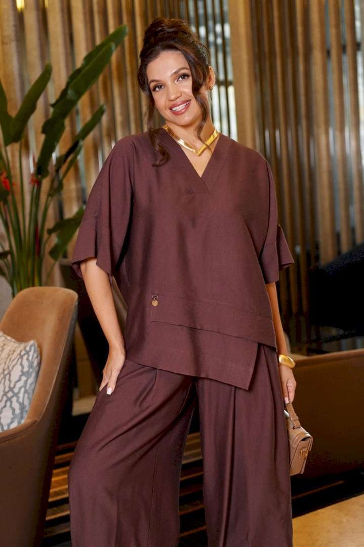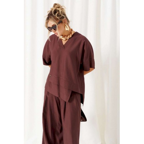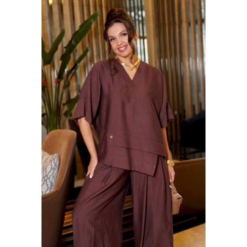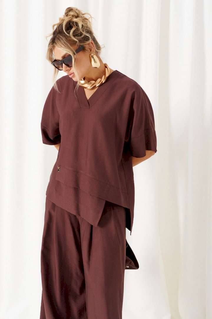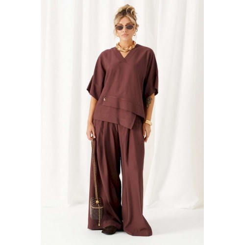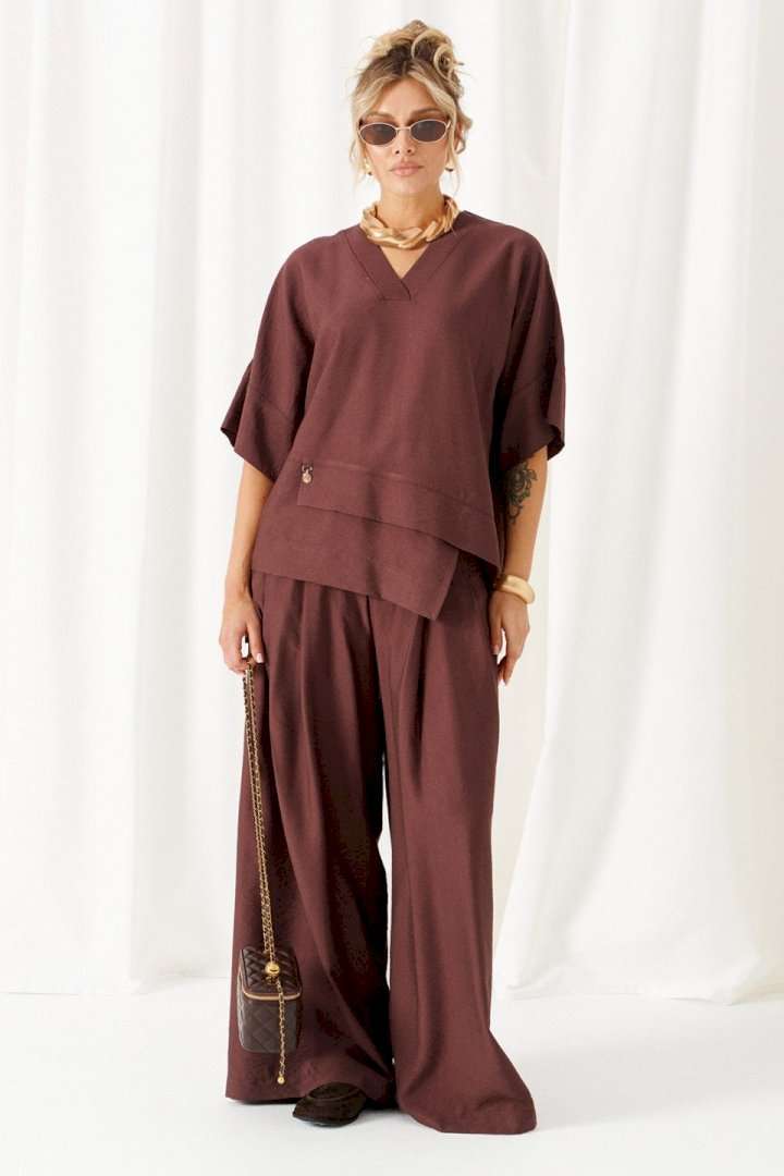Женский льняной костюм из смесовой ткани с натуральным составом, с акцентными деталями и в безупречных любимых оттенках. Созданный в расслабленном крое с подчеркнутыми линиями, костюм позволит чувствовать себя комфортно и непринужденно. Стильный костюм состоит из блузона и брюк, выполнен из мягкой ткани с волокнами льна и вискозы, практичен в носке. Блузон свободного силуэта, цельнокроеного покроя с удлиненной линией плеча. Передняя часть цельная, с асимметричным подрезом, который оформлен разноуровневыми деталями-планками. Спинка цельная, чуть длиннее переда. Вырез горловины V-образный, обработан планками. Линия плеча удлиненная, спущенная, переходящая в цельнокроеный рукав, который заканчивается притачной манжеткой. Низ неровный, по боковым участкам выполнены разрезы. Брюки длинные, прямые свободные. Посадка стандартная, на поясе. Спереди выполнены карманы с обтачкой и заложены глубокие складки от пояса и от кармана. Сзади вытачки. Застежка центральная на молнию и на петлю с пуговицей на поясе. Пояс притачной, шириной 4см с эластичной тесьмой по заднему участку. длина блузона (по среднему шву спинки) - 75 см. длина брюк (по боковому шву с поясом) – 110 см.