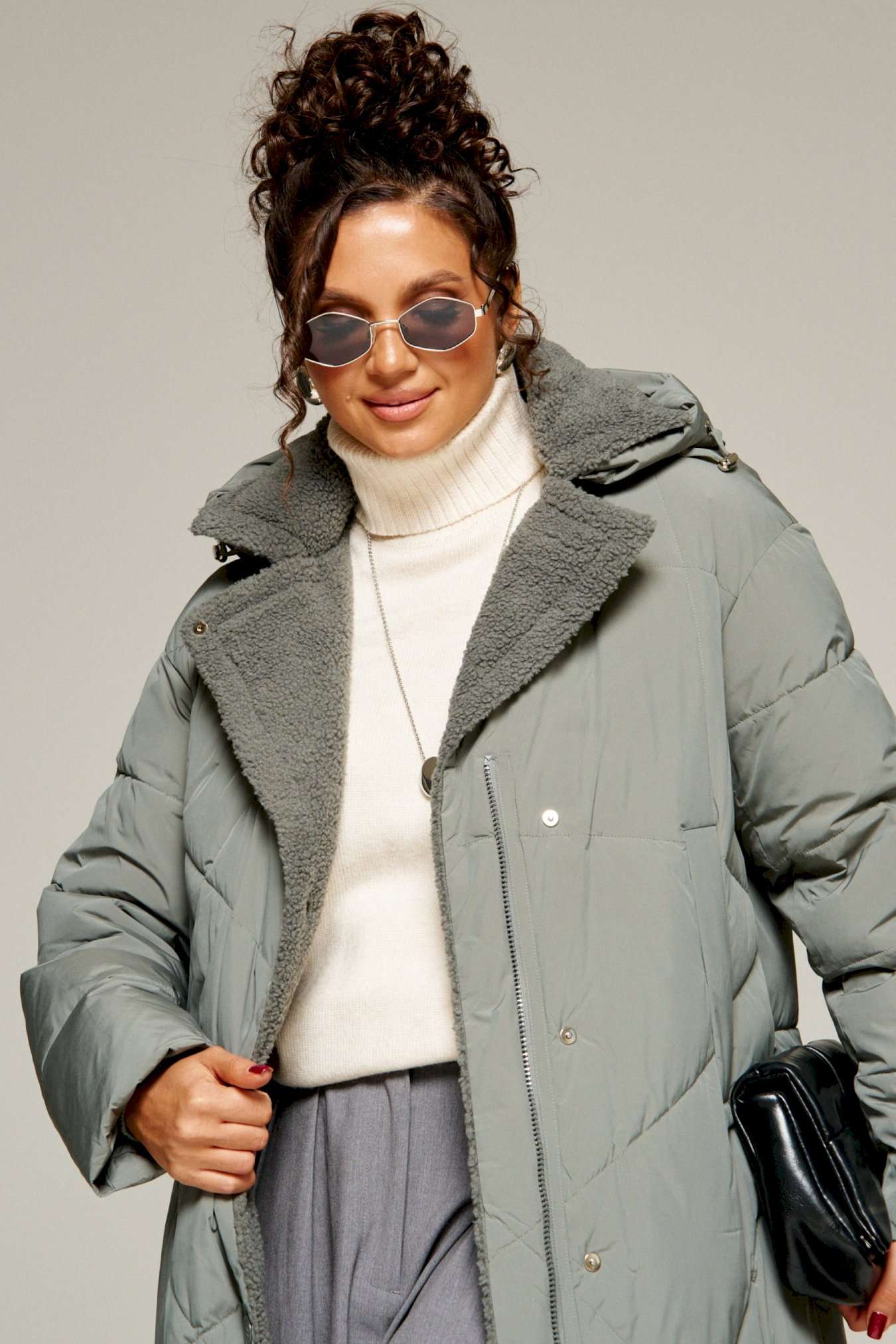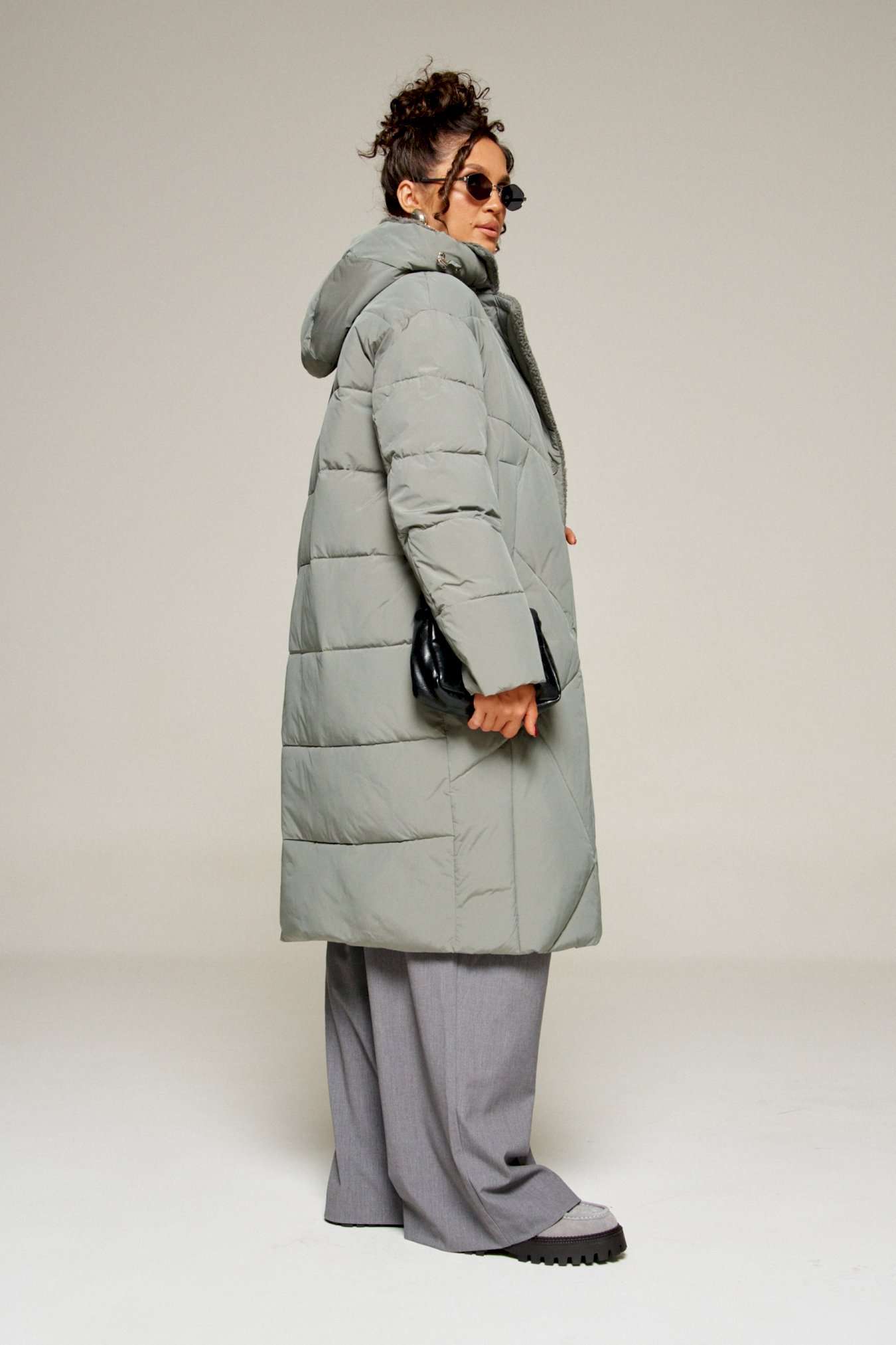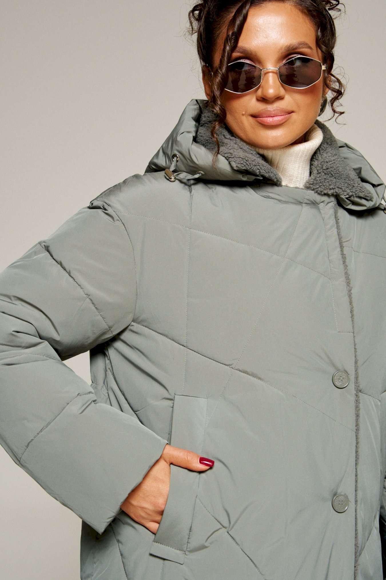 Наше теплое пальто— идеальный выбор для инвестиции в гардероб. Силуэт эффектно подчёркивает фигуру, а в меру свободный крой не сковывает движений. Благодаря качественному утеплителю пальто отлично согревает, а его цветовая гамма отвечает всем актуальным направлениям моды. Пальто выполнено из прочной, влагостойкой и приятной на ощупь полиэстерной ткани; на синтетической подкладке. Утеплитель холлофайбер 200 г/м. кв. предназначен для использования изделия при температурном режиме от -10 до -20 градусов. Модель прямого силуэта, базового кроя; предназначена для повседневной носки. Перед асимметричный. С правой стороны расположены кокетка и вертикальный подрез от неё. В кокетку вставлена декоративная молния и клапан с пришивным отделочным элементом. На центральной правой части переда расположен боковой прорезной карман с обтачкой. С левой стороны – два вертикальных рельефа: от плеча (в который вставлена часть молнии) и от проймы, а также боковой прорезной карман на молнии с декоративным фиксатором. Центральные части переда выполнены из отделочной стеганой ткани с блеском аналогичного оттенка с цветом изделия. Спинка с широкой кокеткой, заканчивающейся мягкой складкой и двумя боковыми вертикальными рельефами от кокетки. Рукав втачной длинный двухшовный. По низу внутри рукава предусмотрена дополнительная вставка в виде притачной трикотажной манжеты. Капюшон умеренного объема, застегивающийся спереди. По периметру капюшона вставлен шнур с декоративными фиксаторами. Застежка смещенная на двустороннюю молнию от верха до низа. Низ изделия ровный. Для удобства движения внизу в боковых швах предусмотрены небольшие разрезы. Подкладка гладкая с наличием внутреннего кармана слева. Длина (по среднему шву спинки) ~ 107 см. (+2 см.) Длина рукава ~ 65,5 см. (+1.5 см.) С учетом плюсовых прибавок подходит на рост 170 см.