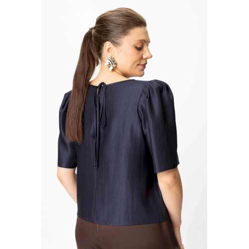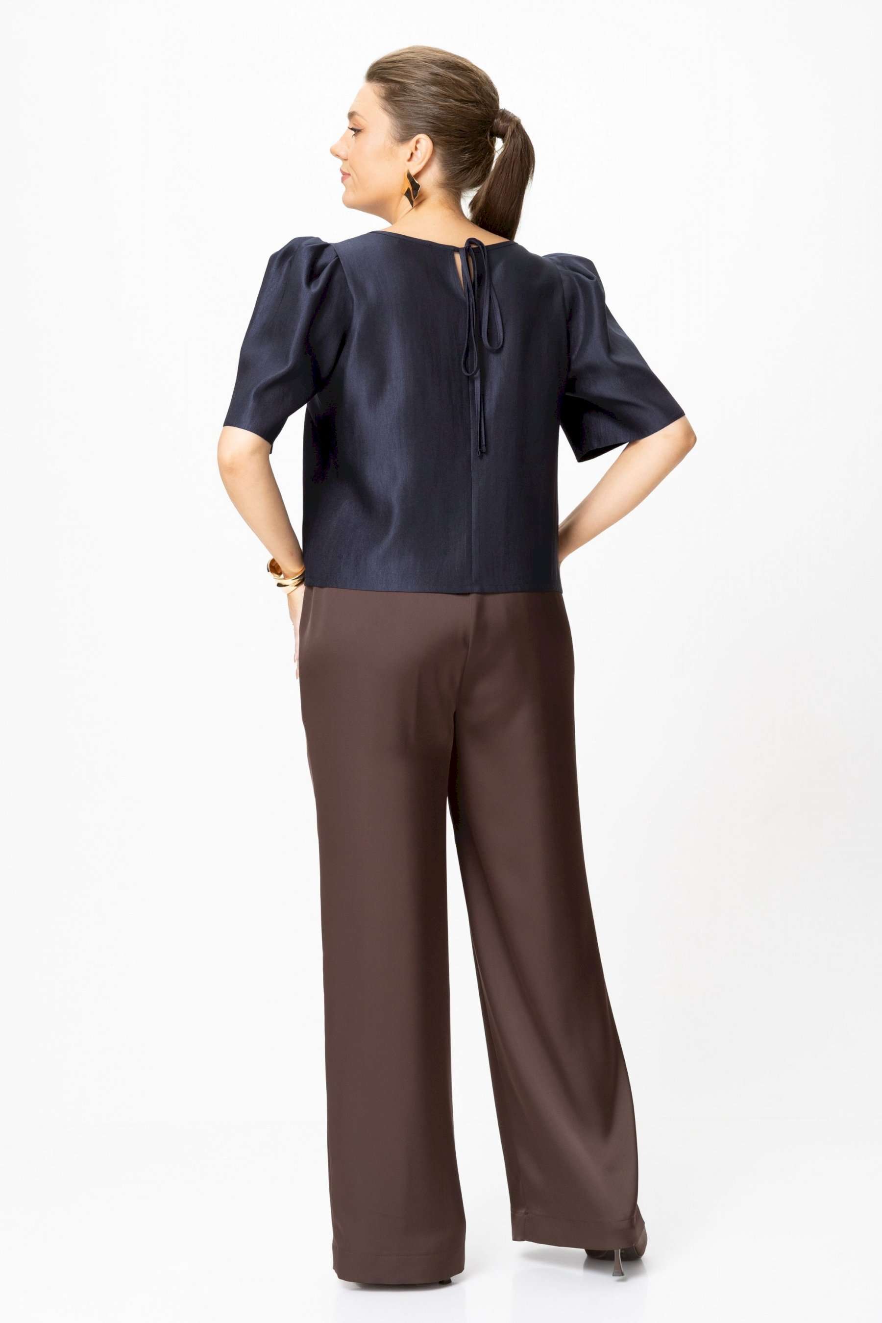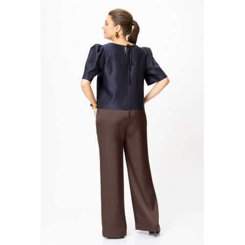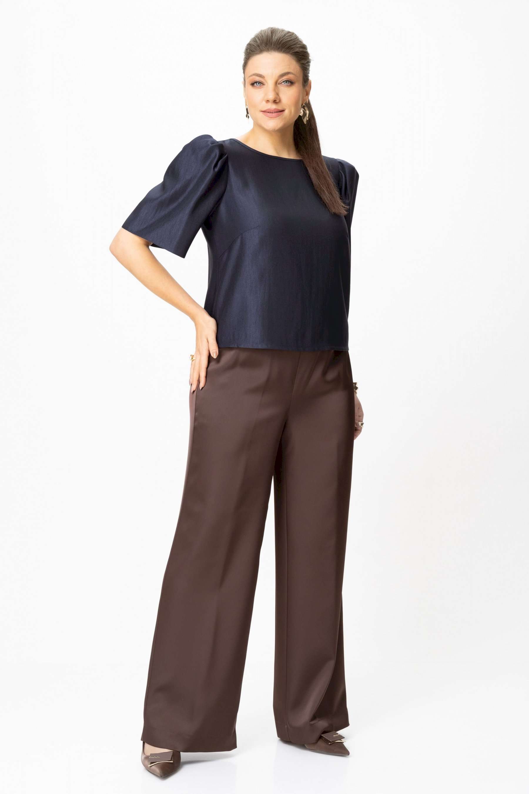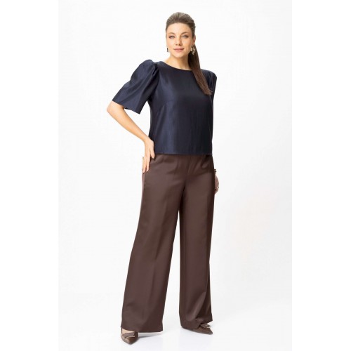 Элегантный женский комплект: состоит из блузки и брюк. Блузка свободного силуэта из плательной ткани с блеском. Горловина круглая, по спинке в центральном шве разрез возле горловины с завязками. Рукава втачные с объемными складками по откату. Брюки свободного силуэта, прямые к низу, выполнены из атласной ткани, брюки без застежки, верх брюк на поясе с резинкой. Длина блузки – 36 см. Длина рукава – 36 см. Длина брюк – 112 см.