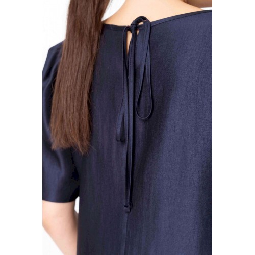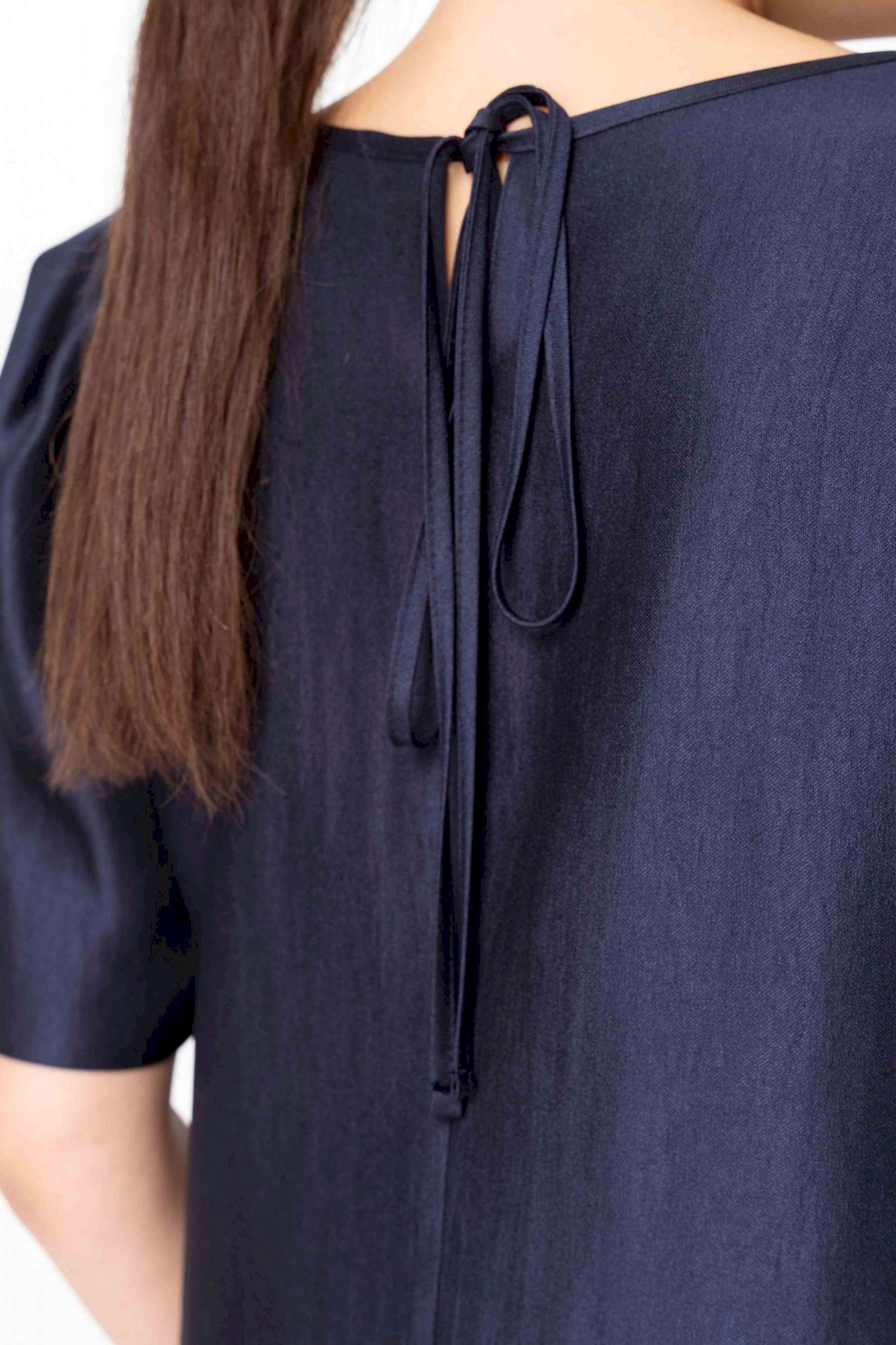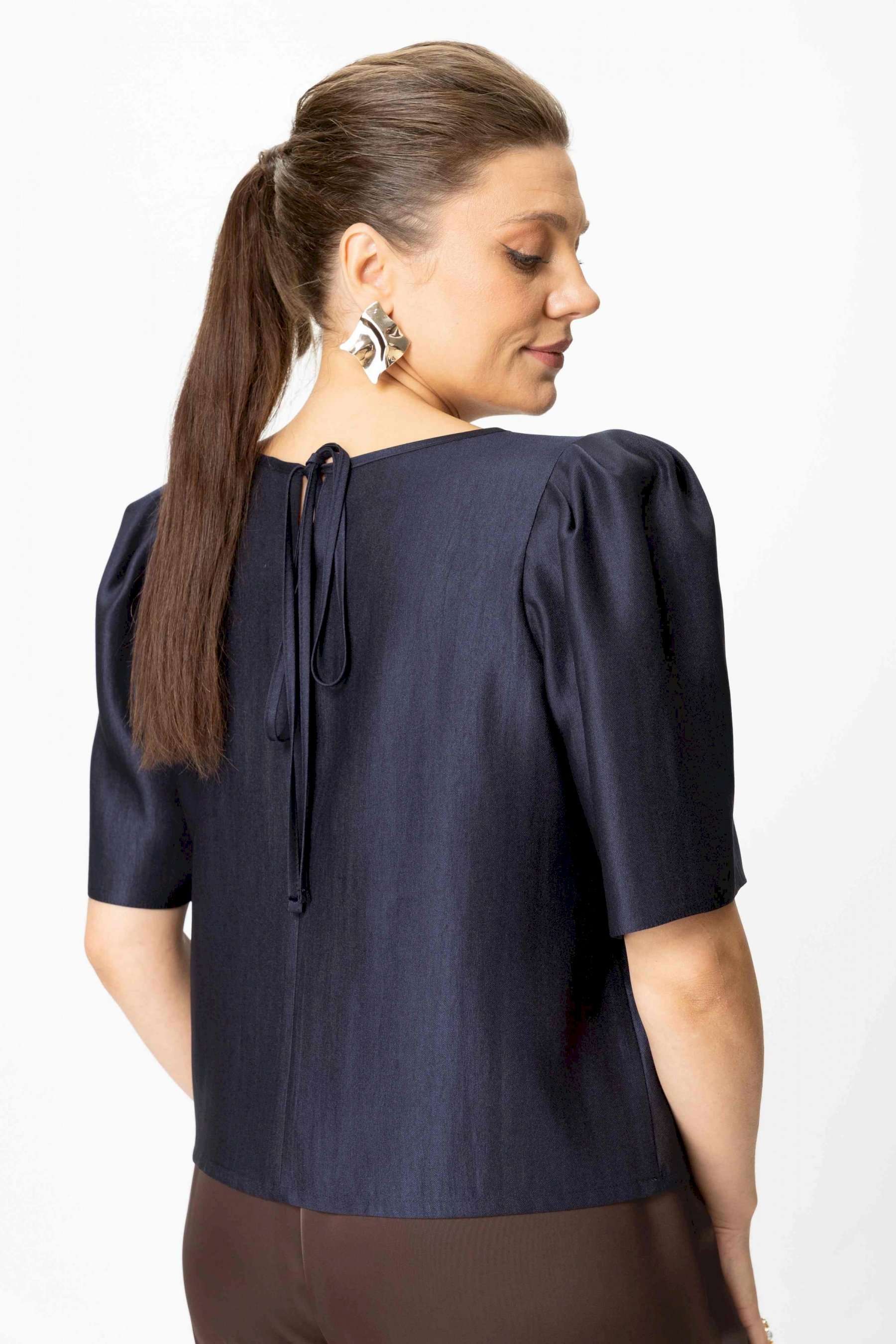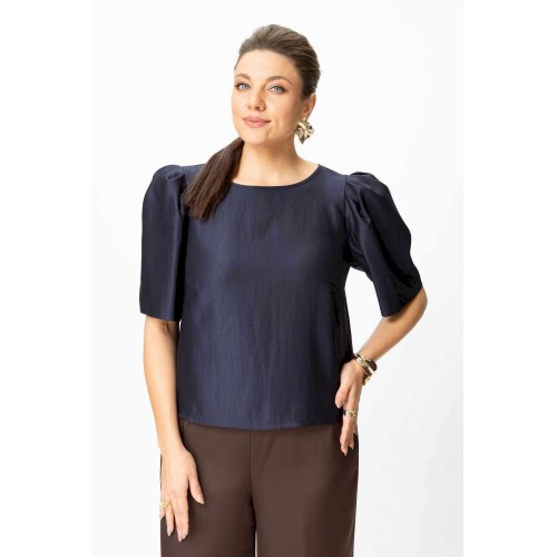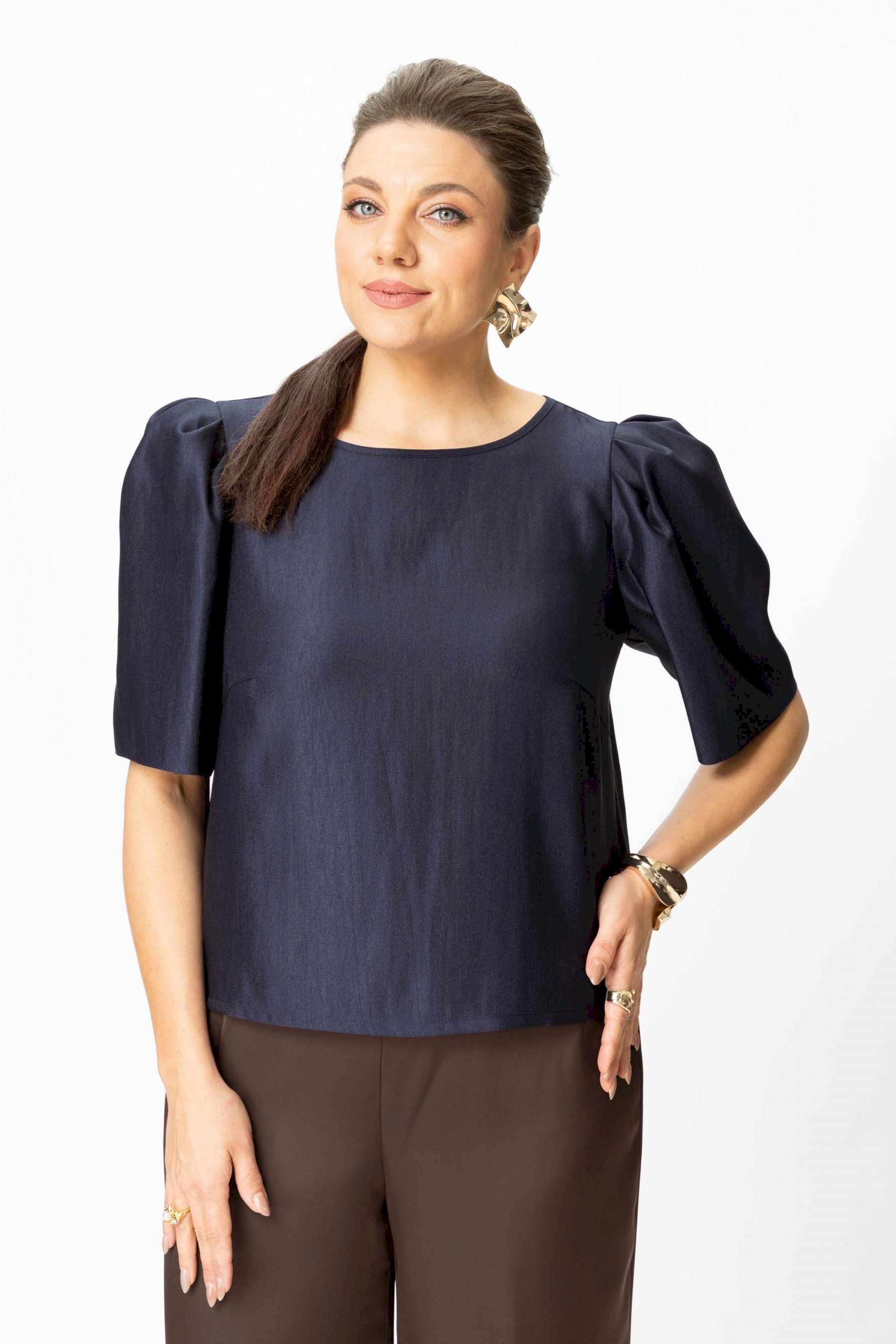 Элегантный женский комплект: состоит из блузки и брюк. Блузка свободного силуэта из плательной ткани с блеском. Горловина круглая, по спинке в центральном шве разрез возле горловины с завязками. Рукава втачные с объемными складками по откату. Брюки свободного силуэта, прямые к низу, выполнены из атласной ткани, брюки без застежки, верх брюк на поясе с резинкой. Длина блузки – 36 см. Длина рукава – 36 см. Длина брюк – 112 см.