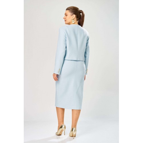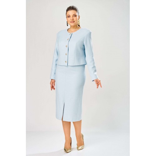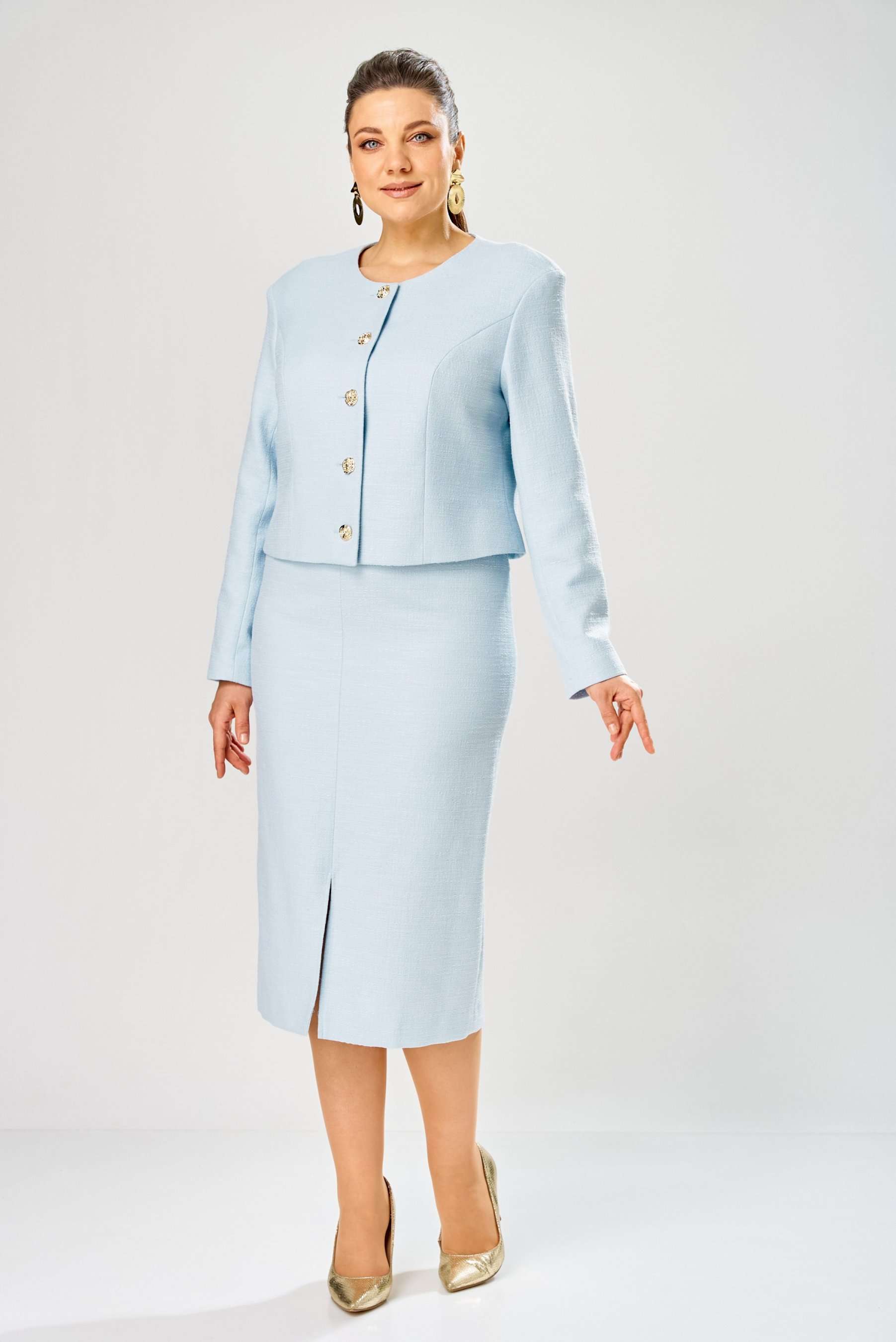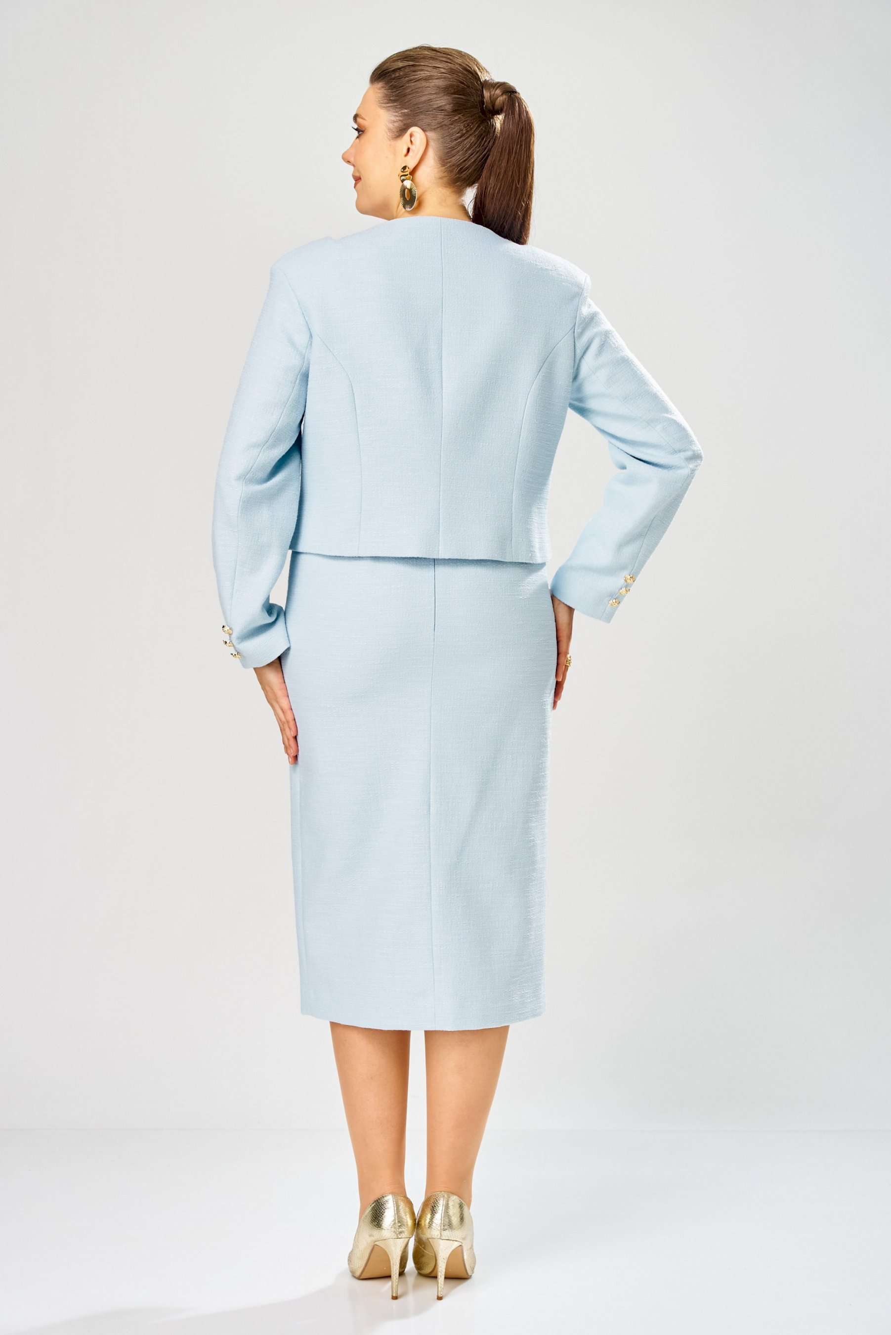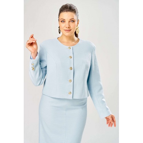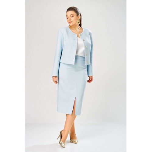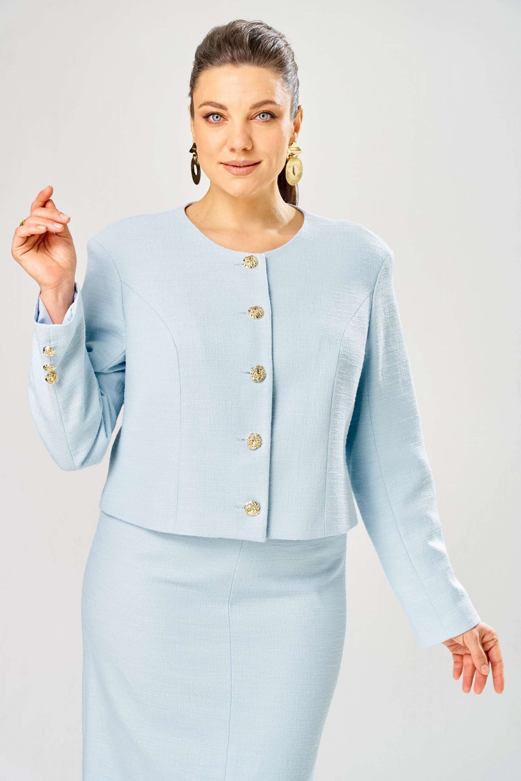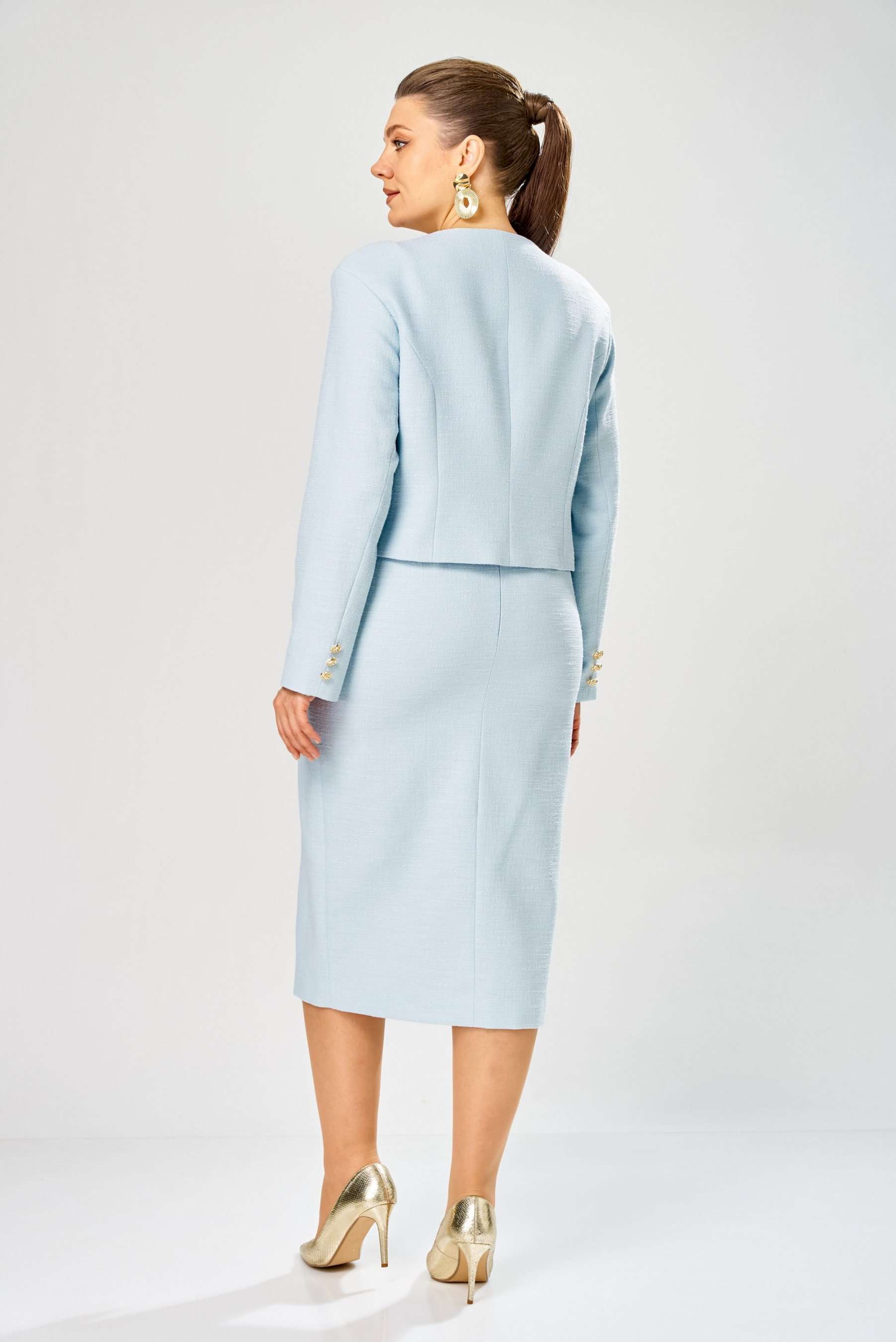 Костюм женский 2-ка. Элегантный женский костюм, состоит из юбки и жакета, выполнен из жаккардовой ткани с содержанием хлопка. Жакет укороченный, прямого силуэта. Застежка центральная на петли пуговицы, горловина круглая. В жакете удлиненная линия плеча, рукава втачные, длинные, в локтевом шве, низу декоративные пуговицы. Юбка карандаш, актуальной длины до середины икры. По переду и спинке центральные швы, в переднем шве по низу разрез, по спинке застежка молния, верх юбки оформлен отрезным поясом. Юбка на подкладке. Длина жакета – 47,5 см Длина рукава – 59 см Длина юбки – 79 см