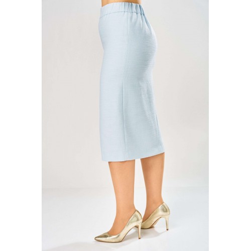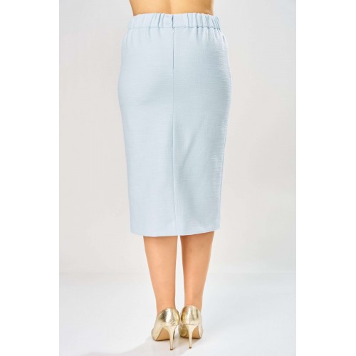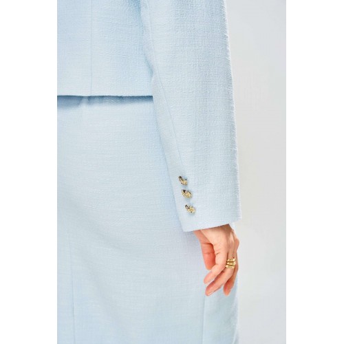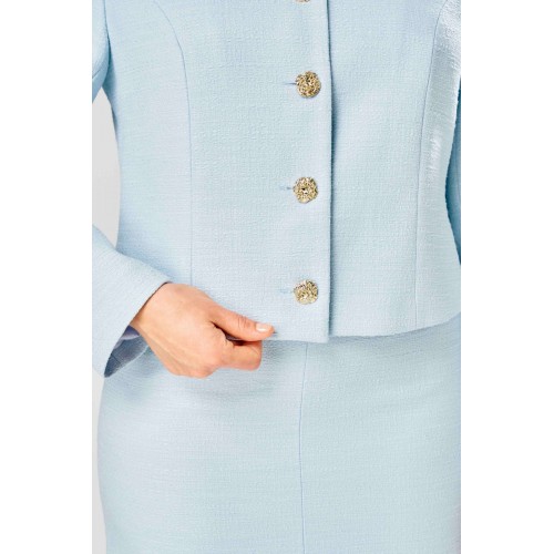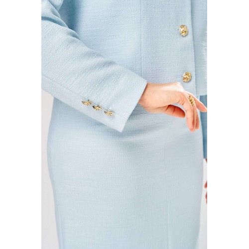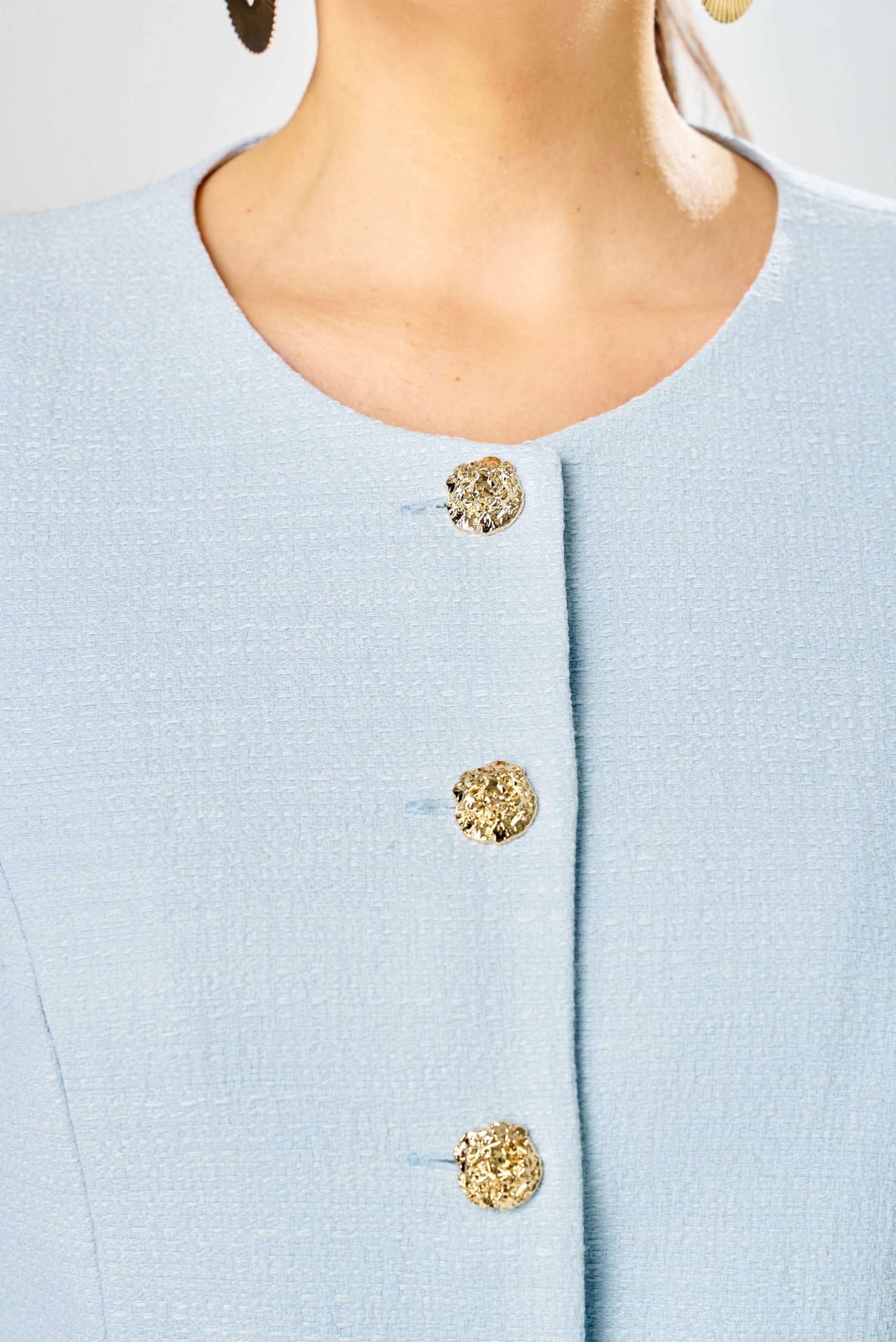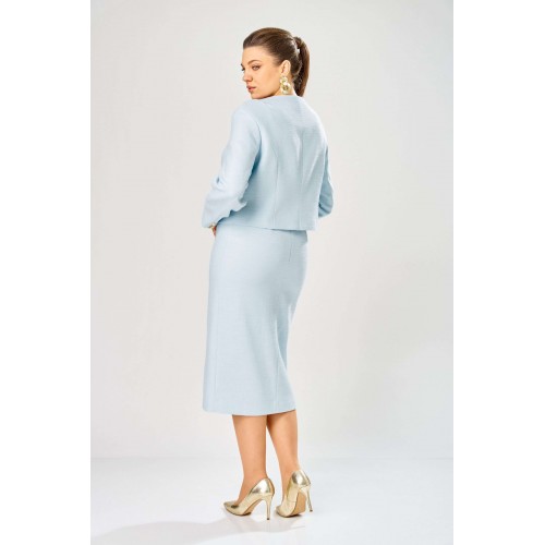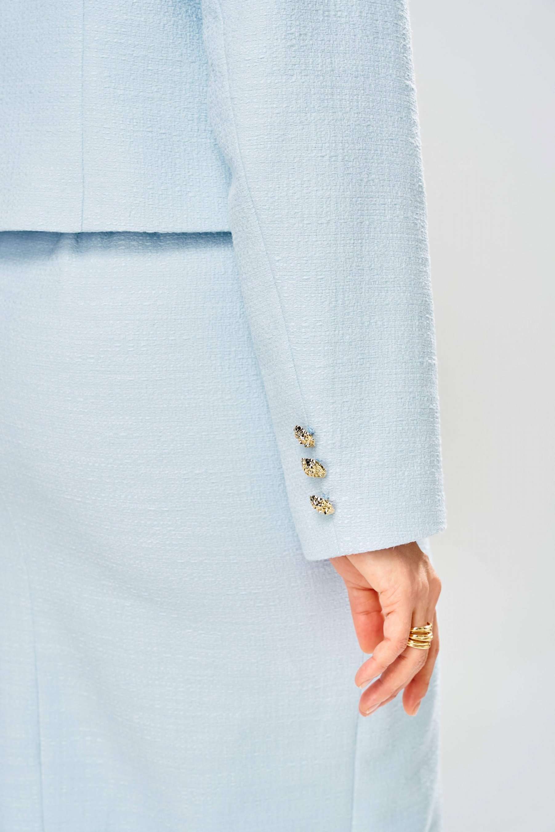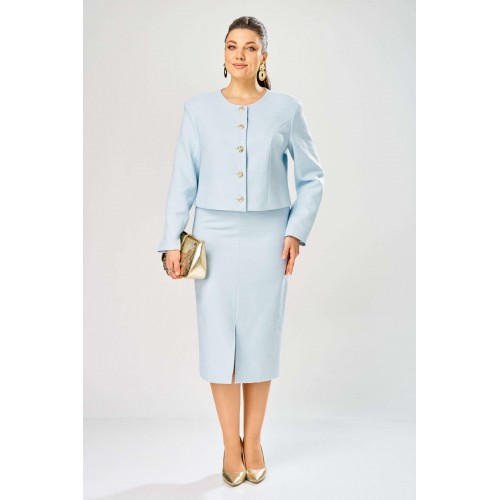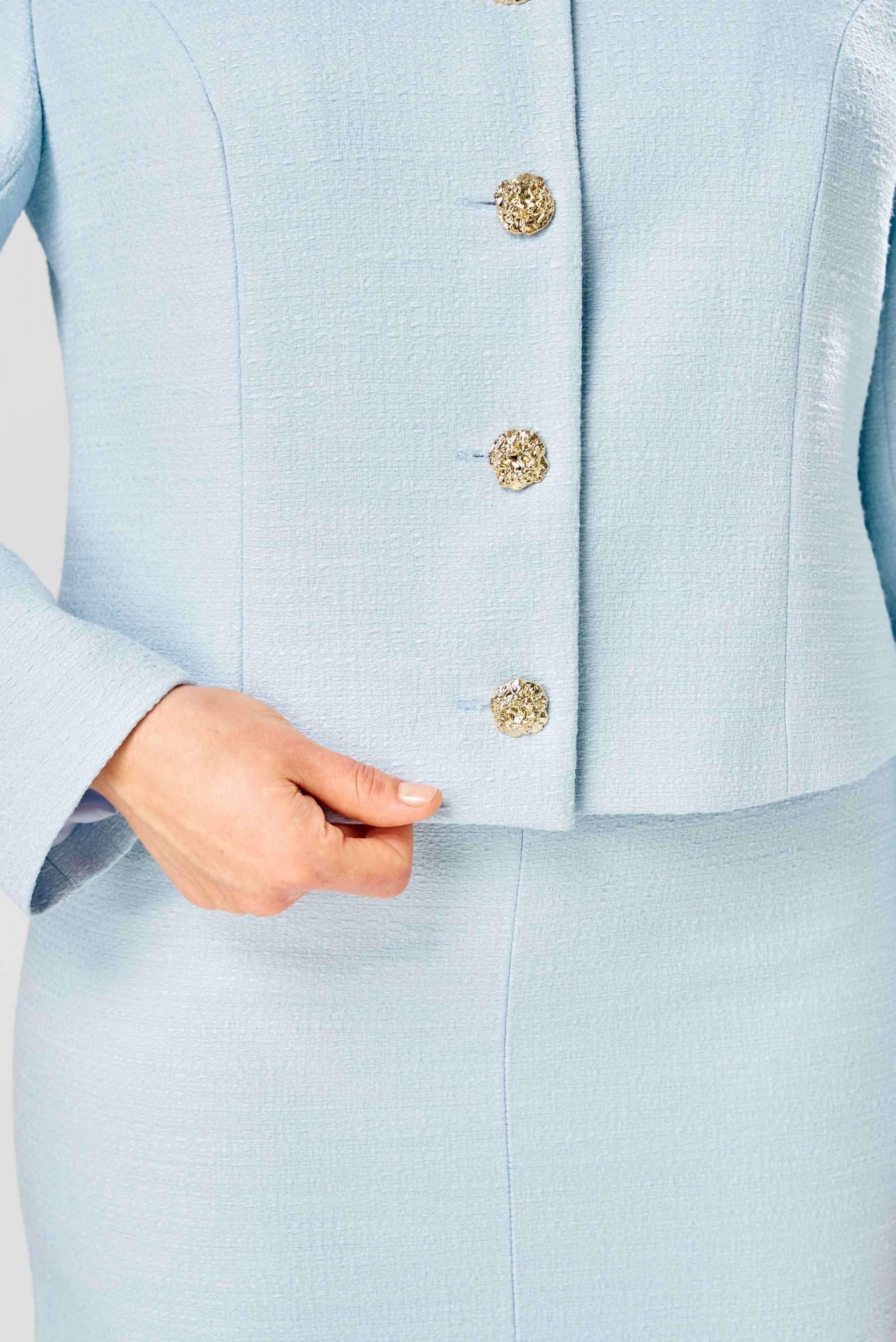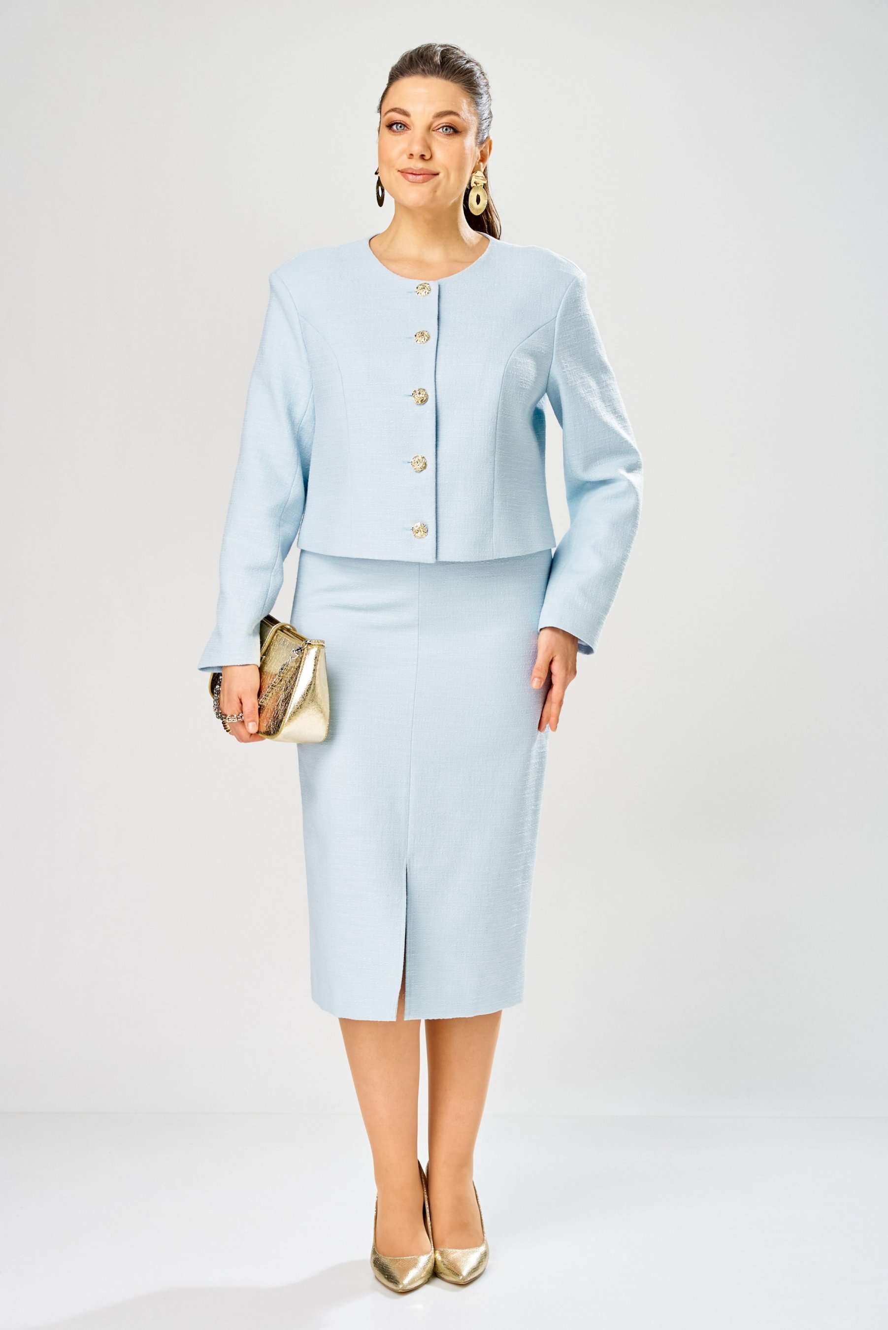 Костюм женский 2-ка. Элегантный женский костюм, состоит из юбки и жакета, выполнен из жаккардовой ткани с содержанием хлопка. Жакет укороченный, прямого силуэта. Застежка центральная на петли пуговицы, горловина круглая. В жакете удлиненная линия плеча, рукава втачные, длинные, в локтевом шве, низу декоративные пуговицы. Юбка карандаш, актуальной длины до середины икры. По переду и спинке центральные швы, в переднем шве по низу разрез, по спинке застежка молния, верх юбки оформлен отрезным поясом. Юбка на подкладке. Длина жакета – 47,5 см Длина рукава – 59 см Длина юбки – 79 см