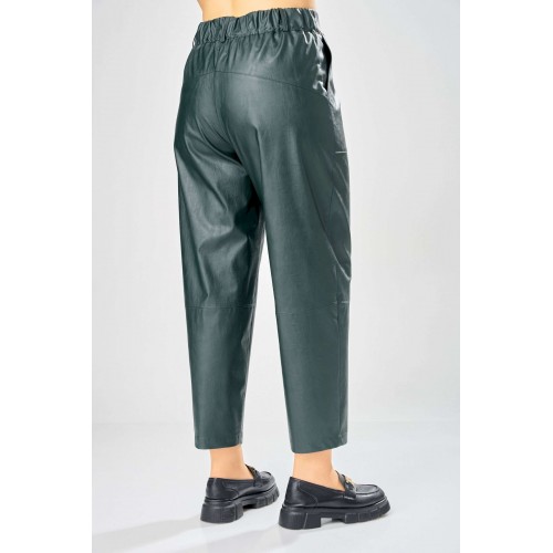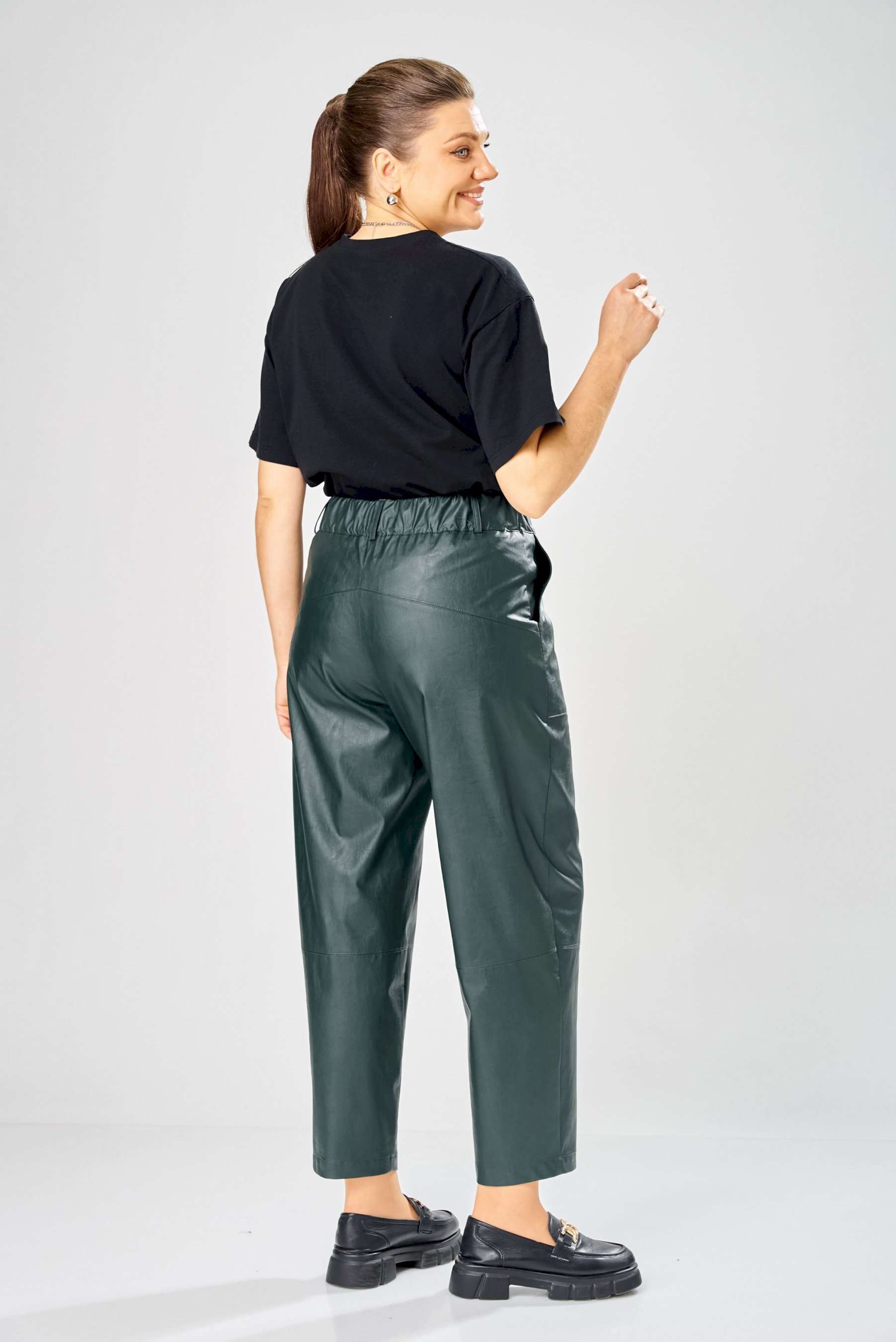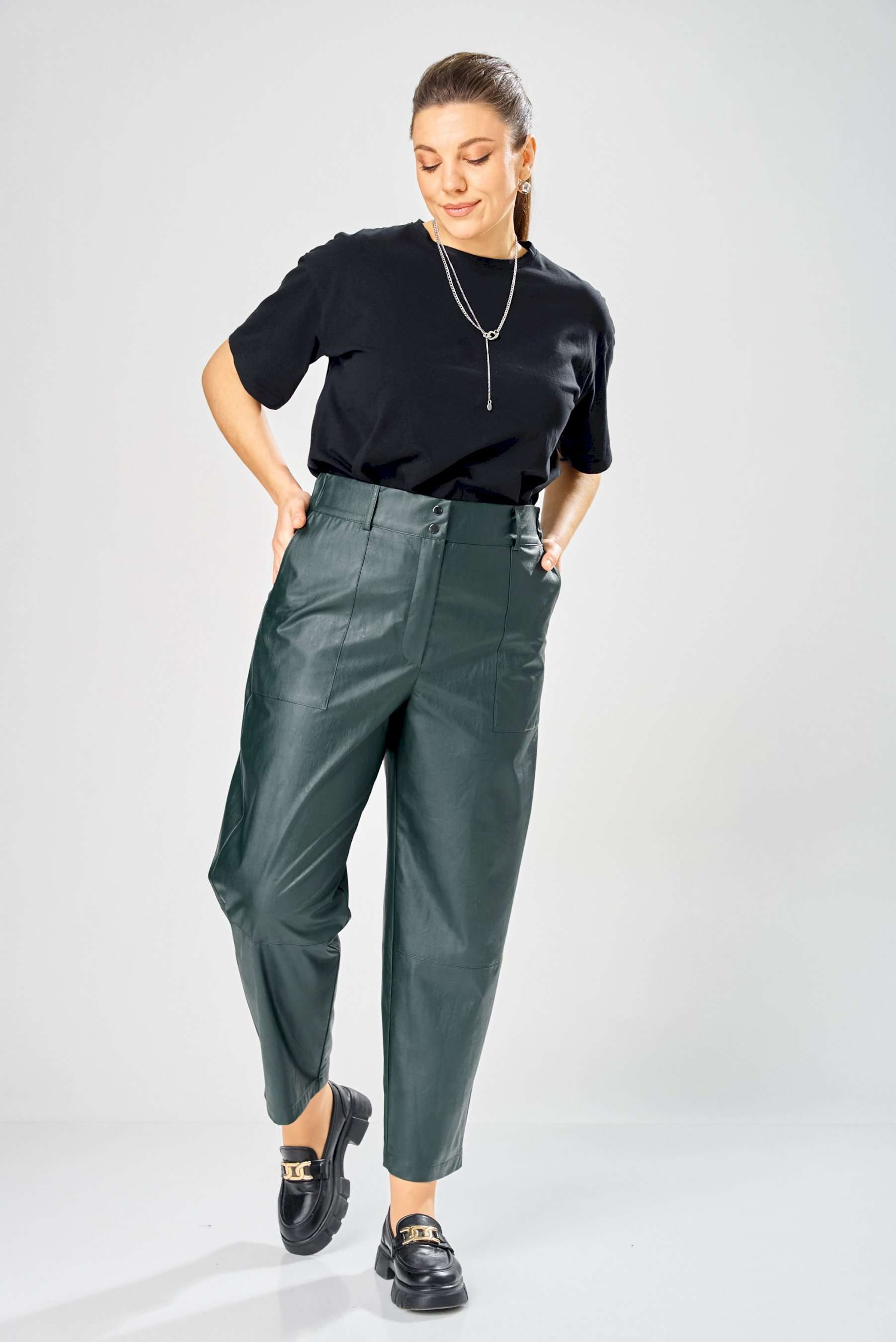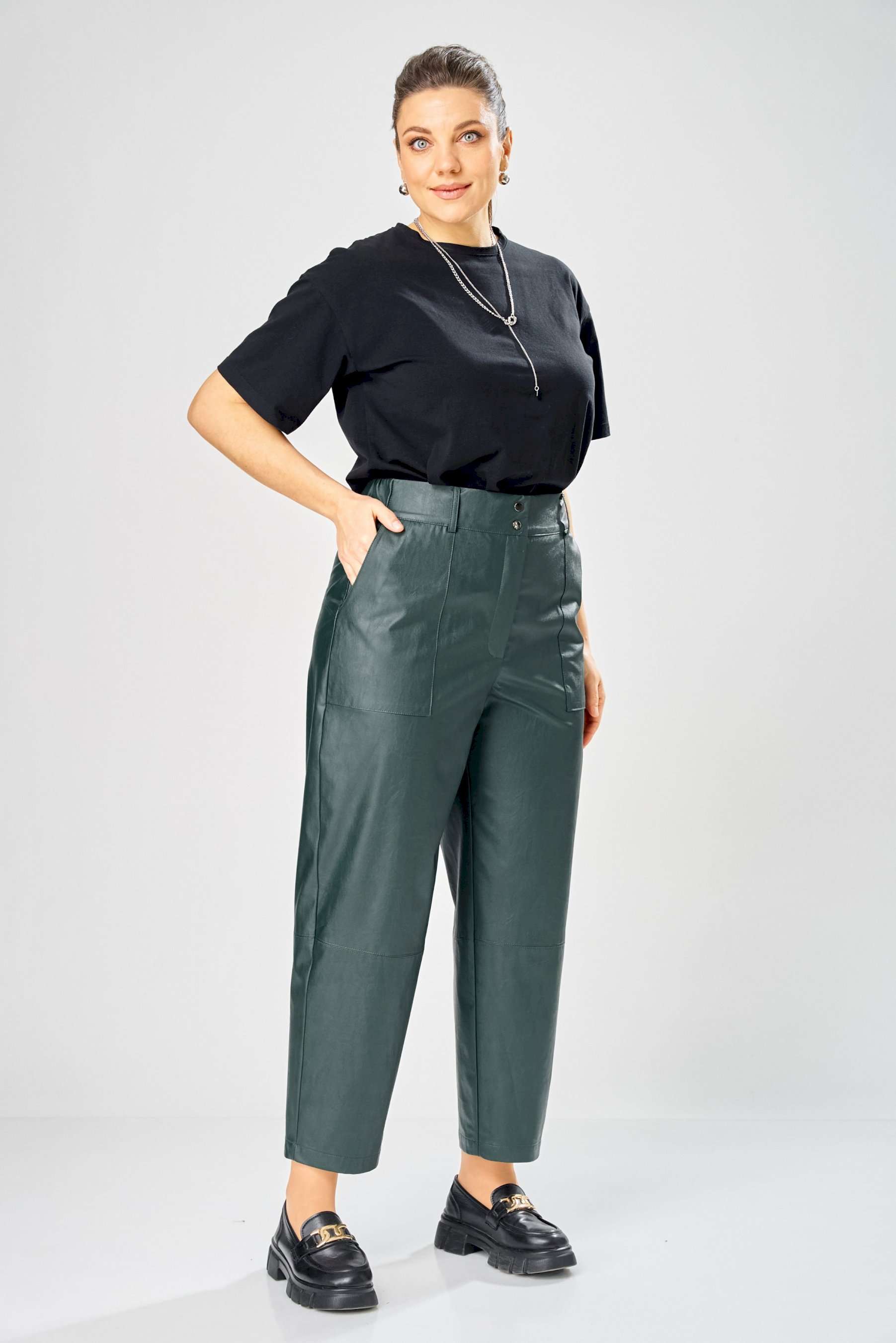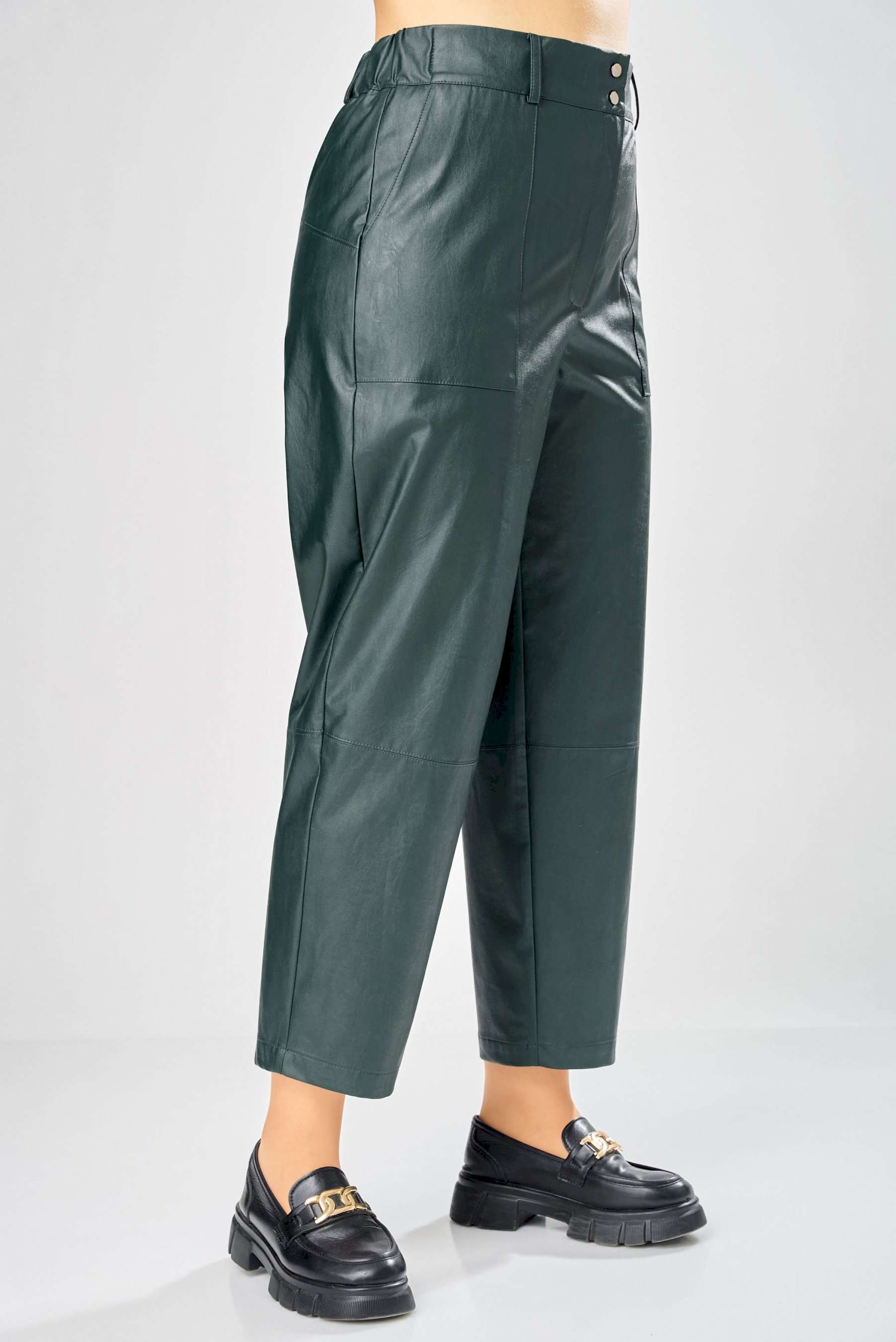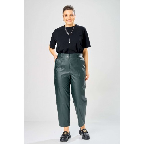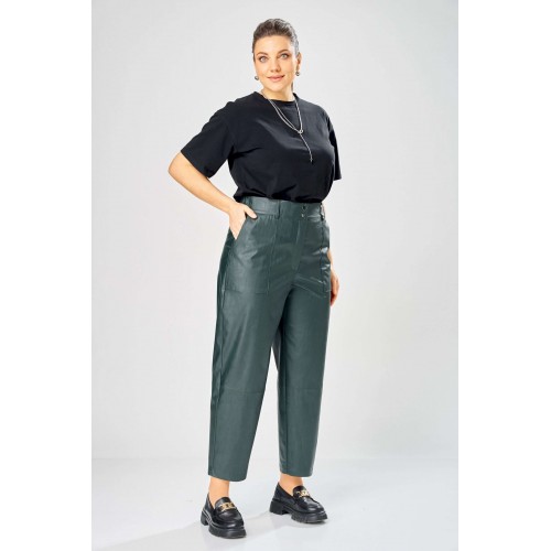 Стильные женские брюки, из эко-кожи. Брюки, зауженные к низу, по передним половинкам накладные карманы, застежка по линии банта на молнию, на задних половинках отрезная кокетка и накладные карманы. Верх брюк на пояса с застежкой на кнопки. Длина брюк по боковому шву– 100 см Длина брюк по шаговому шву – 69 см