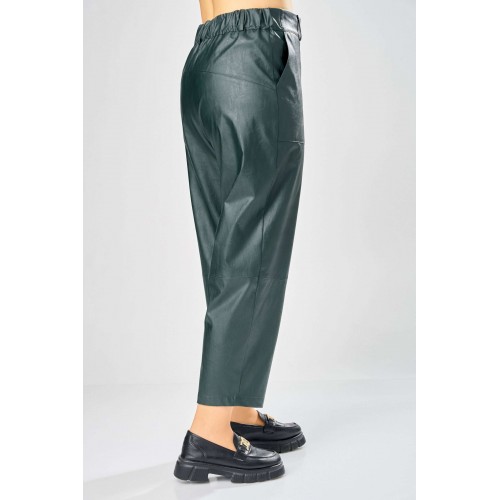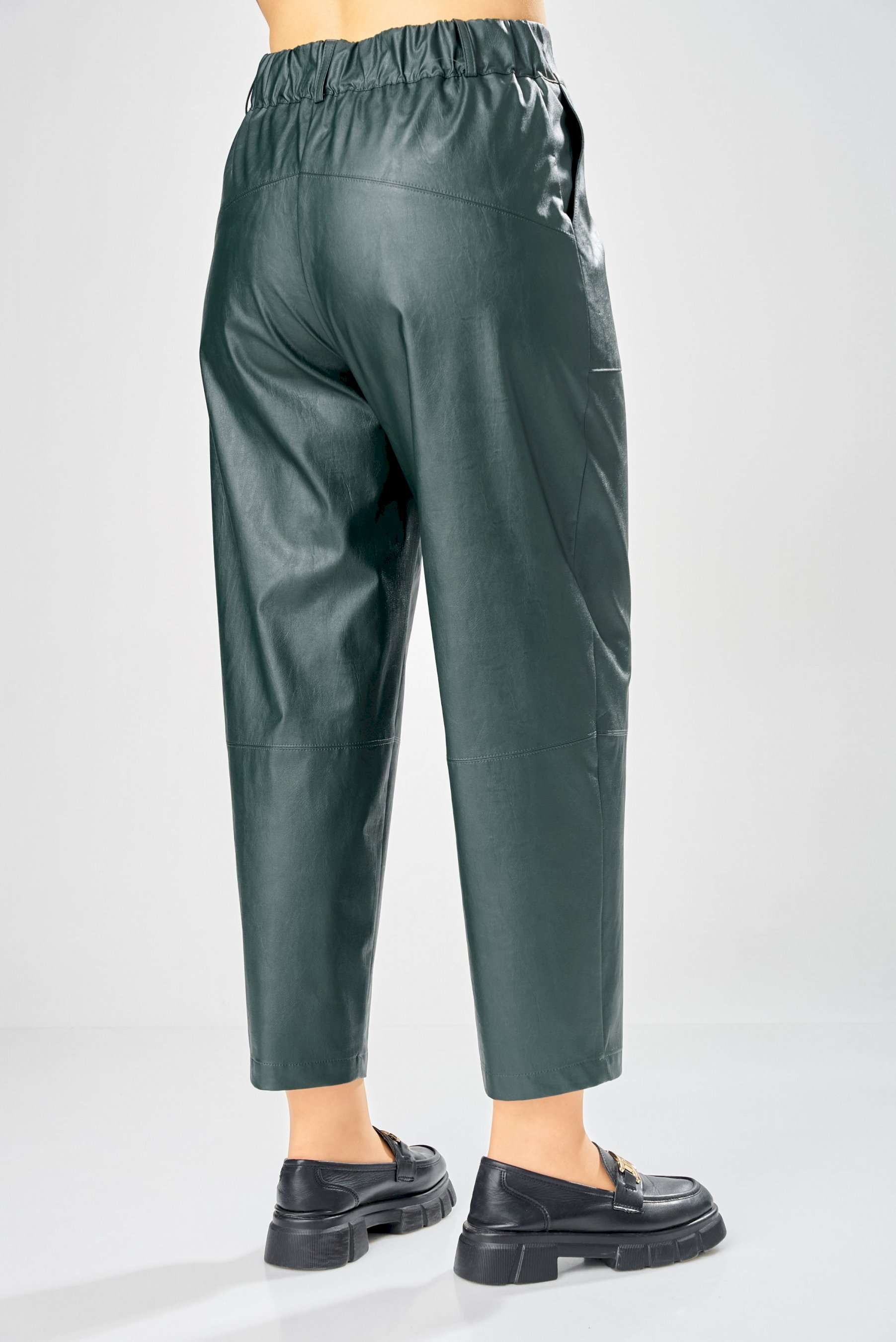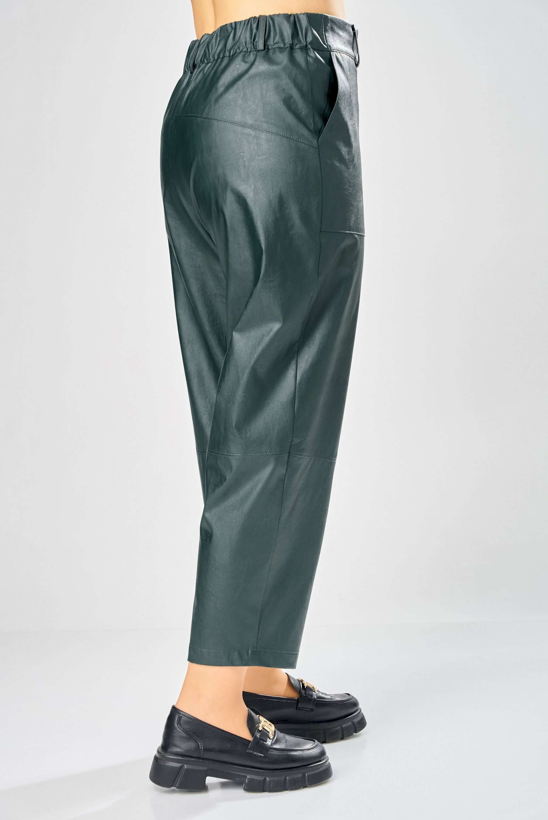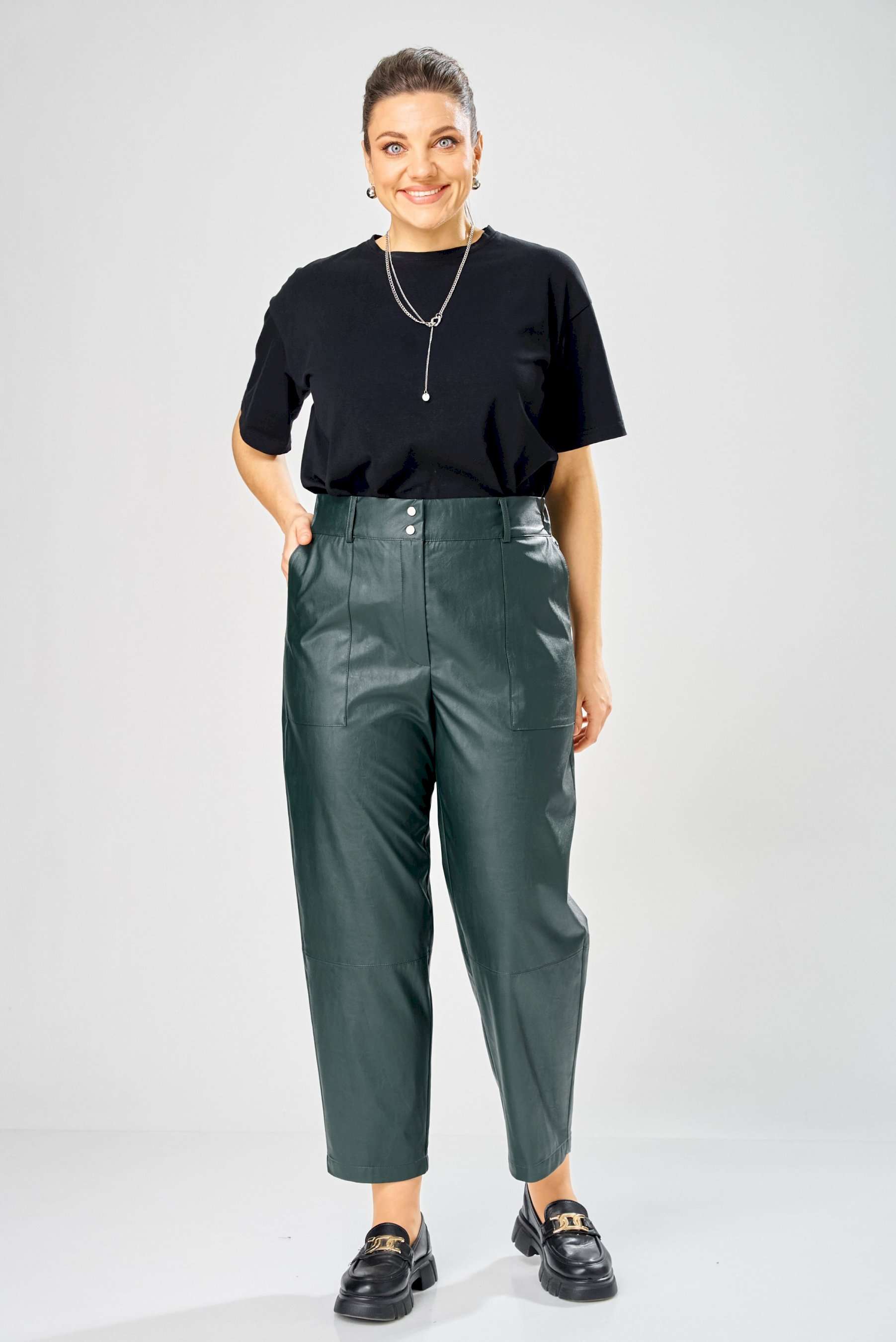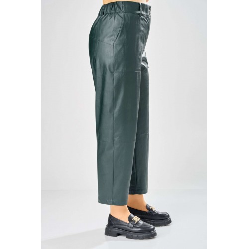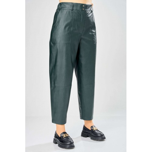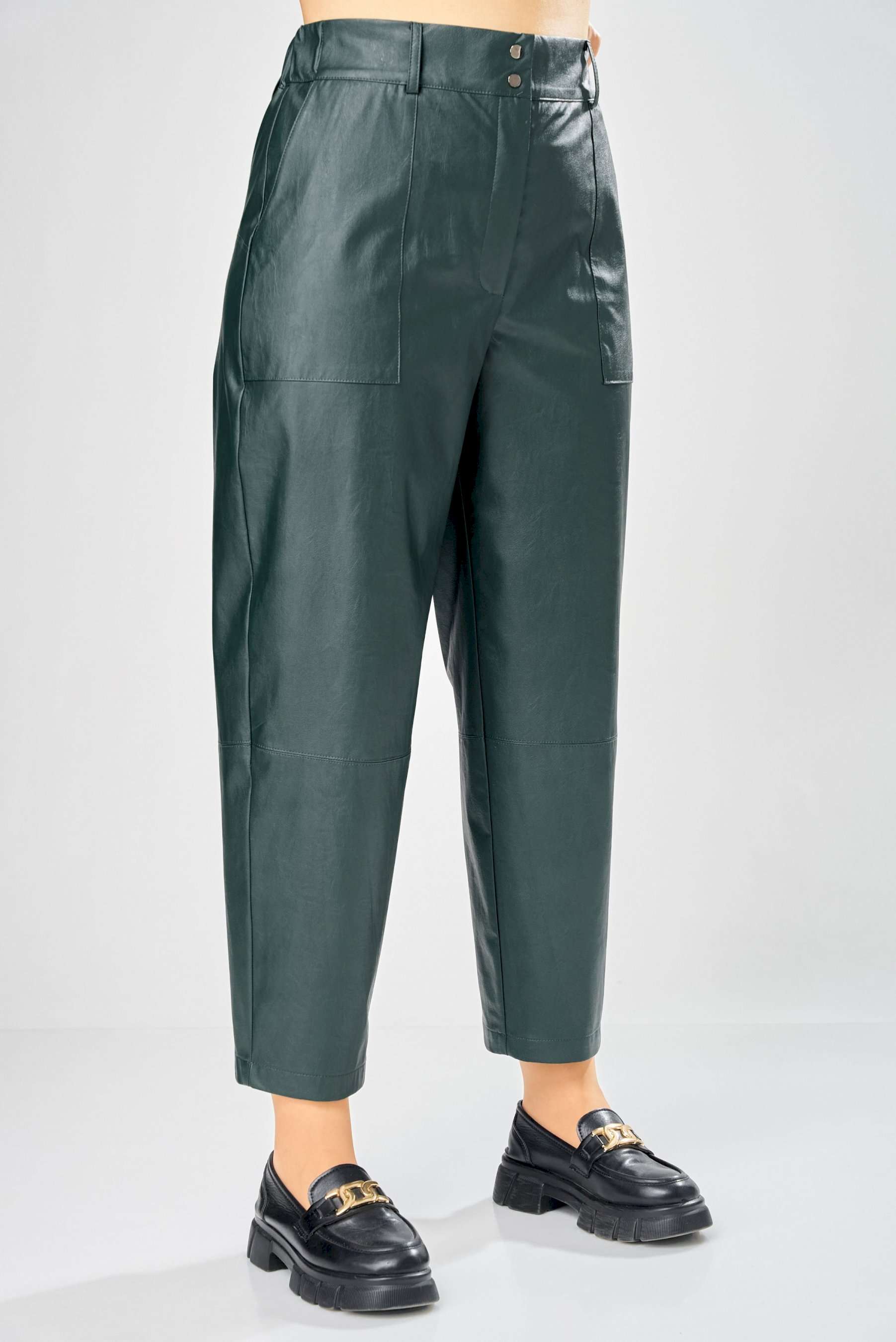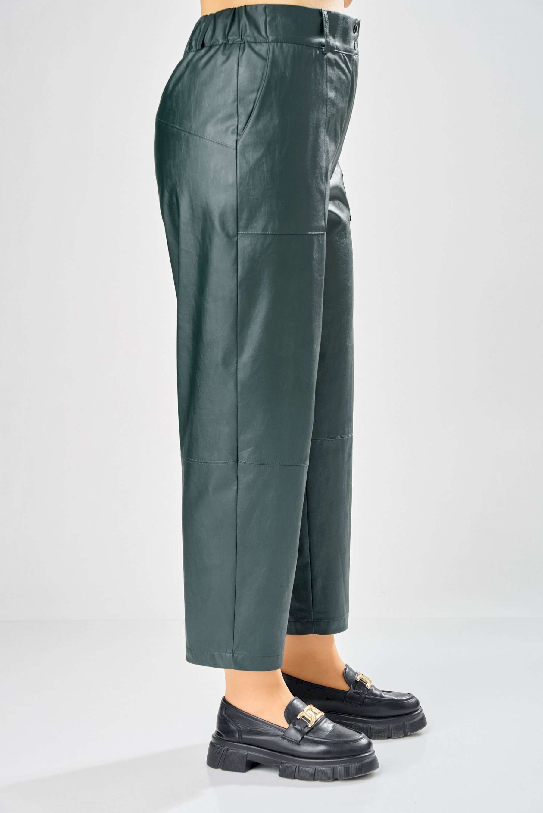 Стильные женские брюки, из эко-кожи. Брюки, зауженные к низу, по передним половинкам накладные карманы, застежка по линии банта на молнию, на задних половинках отрезная кокетка и накладные карманы. Верх брюк на пояса с застежкой на кнопки. Длина брюк по боковому шву– 100 см Длина брюк по шаговому шву – 69 см