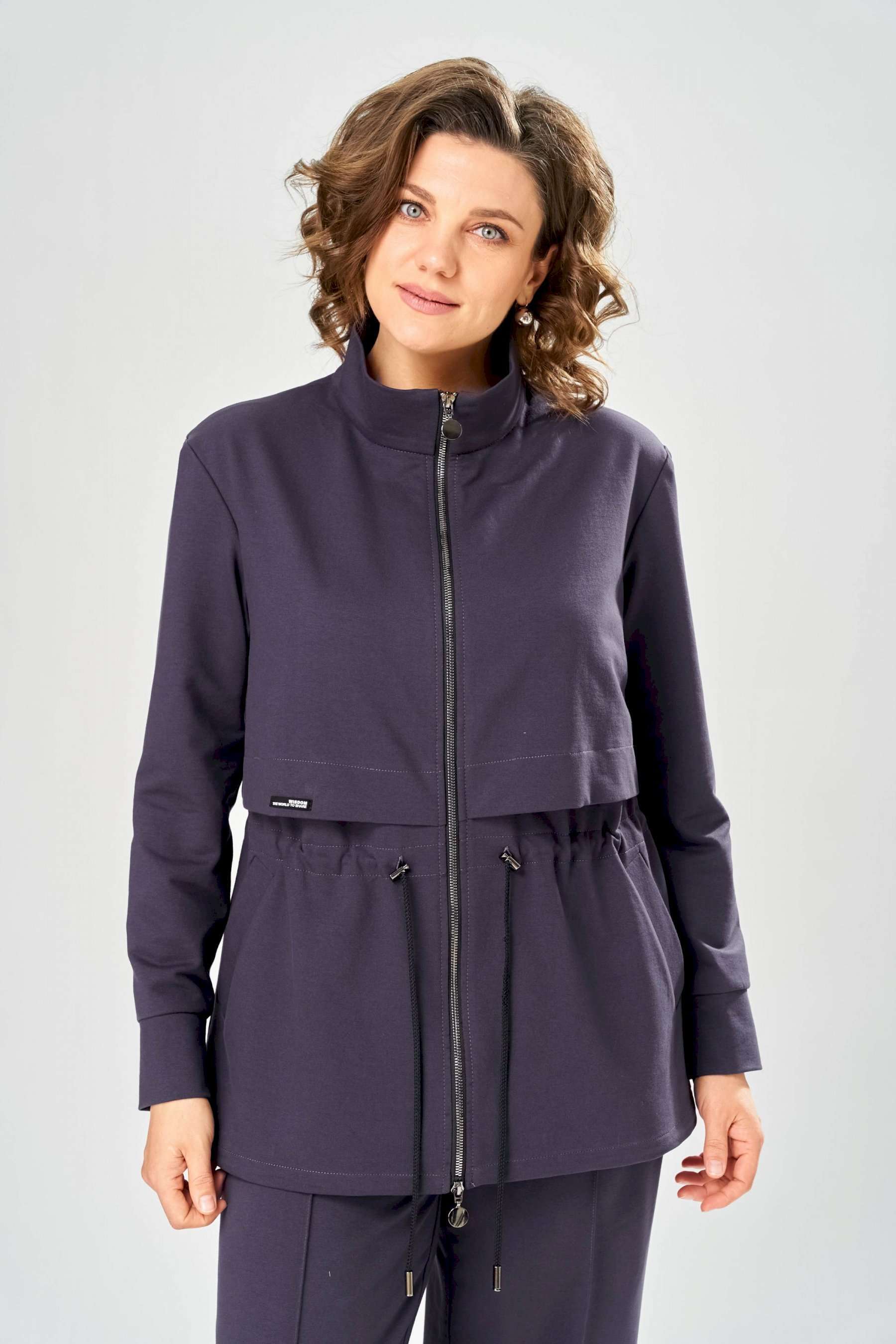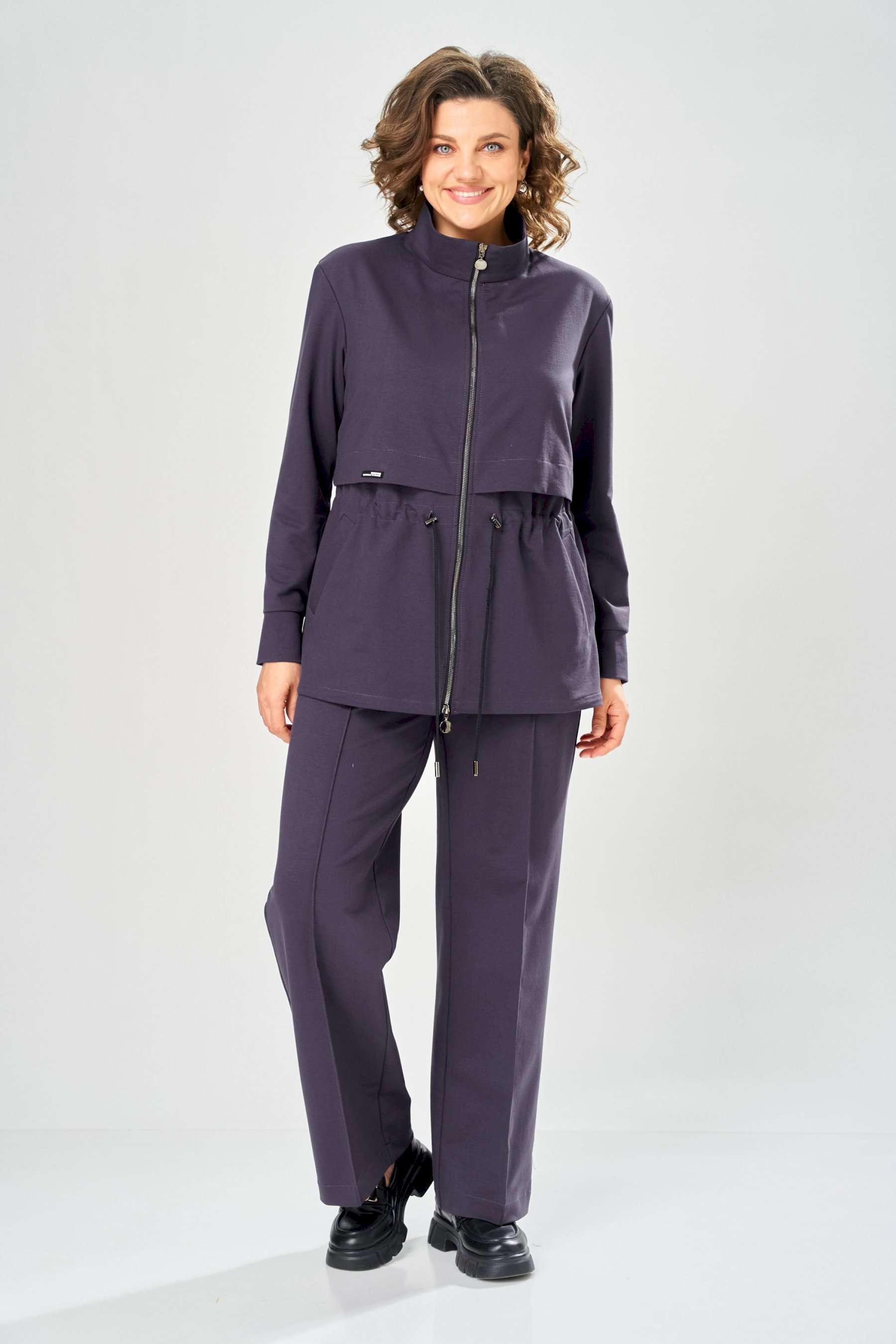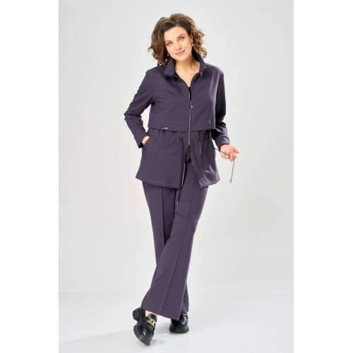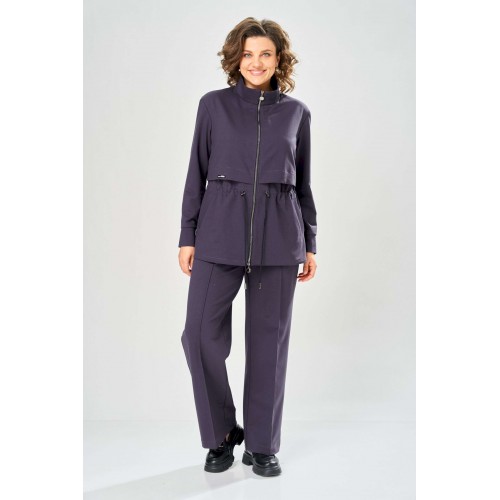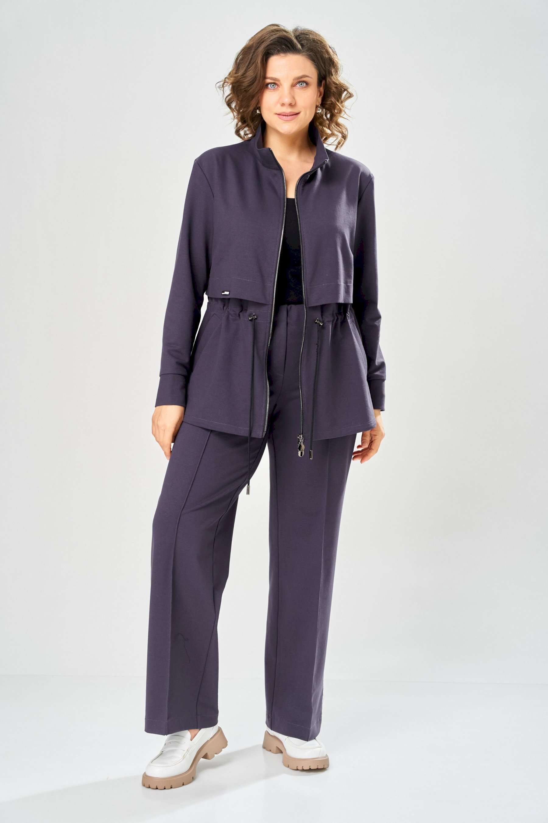 Костюм женский. Стильный женский костюм из трикотажного футера, состоит из жакета и брюк . Жакет полуприлегающего силуэта с центральной застежкой на декоративную молнию, лиф с отлетными кокетками по переду и спинке. Горловина оформлена стойкой. По переду на уровне бедер прорезные карманы с листочкой. На линии талии настрочная кулиса с декоративным шнуром. Рукава втачные с манжетой по низу. Брюки прямые с застроченными стрелками по переду и спинке , верх брюк на резинке. Длина жакета – 70 см Длина рукава – 59 см Длина брюк по боковому шву – 109 см Длина брюк по шаговому шву – 81 см