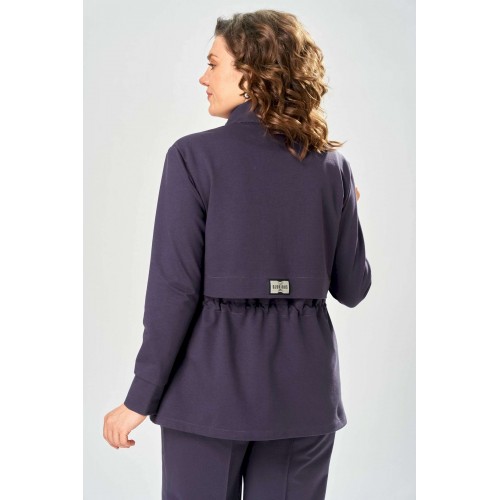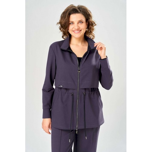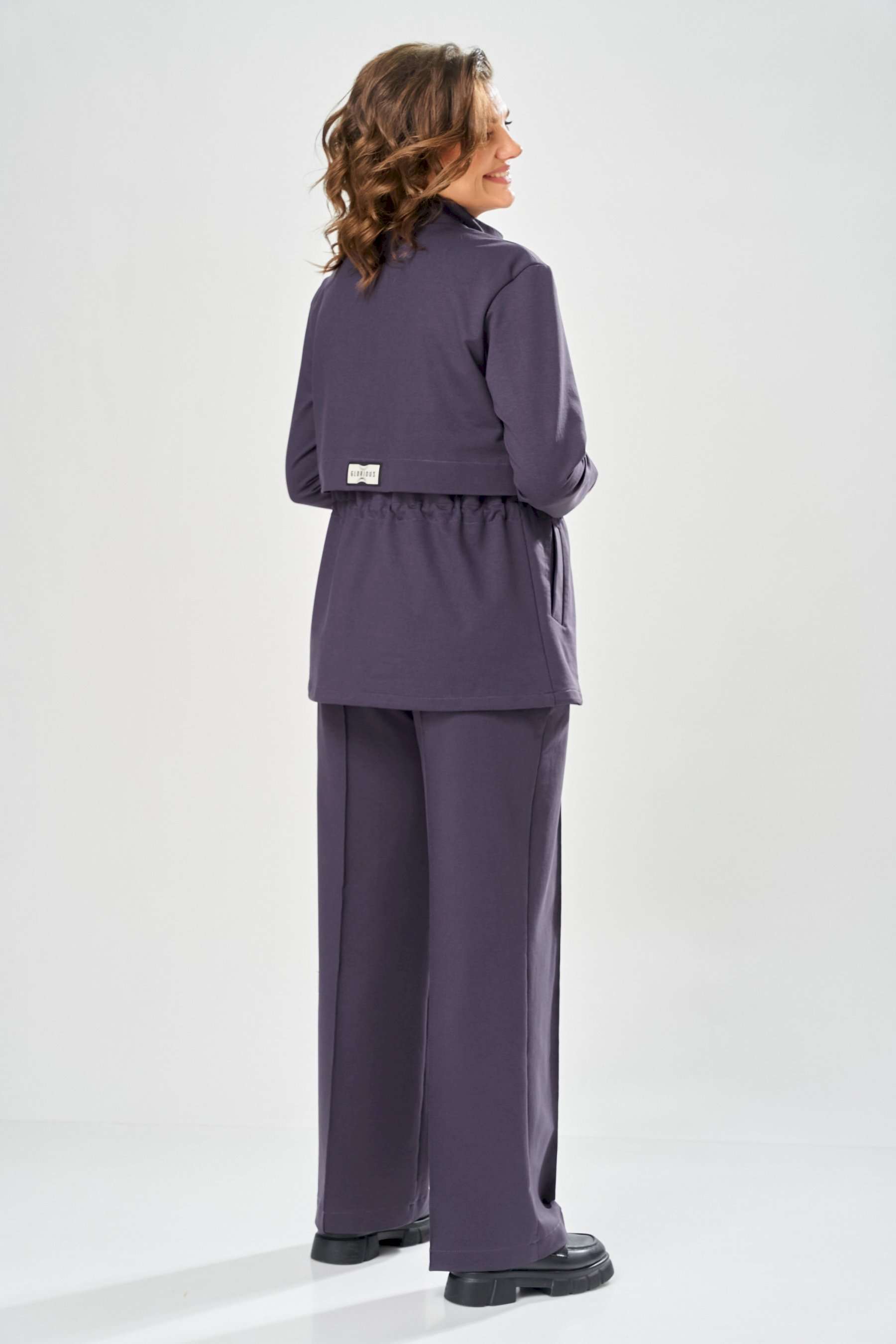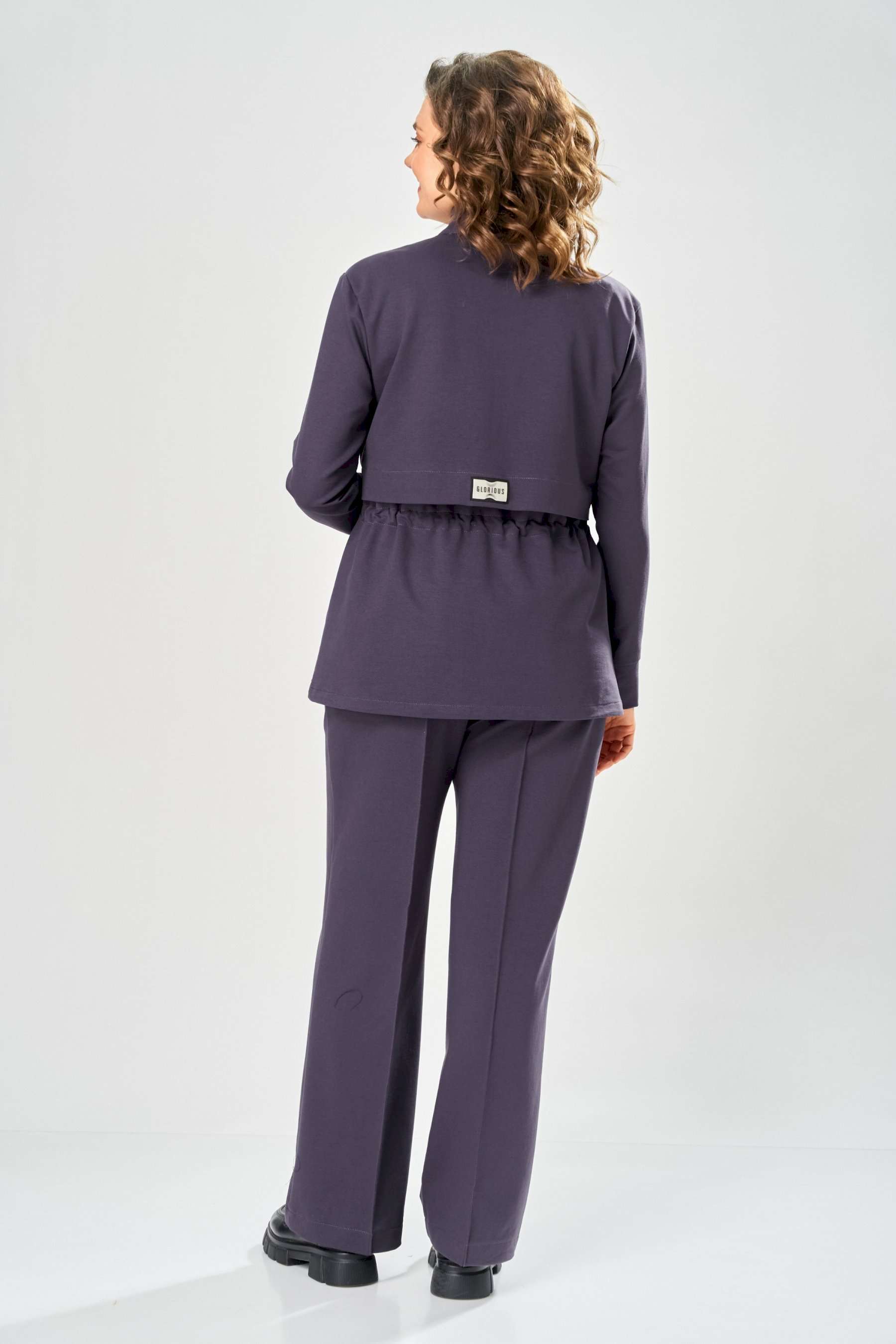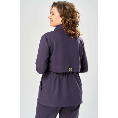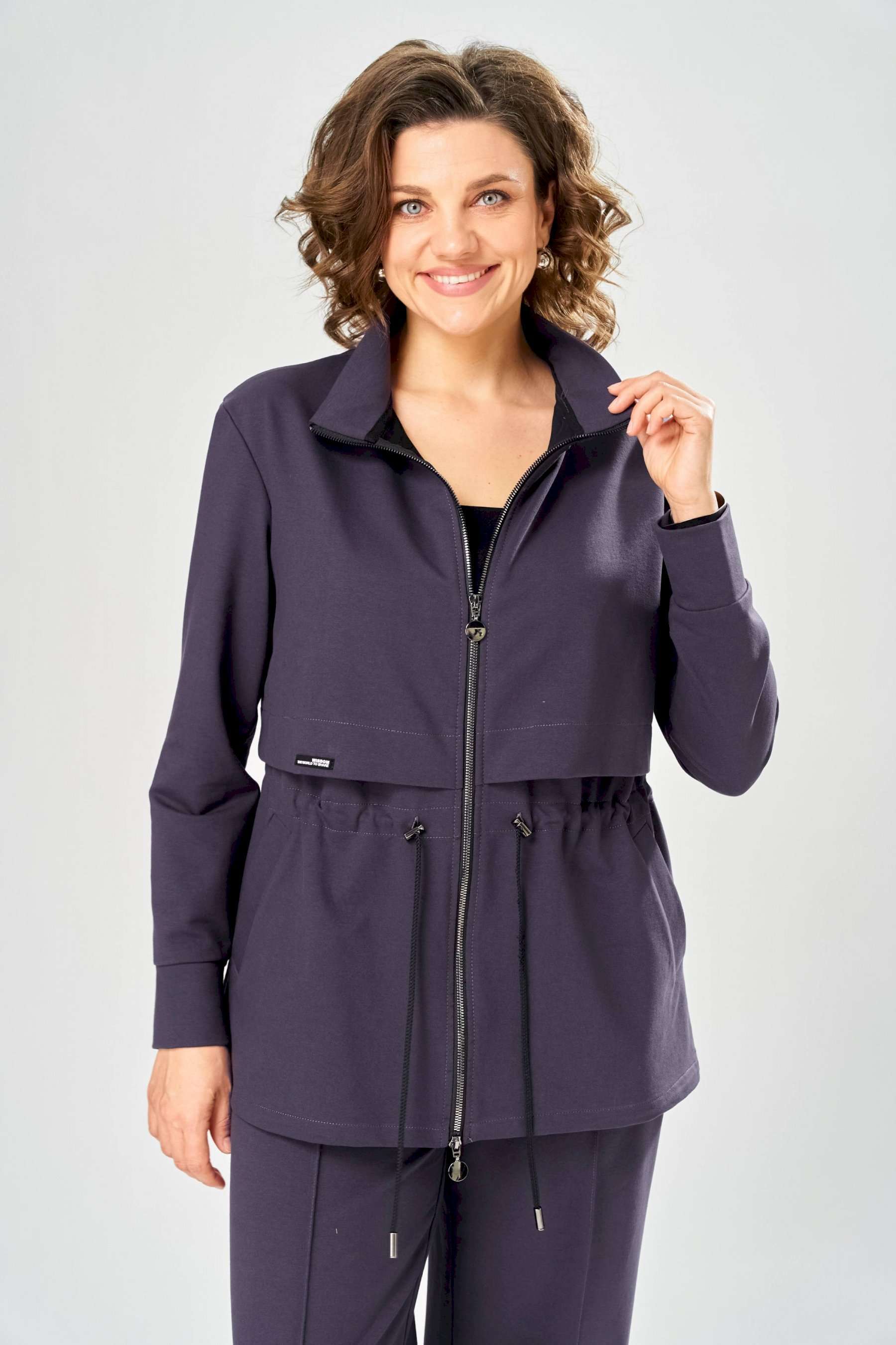 Костюм женский. Стильный женский костюм из трикотажного футера, состоит из жакета и брюк . Жакет полуприлегающего силуэта с центральной застежкой на декоративную молнию, лиф с отлетными кокетками по переду и спинке. Горловина оформлена стойкой. По переду на уровне бедер прорезные карманы с листочкой. На линии талии настрочная кулиса с декоративным шнуром. Рукава втачные с манжетой по низу. Брюки прямые с застроченными стрелками по переду и спинке , верх брюк на резинке. Длина жакета – 70 см Длина рукава – 59 см Длина брюк по боковому шву – 109 см Длина брюк по шаговому шву – 81 см