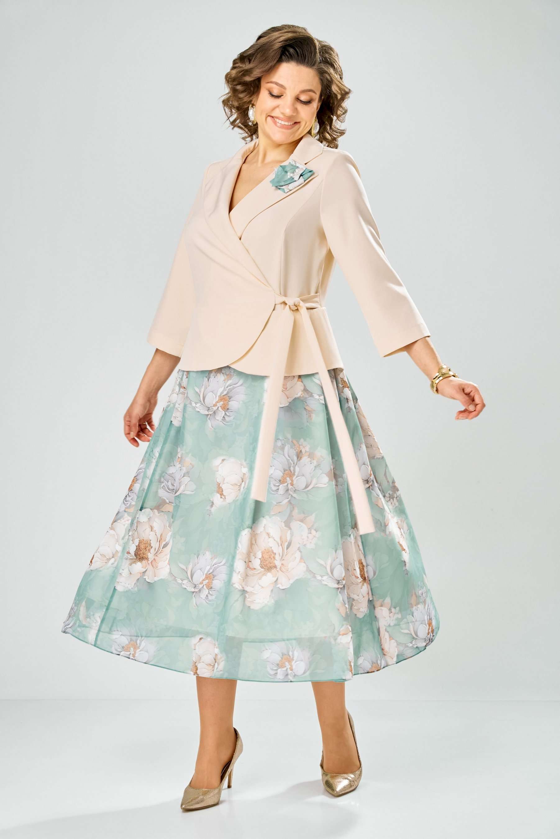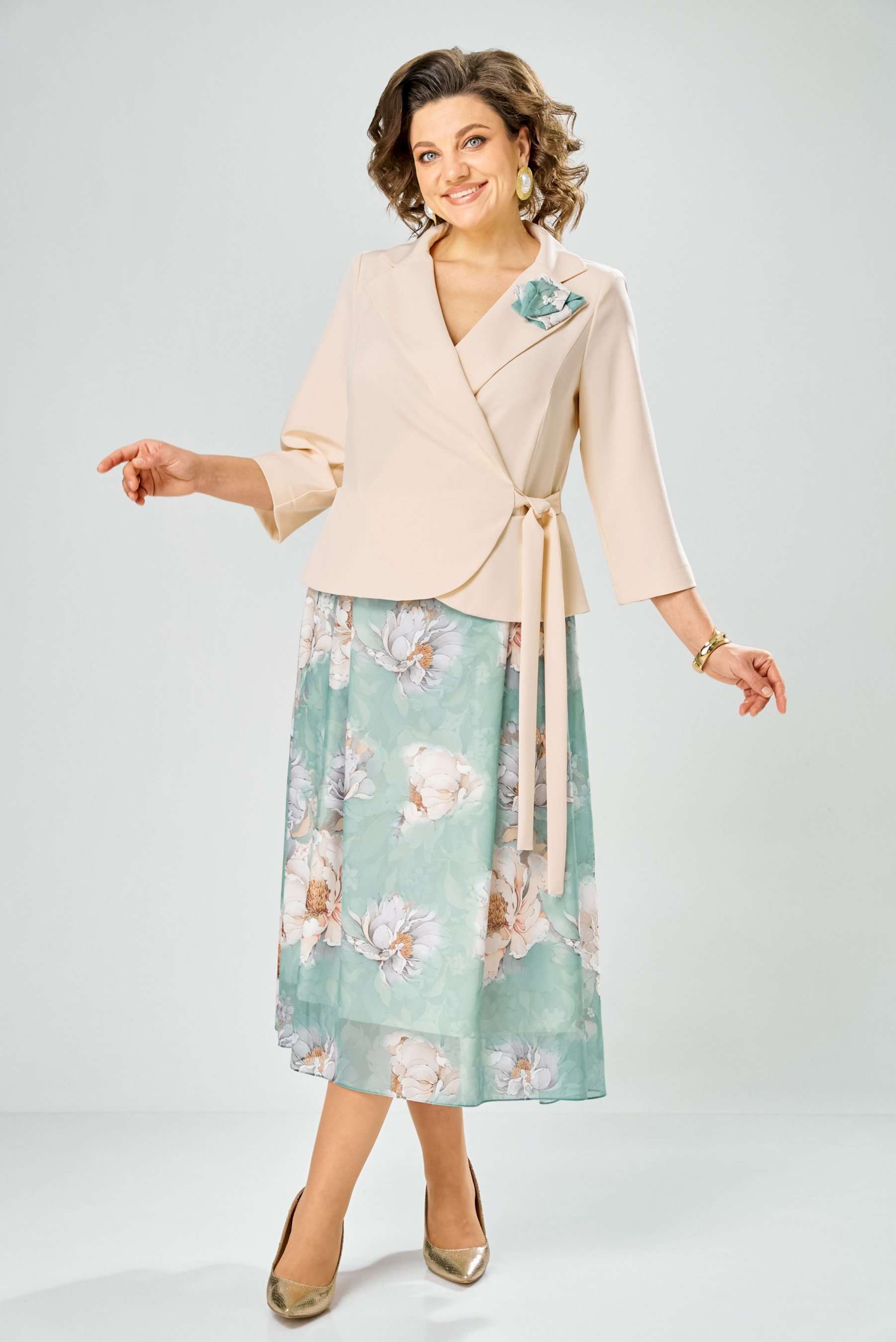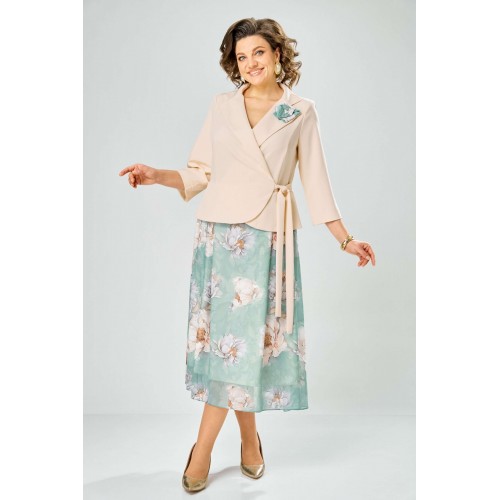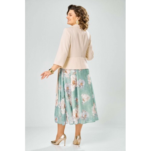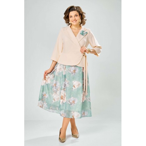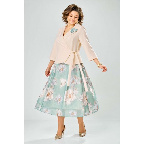 Элегантное женское платье, выполнено в виде имитации костюма из двух видов ткани. Лиф из плательной ткани, юбка из шифона. Платье с запахом, горловина с воротником пиджачного типа с отложными лацканами. Рукава втачные, длина 3/4. Юбка со складками по линии талии, расширенная к низу, на подкладке. По линии талии вставлен завязывающийся пояс. Длина платья – 124 см Длина рукава от горловины – 47.5 см