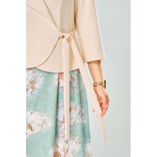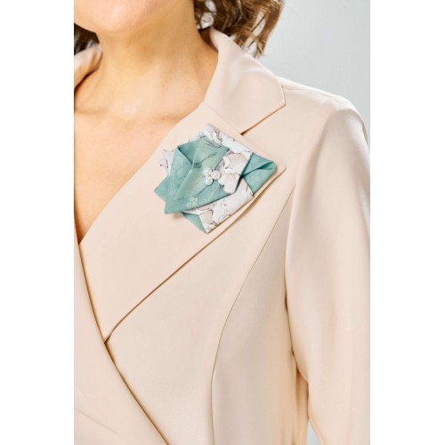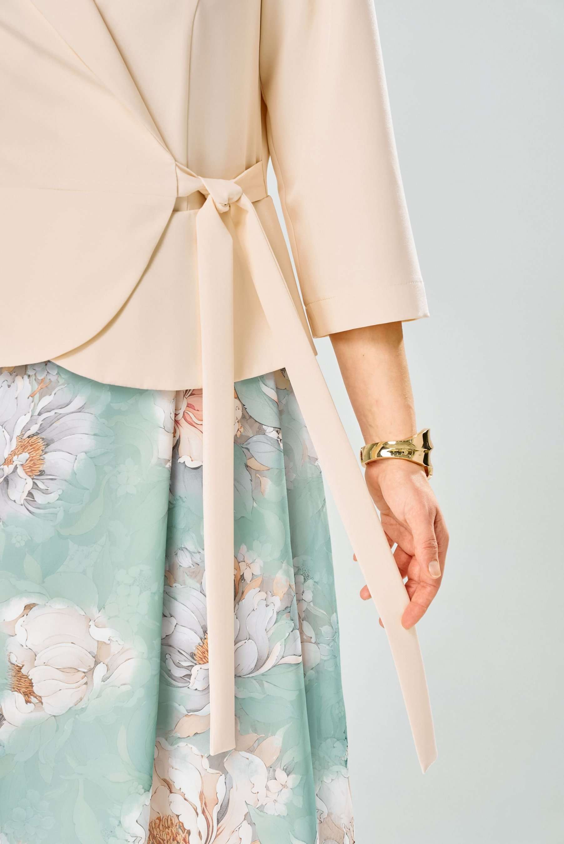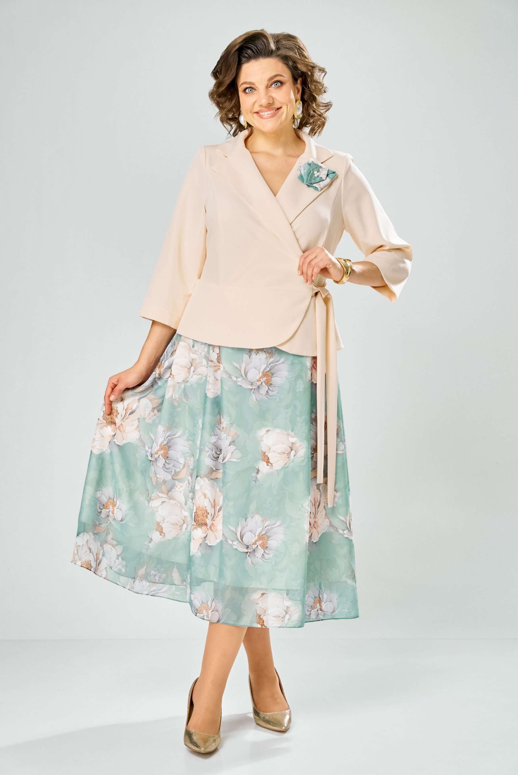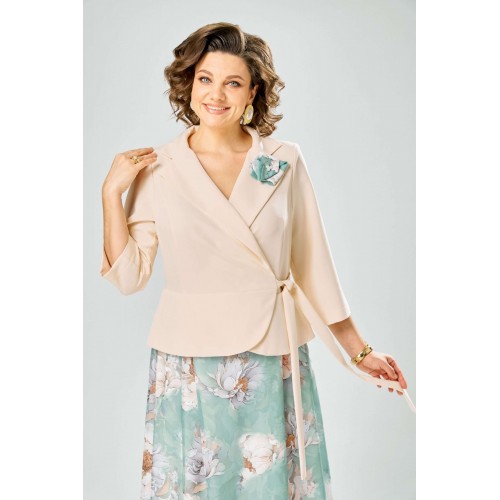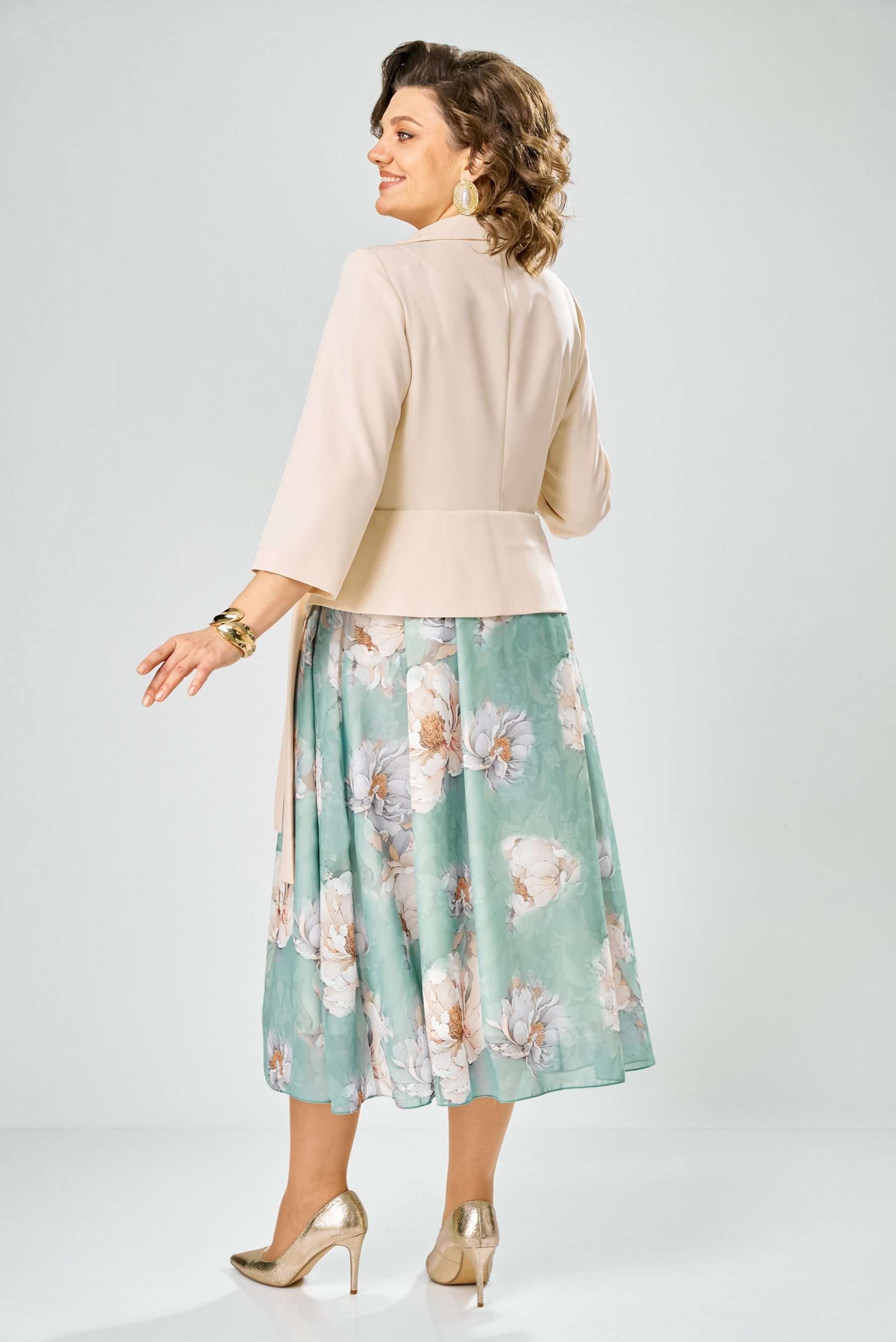 Элегантное женское платье, выполнено в виде имитации костюма из двух видов ткани. Лиф из плательной ткани, юбка из шифона. Платье с запахом, горловина с воротником пиджачного типа с отложными лацканами. Рукава втачные, длина 3/4. Юбка со складками по линии талии, расширенная к низу, на подкладке. По линии талии вставлен завязывающийся пояс. Длина платья – 124 см Длина рукава от горловины – 47.5 см