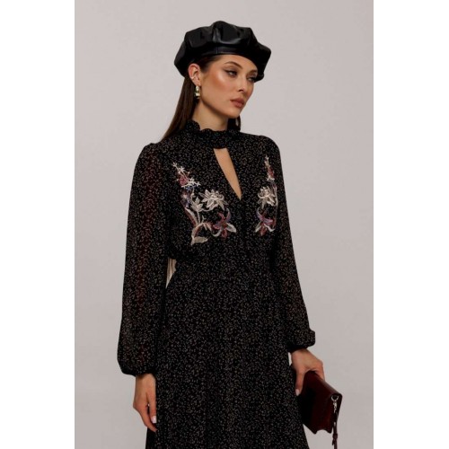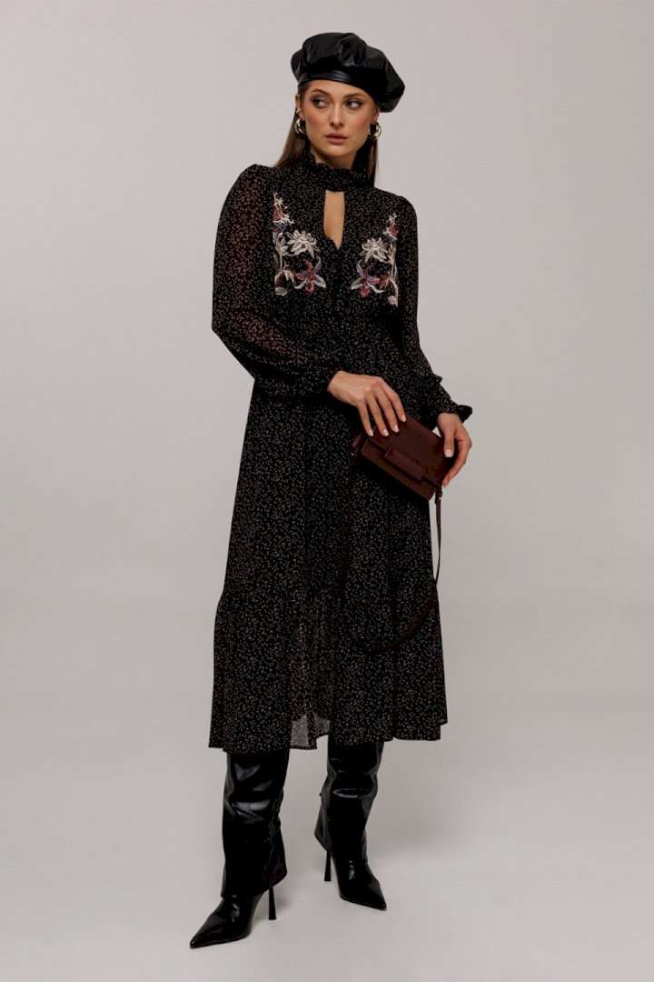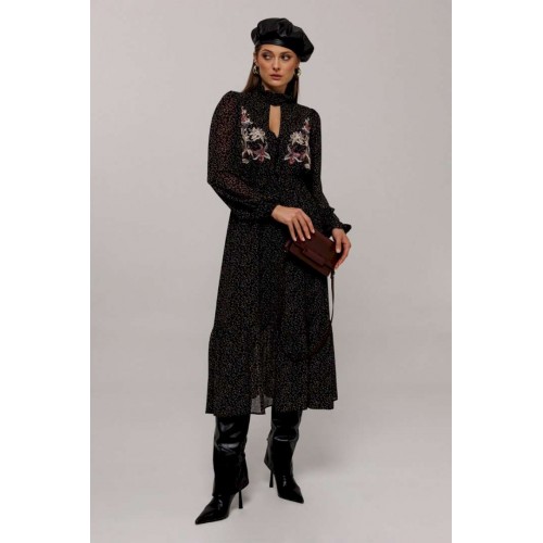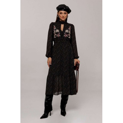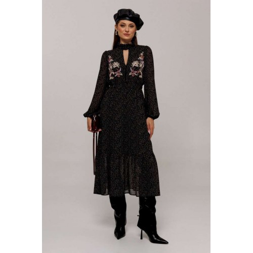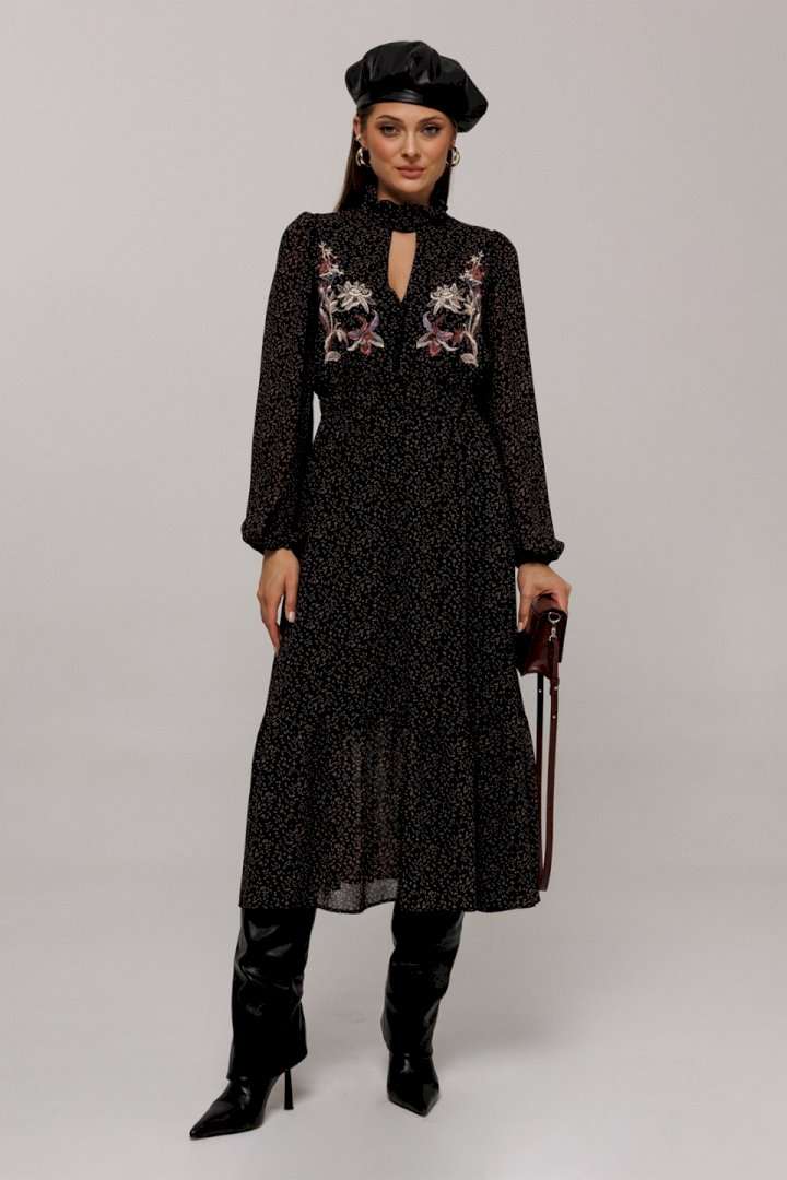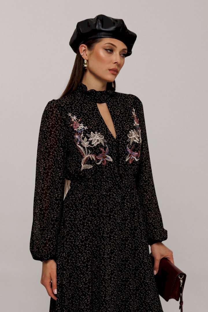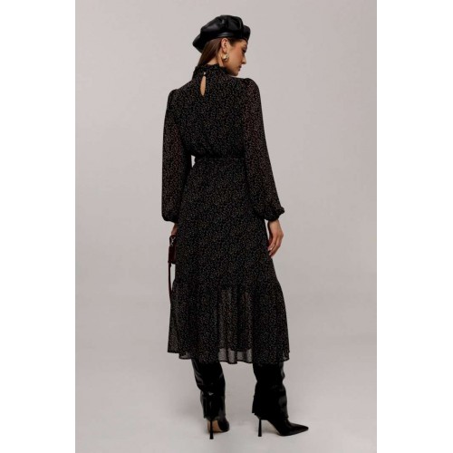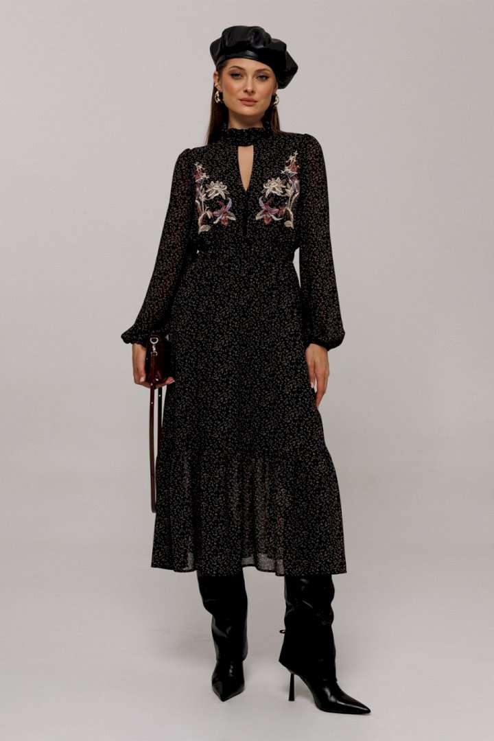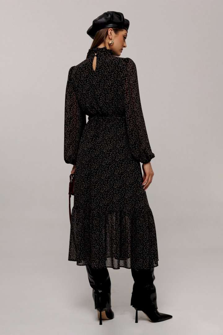 Элегантное черное платье с деликатным мелким цветочным принтом создаст утонченный образ для любого мероприятия. Особенности дизайна включают втачные рукава со сборками, придающими объем как по окату, так и по нижнему краю, где рукав заканчивается на стильной резинке. Силуэт платья полуприлегающий, отрезной по линии талии с расширенной нижней частью, что придает утонченную динамику. Лиф с V-образным вырезом и имитацией пуговиц украшает верхнюю часть платья, а стойка с рюшей и застежкой добавляет изысканности горловине. По талии расположена выставка с резинками, которая переходит в оборку по низу платья, подчеркивая элегантность и женственность силуэта. Платье на подкладке обеспечивает комфорт и идеальную посадку. Идеальный выбор для тех, кто ценит гармонию стиля и комфорта.