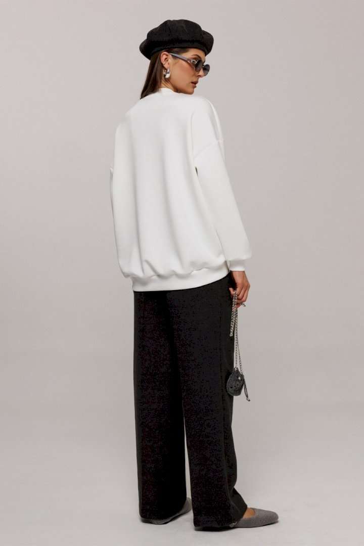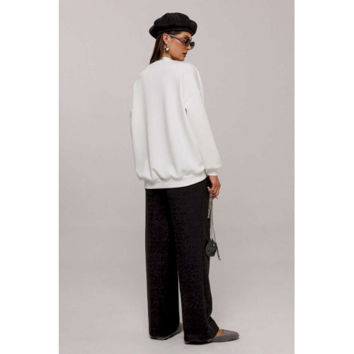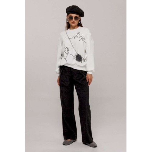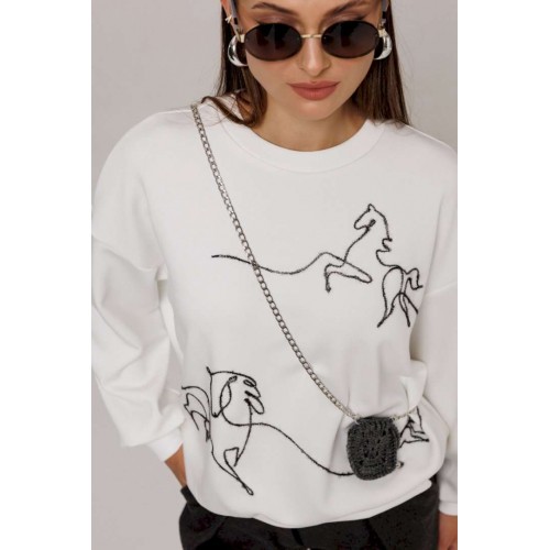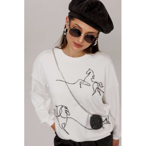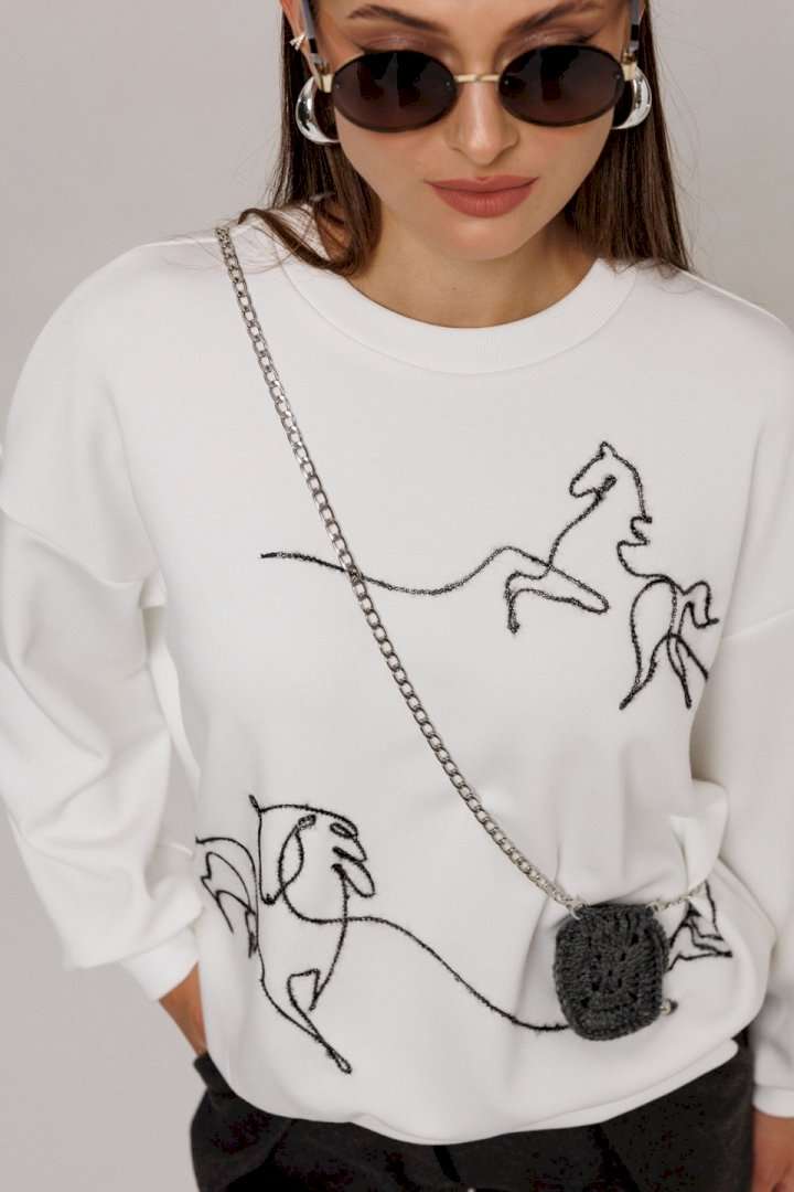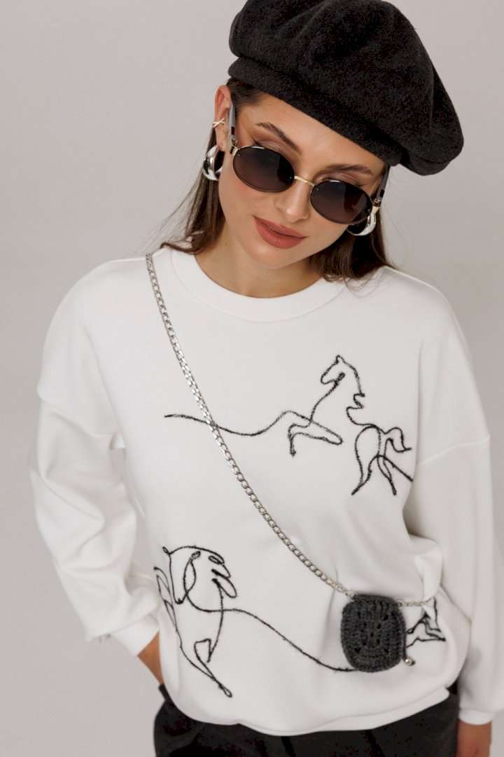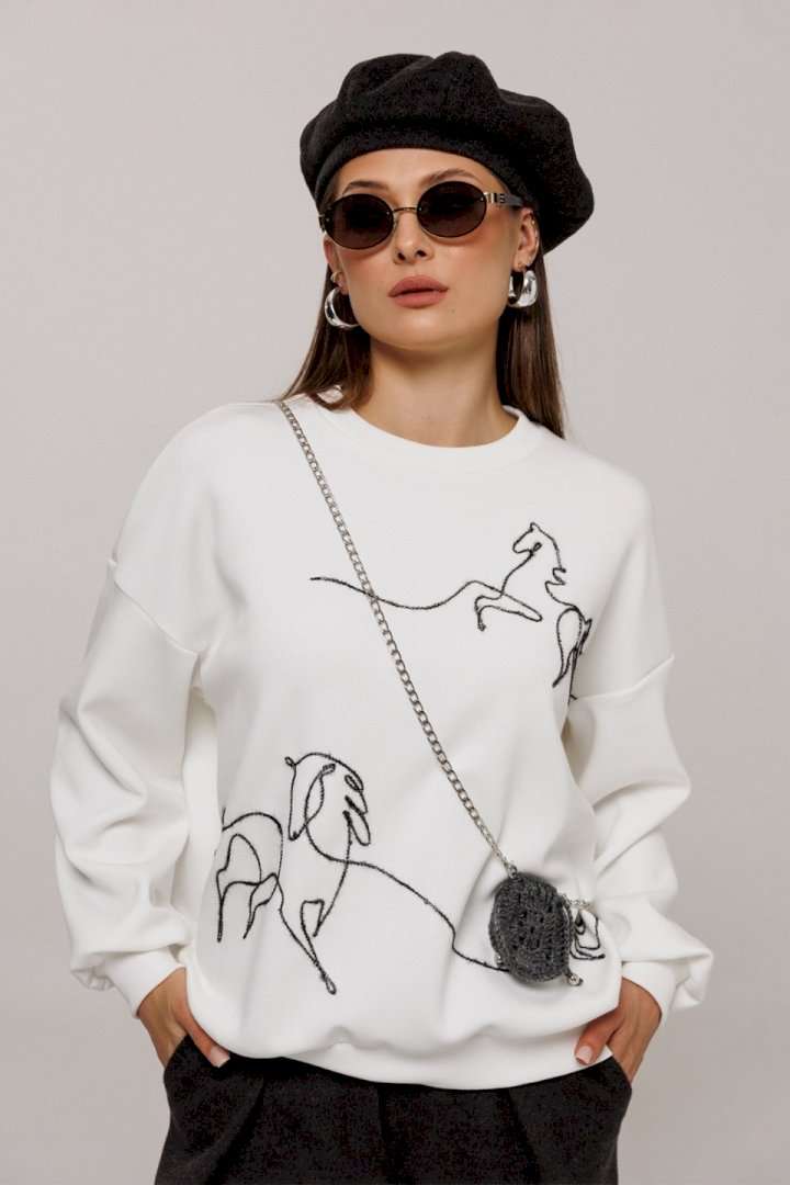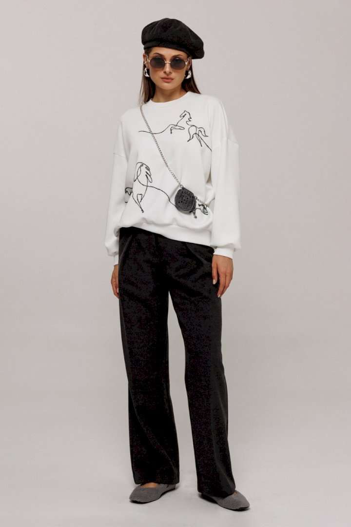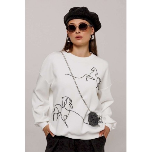 Этот стильный белый джемпер из технологичного трикотажного полотна с эффектом peach подчеркнет ваш утонченный вкус. Прямой силуэт, втачной рукав с манжетами и спущенная линия плеч создают непринужденный образ. Художественная деталь - декоративный шнур \"Кони\", вышитый на передней части, добавляет изысканности. По горловине и нижнему краю изделия притачная планка из отделочной ткани завершает дизайн, делая этот джемпер идеальным выбором для стильных повседневных ансамблей.