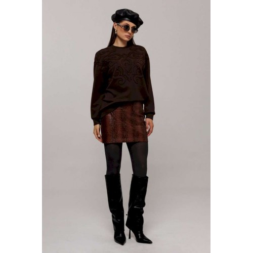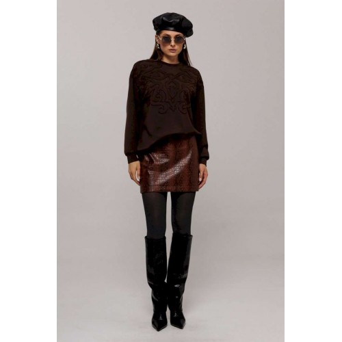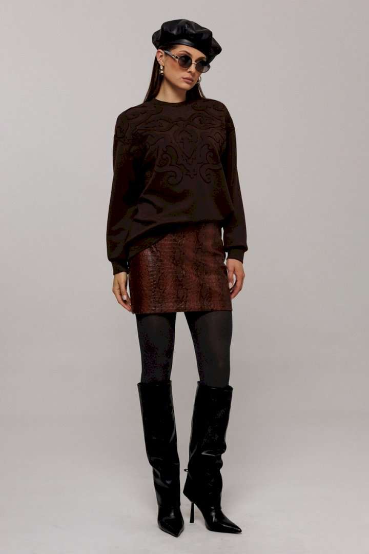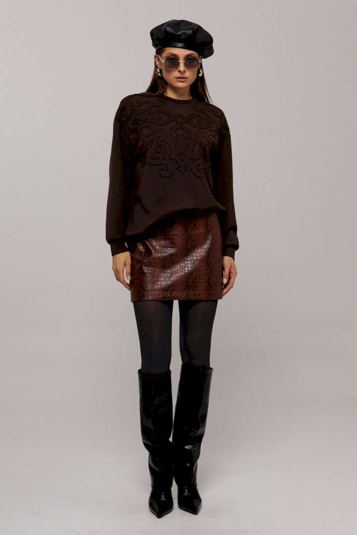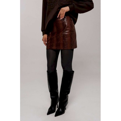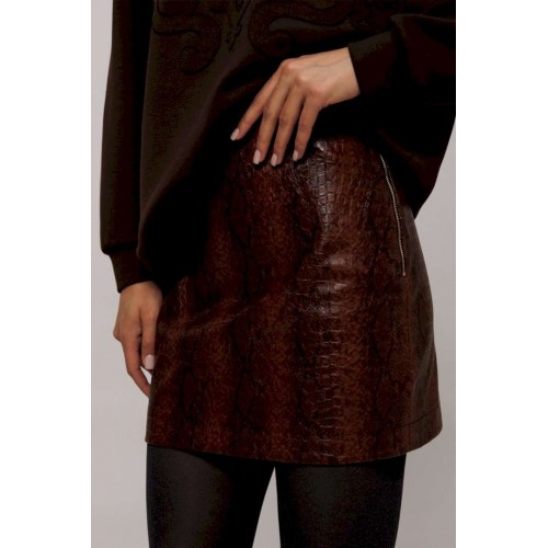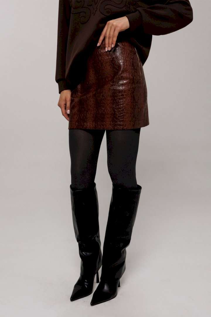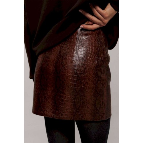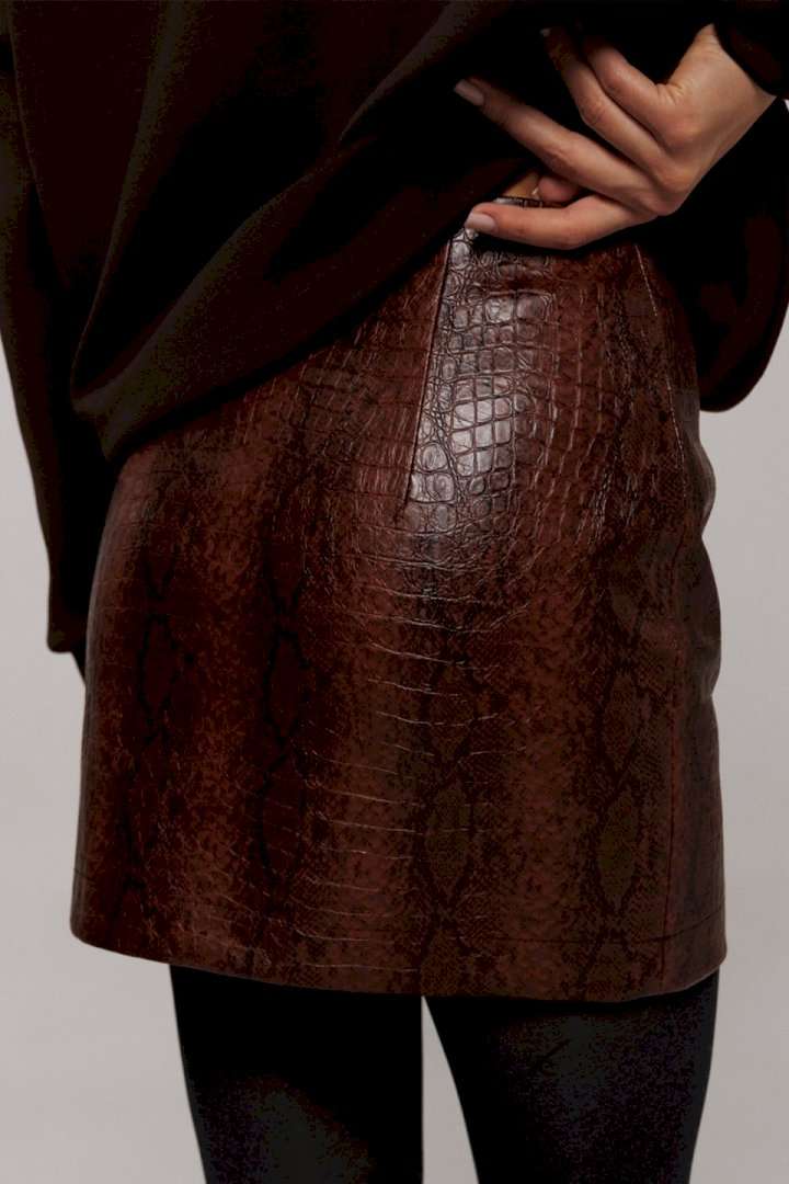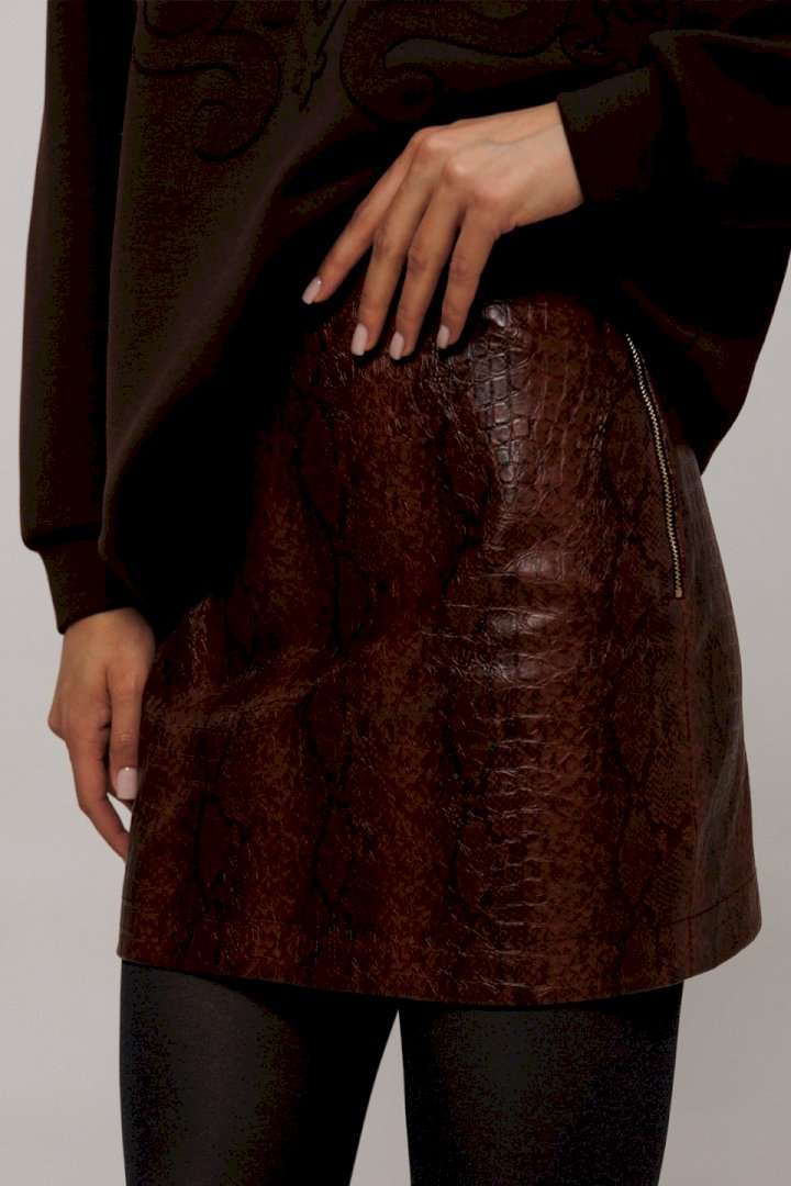Эта стильная юбка А-силуэта изготовлена из качественной эко-кожи коричневого цвета с имитацией рептилии, что добавляет наряду утонченности и оригинальности. Модель оснащена удобной застежкой на металлическую тесьму-молнию в боковом шве. Верх юбки оформлен аккуратной обтачкой, которая придает изделию законченный вид, а вытачка по задней половинке обеспечивает идеальную посадку. Юбка без подкладки, что делает её идеальным выбором для теплой погоды или для ношения с колготками в прохладные дни.