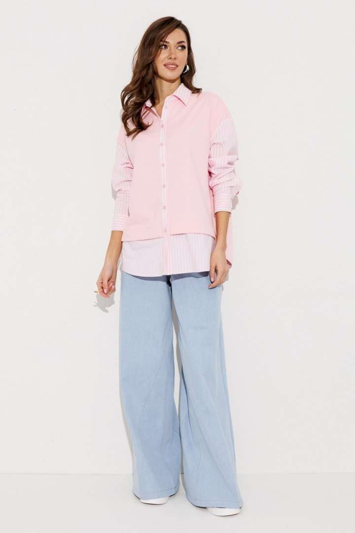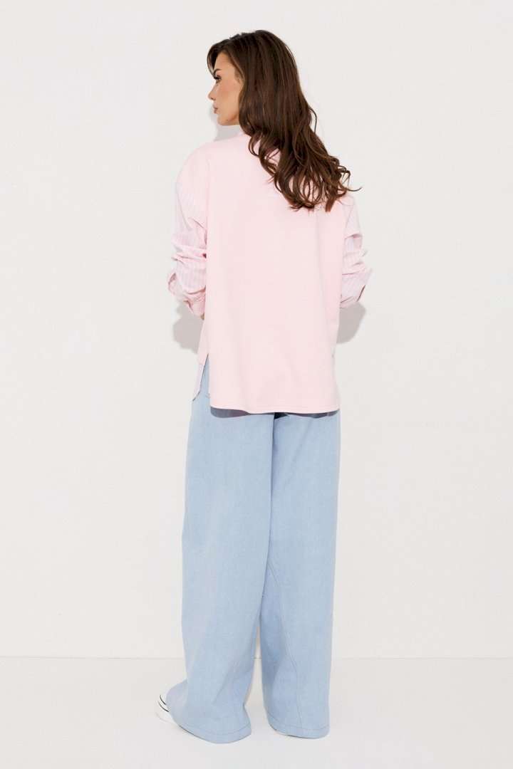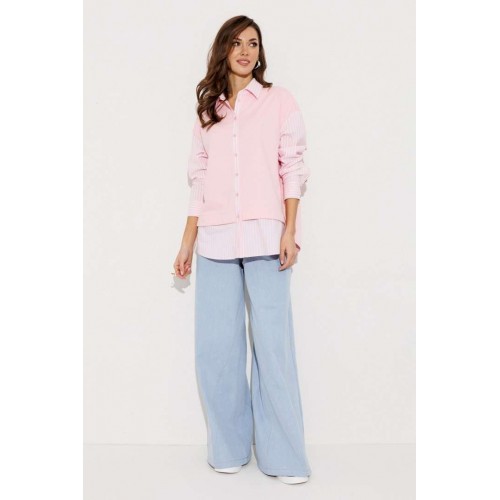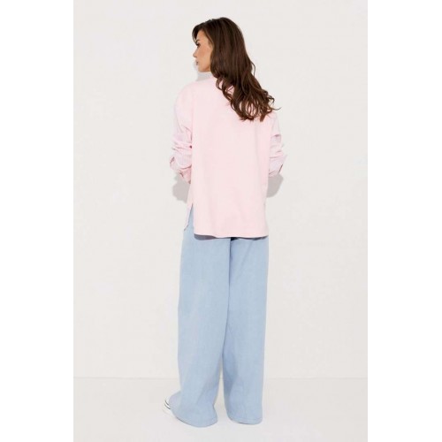 Блузка, комбинированная прямого силуэта, с втачным одношовным рукавом, со складкой и манжетой, с застежкой на петли-пуговицы и спущенной линией плеча. Полочка из трикотажа и рубашечной ткани с центральной застежкой на петли-пуговицы и вышивкой "Самолет". Спинка из трикотажа с печатью "BUTER". Воротник рубашечный отложной на стойке. Спинка и полочка с фигурным низом. Внизу по боковым швам обработаны разрезы.