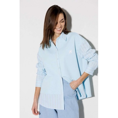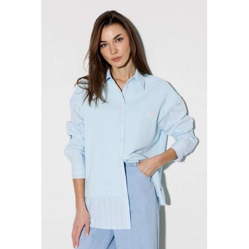 Блузка, комбинированная прямого силуэта, с втачным одношовным рукавом, со складкой и манжетой, с застежкой на петли-пуговицы и спущенной линией плеча. Полочка из трикотажа и рубашечной ткани с центральной застежкой на петли-пуговицы и вышивкой "Самолет". Спинка из трикотажа с печатью "BUTER". Воротник рубашечный отложной на стойке. Спинка и полочка с фигурным низом. Внизу по боковым швам обработаны разрезы.