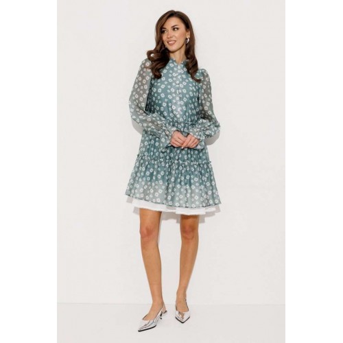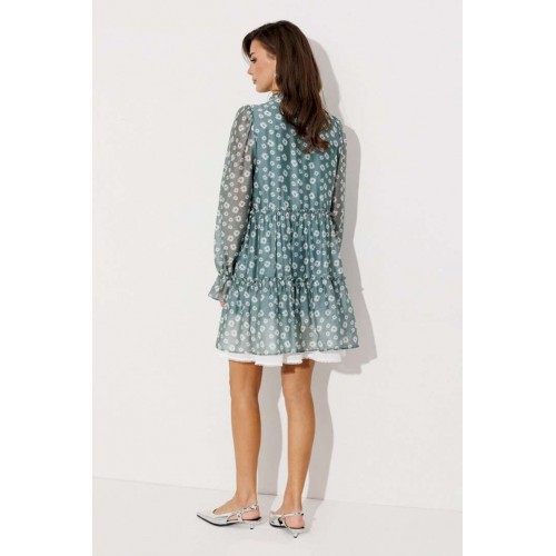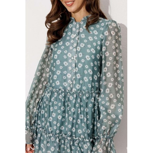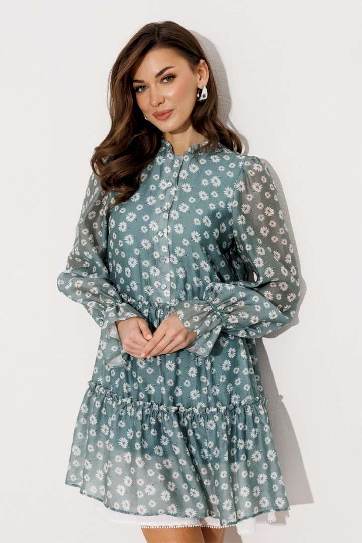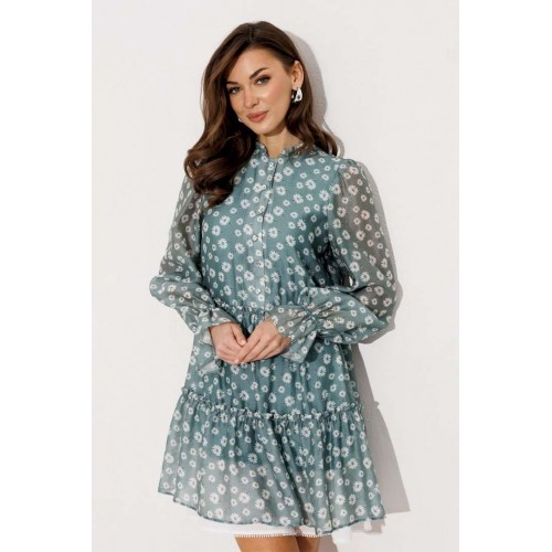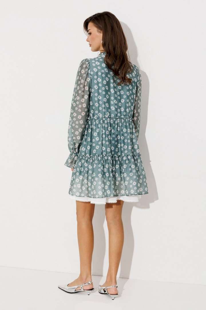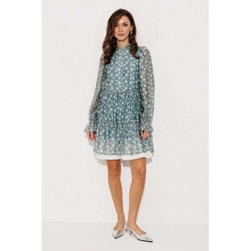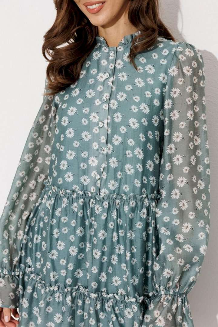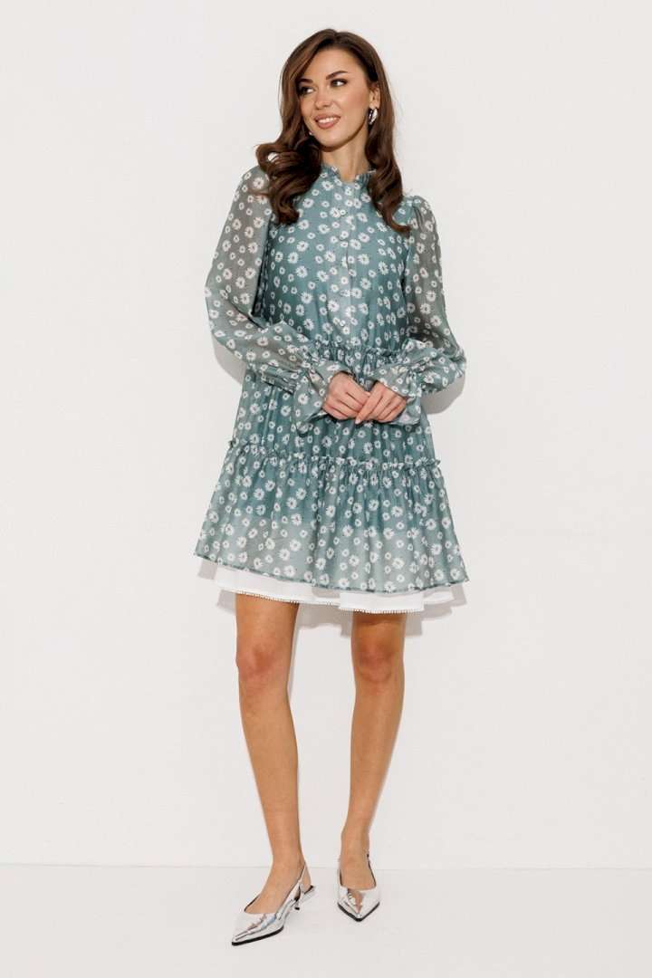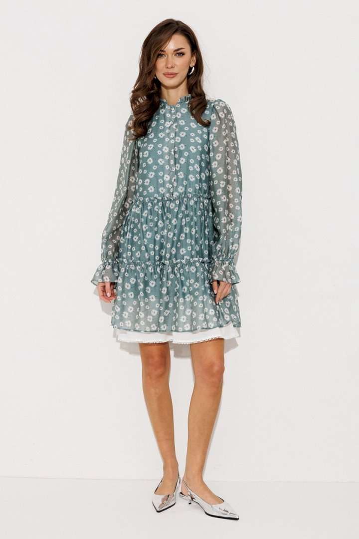 Платье шифоновое А-силуэта, отрезное по линии талии с рюшей. Втачной длинный рукав со сборкой по окату и внизу на резинке. По переду лиф с центральной застежкой на петли-пуговицы. Полочка и спинка с притачными слегка присборенным воланом с рюшей из основной ткани и воланом из отделочной ткани с пришитым к нему кружевом по низу платья. Воротник стойка с рюшей. Платье на подкладке.