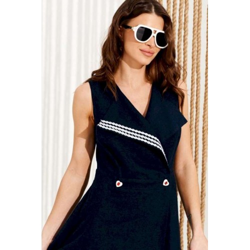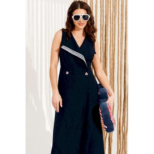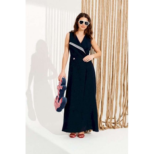 Платье полуприлегающего силуэта, расклешенное книзу, отрезное по линии талии, с V-образным вырезом горловины и лацканами, центральной двубортной застежкой на петли и пуговицы. Правый лацкан оформлен декоративной тесьмой. Перед и спинка с талиевыми вытачками. Спинка со средним швом. Длина изделия на модели вдоль середины спинки — 139 см (допустимое отклонение +/- 1 см).
