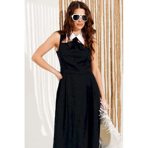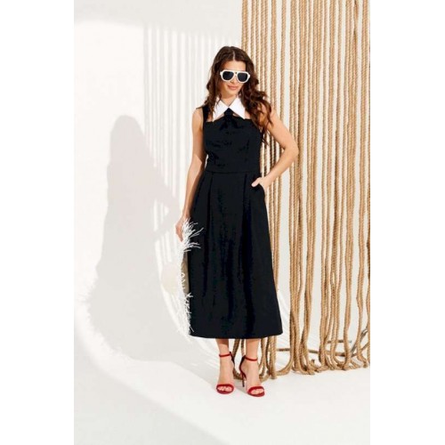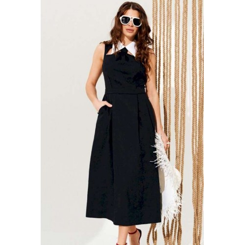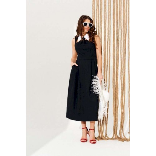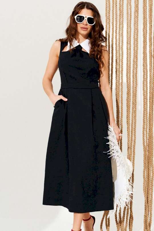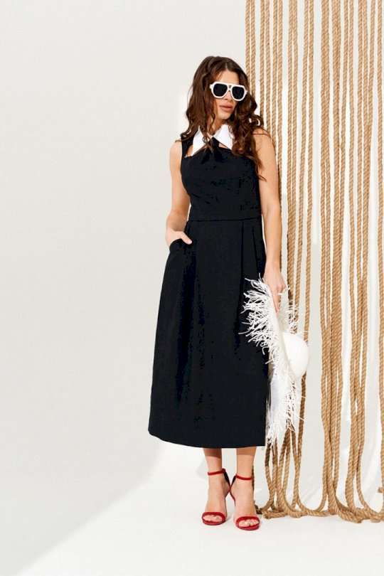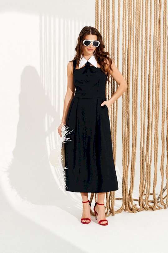 Платье полуприлегающего силуэта, расклешенное книзу, с застежкой на тесьму-молнию в среднем шве спинки. Воротник отложной из контрастной ткани, на отрезной стойке. Стойка воротника с застежкой на навесные петли и пуговицы по спинке. Лиф переда с рельефами, декоративными вырезами и сборкой с имитацией галстука. Нижняя деталь переда с боковыми карманами с отрезными бочками и односторонними складками. Спинка со средним швом и талиевыми вытачками. Длина изделия на модели вдоль середины спинки — 127 см (допустимое отклонение +/- 1 см)