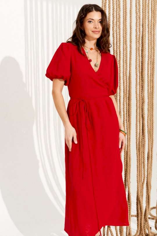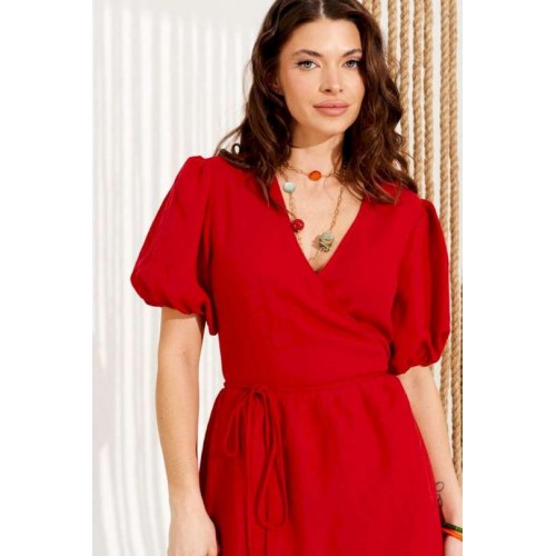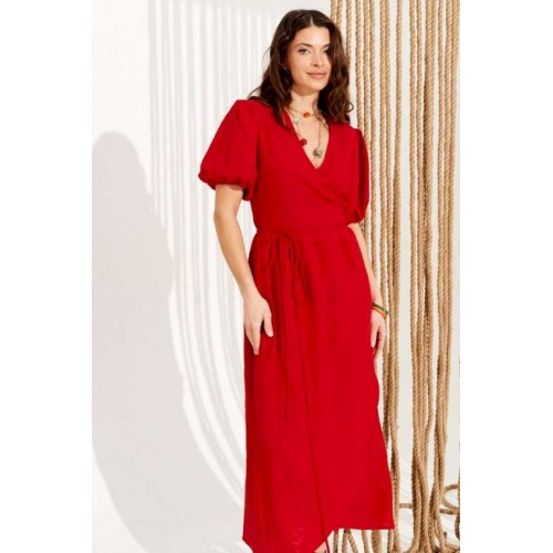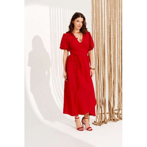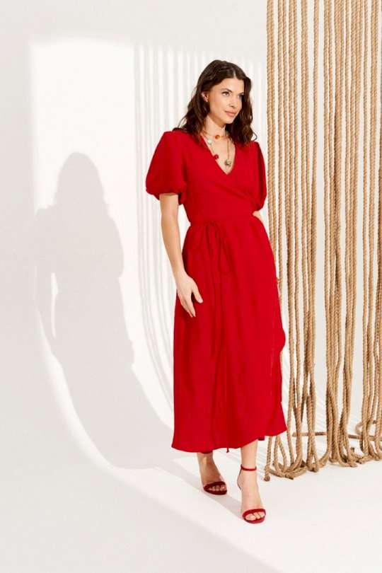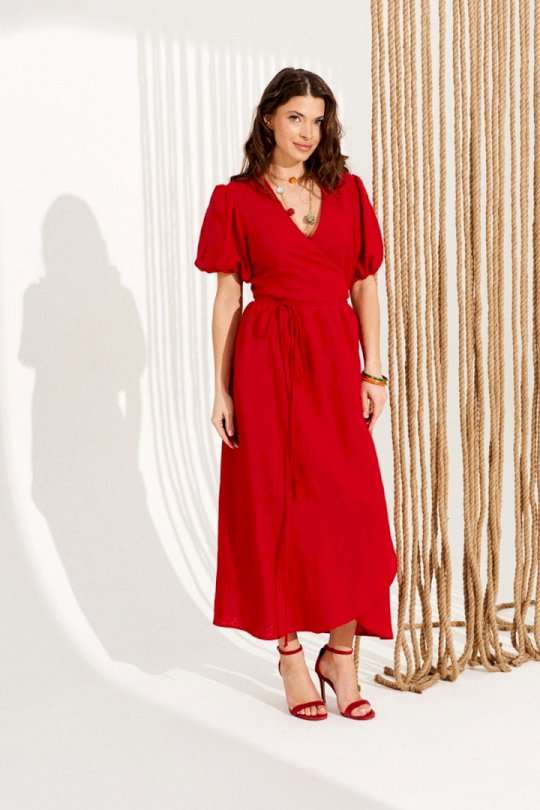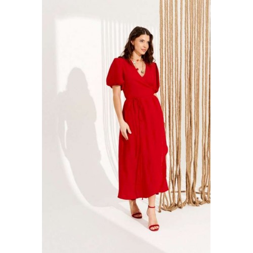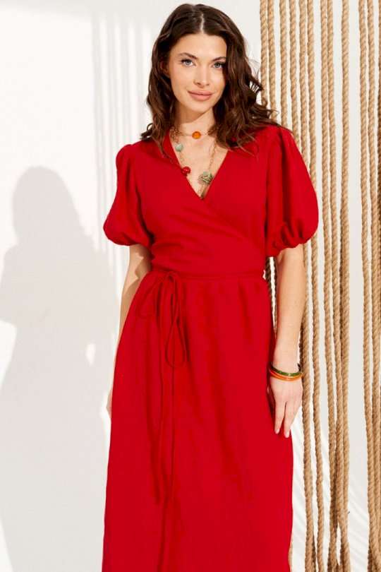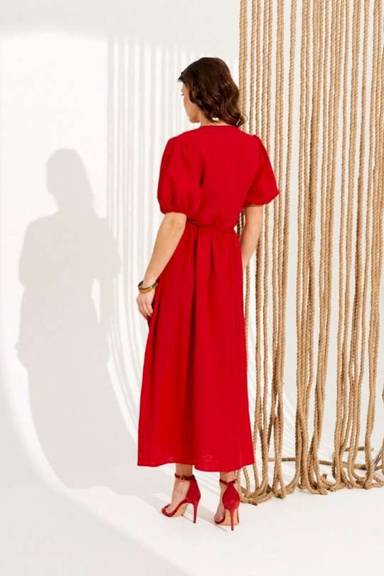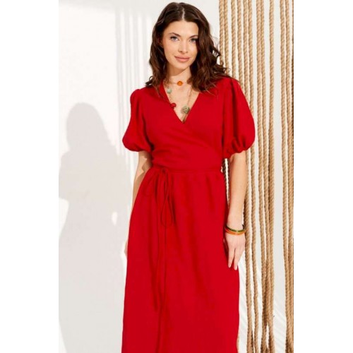 Платье умеренного объема, приталенного силуэта, расклешенное книзу, отрезное по линии талии, с запахом на завязках и V-образным вырезом горловины. Верхние детали переда с талиевыми вытачками. Нижняя часть переда и спинки со сборкой по верхнему срезу. Приталенность регулируется завязками. Рукав втачной, короткий, со сборкой по верхнему и нижнему срезу. Нижний срез рукава на резинке. Длина изделия на модели вдоль середины спинки — 130 см (допустимое отклонение +/- 1 см)