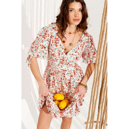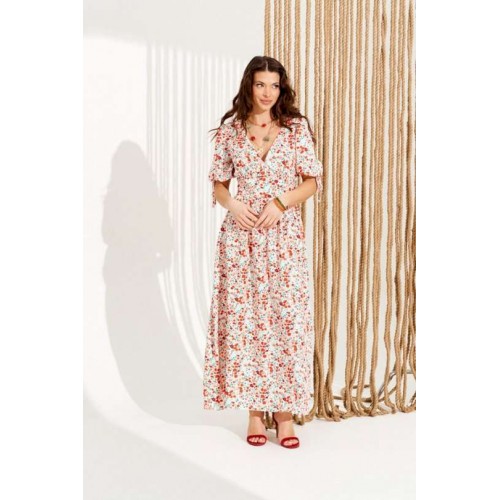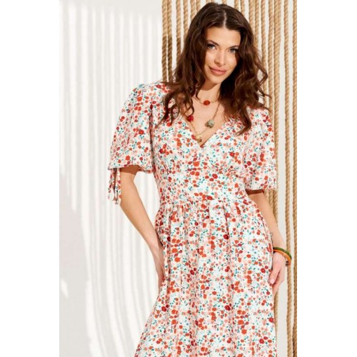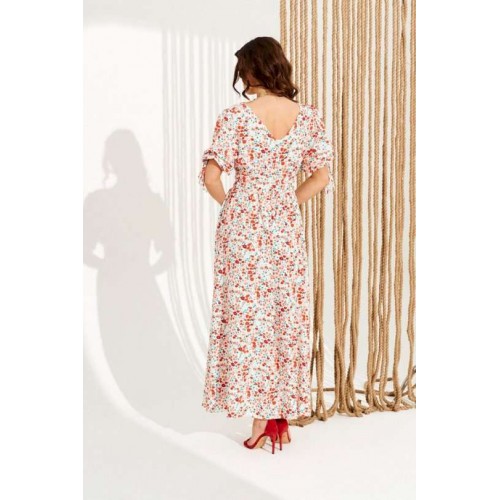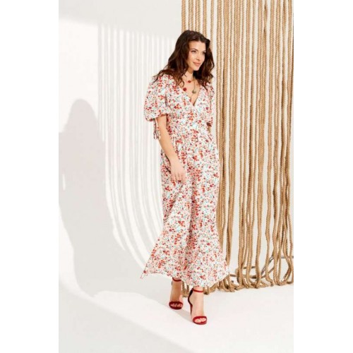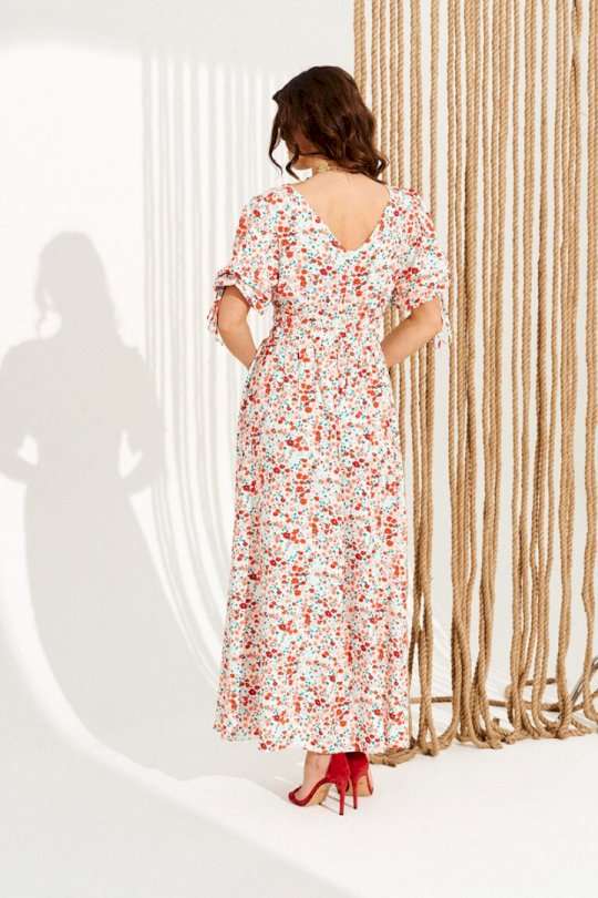 Платье полуприлегающего силуэта, расклешенное книзу, отрезное по линии талии, с V-образным вырезом горловины и застежкой на тесьму-молнию в среднем шве спинки. Перед с отрезным лифом. Спинка со средним швом и отрезным поясом со сборкой на эластичную тесьму. Рукав втачной короткий, со сборкой по верхнему и нижнему срезам. Нижний срез рукава на резинке, дополнен декоративными завязками. Длина изделия на модели от плечевого шва до низа — 134,5 см (допустимое отклонение +/- 1 см)
