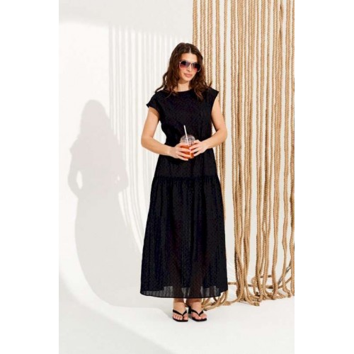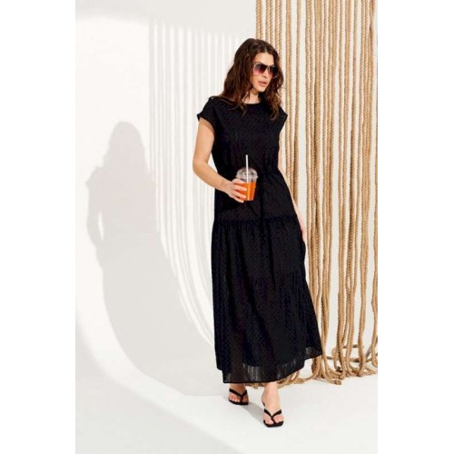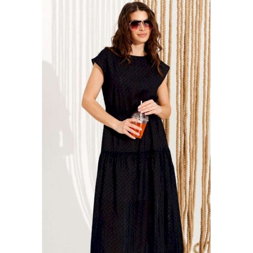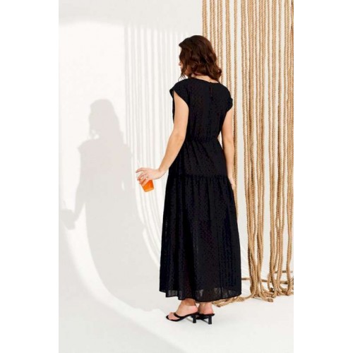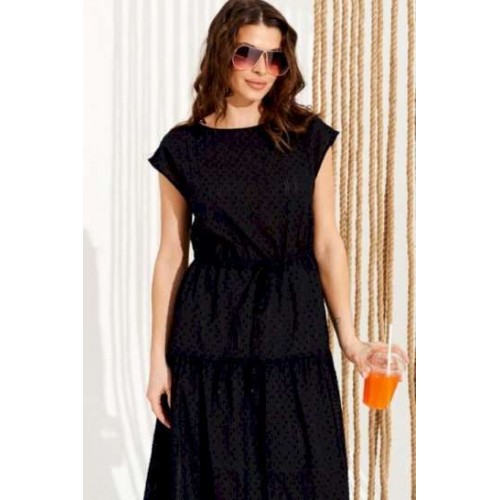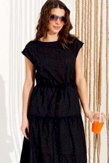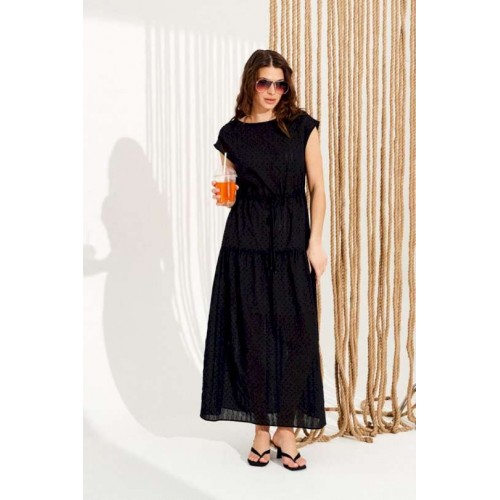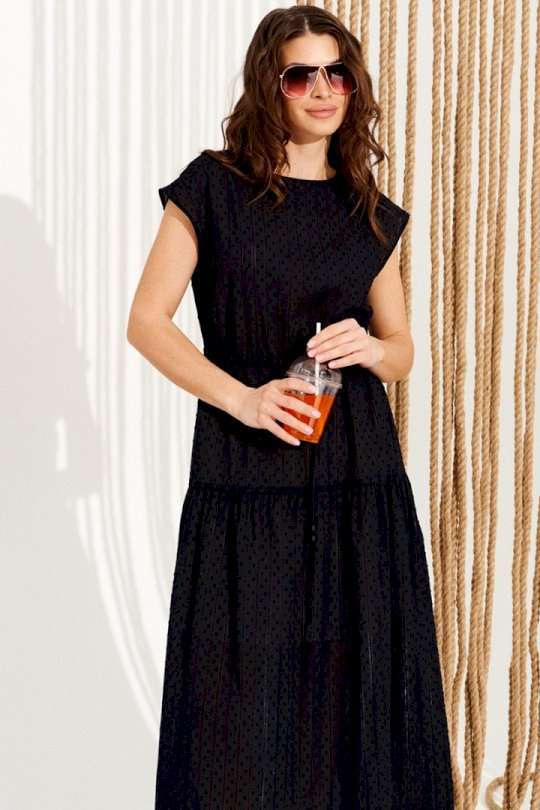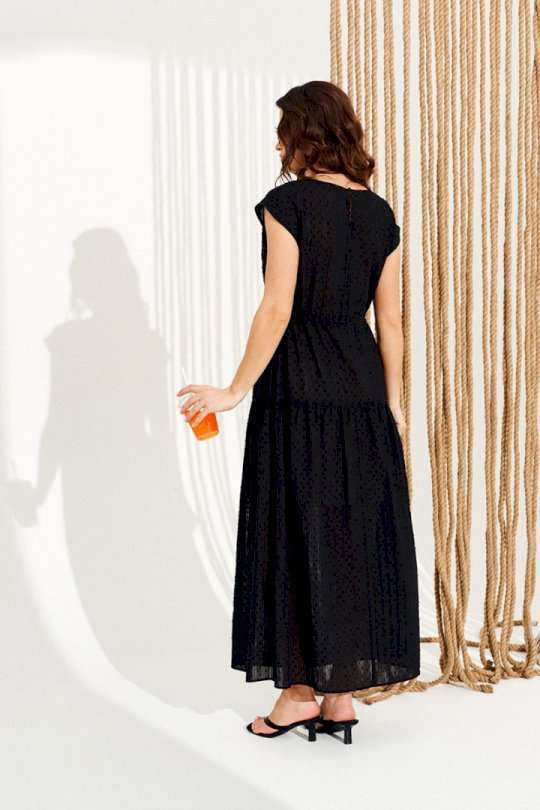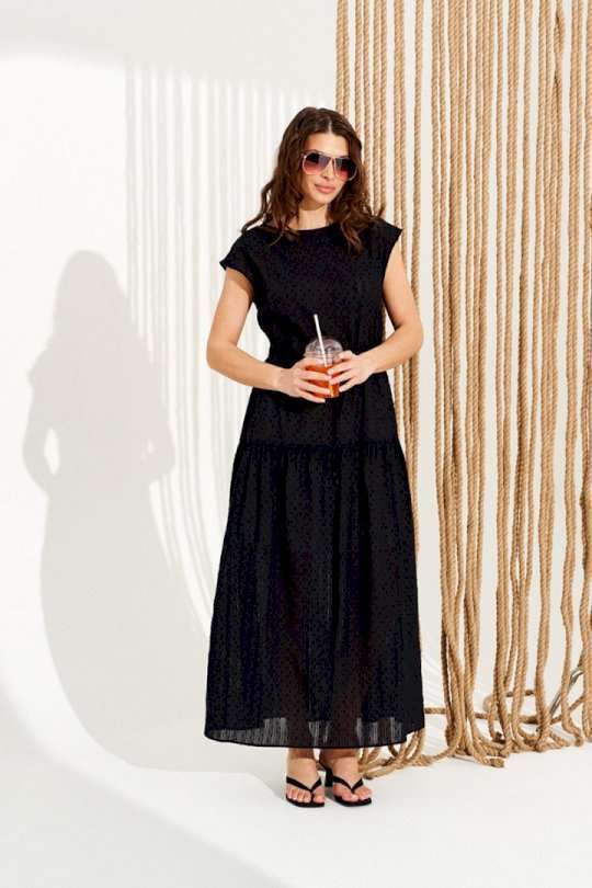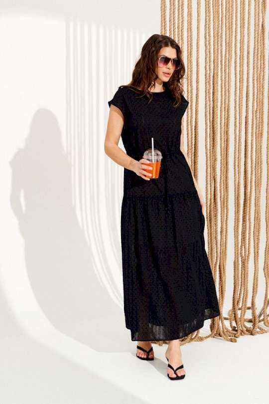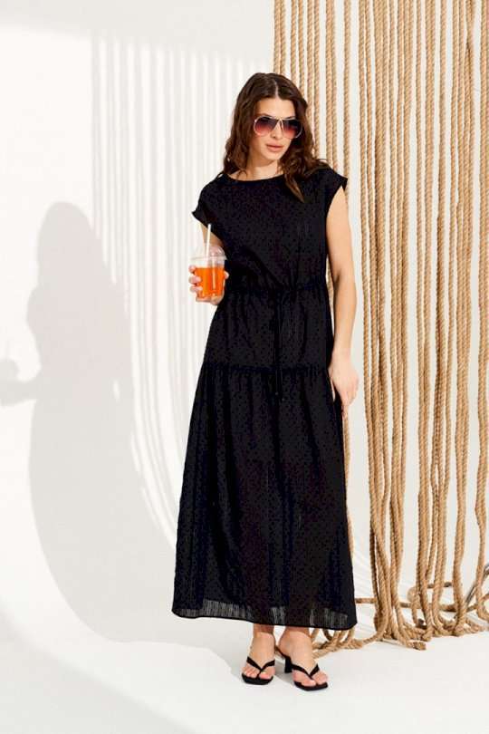 Платье умеренного объема, приталенного силуэта, отрезное по линии талии, со спущенной линией плеча и подъюбником из хлопковой подкладки. Нижний срез переда и спинки оформлен воланами. Приталенность регулируется кулиской со шнуром-завязкой и наконечниками. Длина изделия на модели вдоль середины спинки — 129,5 см (допустимое отклонение +/- 1 см)