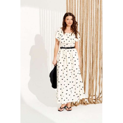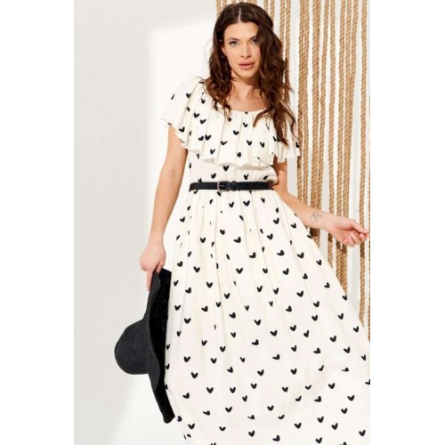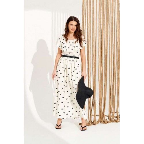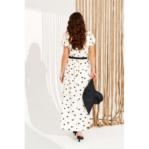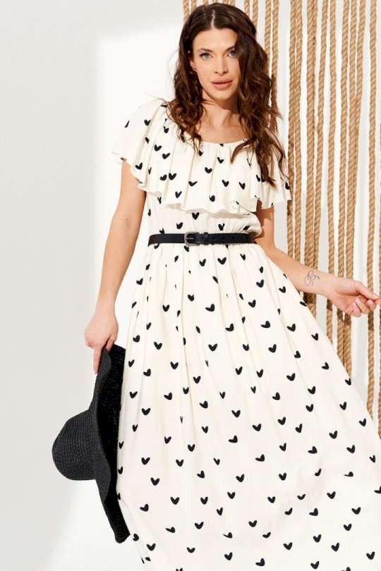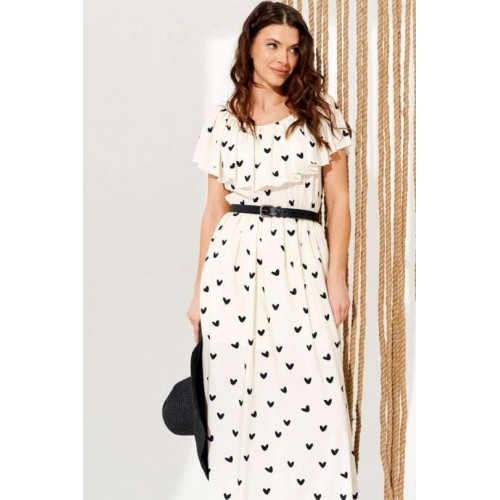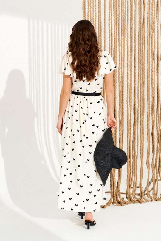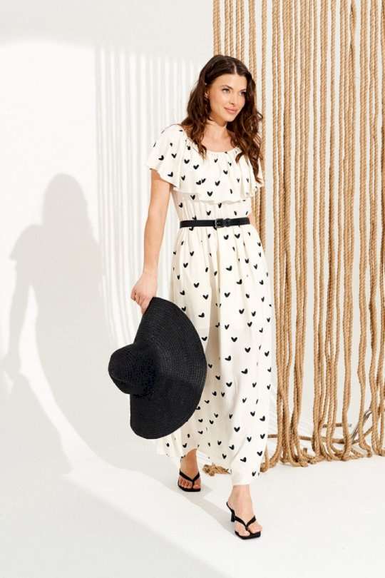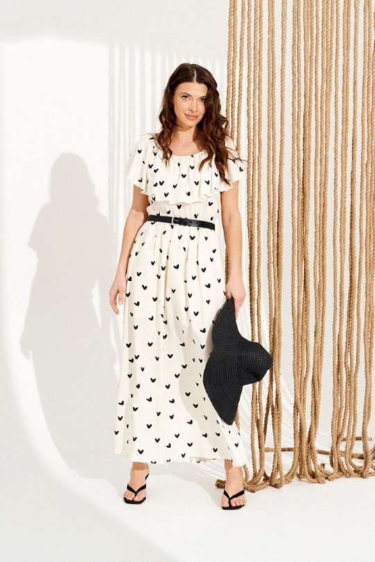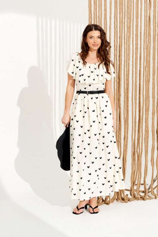 Платье умеренного объема, приталенного силуэта, отрезное по линии талии, с застежкой на тесьму-молнию в среднем шве спинки, с круглым вырезом горловины, на подкладке. Горловина по переду и спинке оформлена воланом. Верхняя деталь переда с нагрудными вытачками. Шов по талии со сборкой на резинку. В боковых швах расположены карманы. Длина изделия на модели вдоль середины спинки — 126,5 см (допустимое отклонение +/- 1 см)