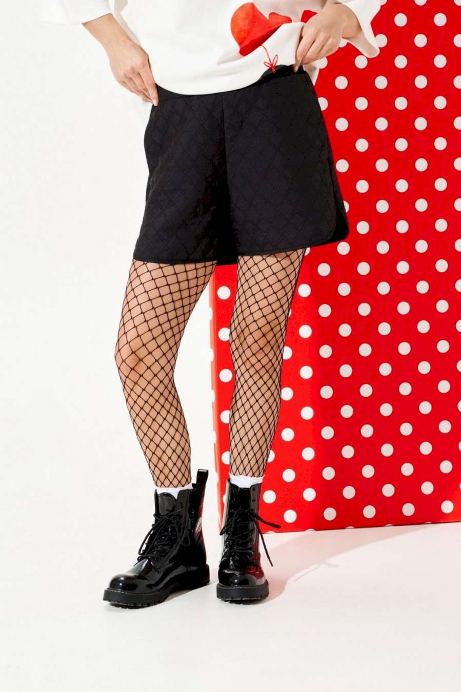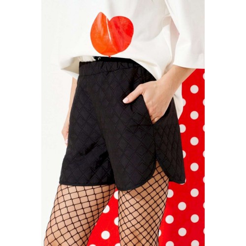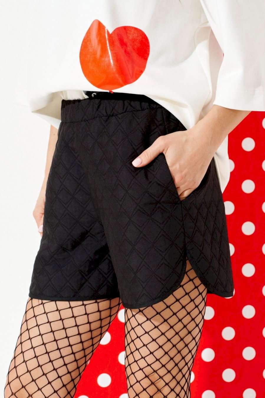 Шорты свободного объема, слегка расширены к низу, с фигурной линией низа. В боковых швах расположены карманы. Пояс притачной на резинке. Нижний срез шорт обработан окантовочной бейкой.