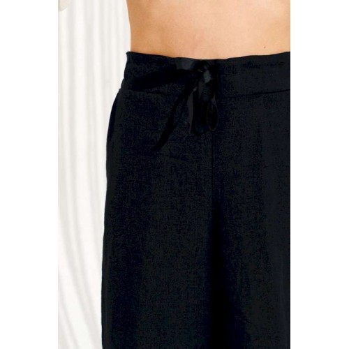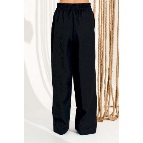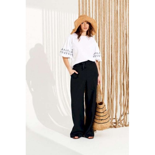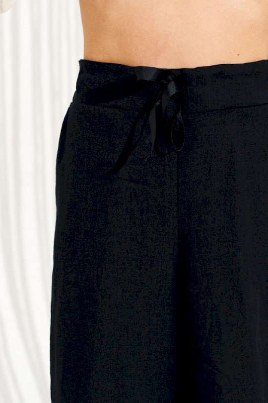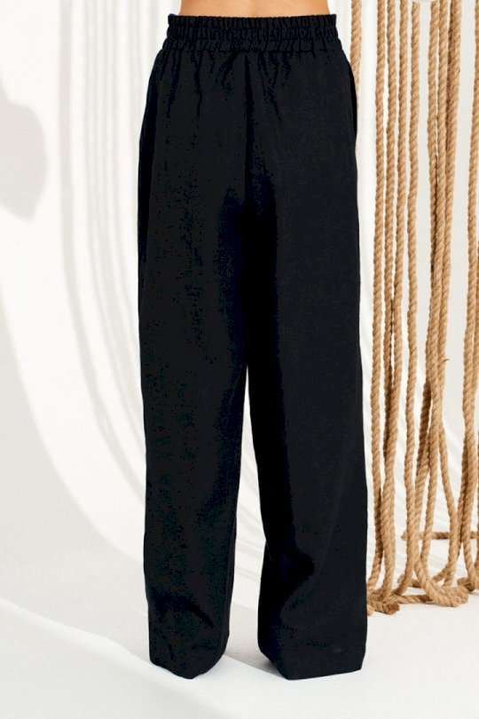 Брюки умеренного объема, прямого силуэта. На передних половинках выполнены боковые карманы с отрезным бочком. Пояс притачной, с резинкой по спинке и петлями по переду, в которые продета декоративная тесьма. Длина изделия на модели вдоль бокового шва с учетом пояса — 110,5 см (допустимое отклонение +/- 1 см).