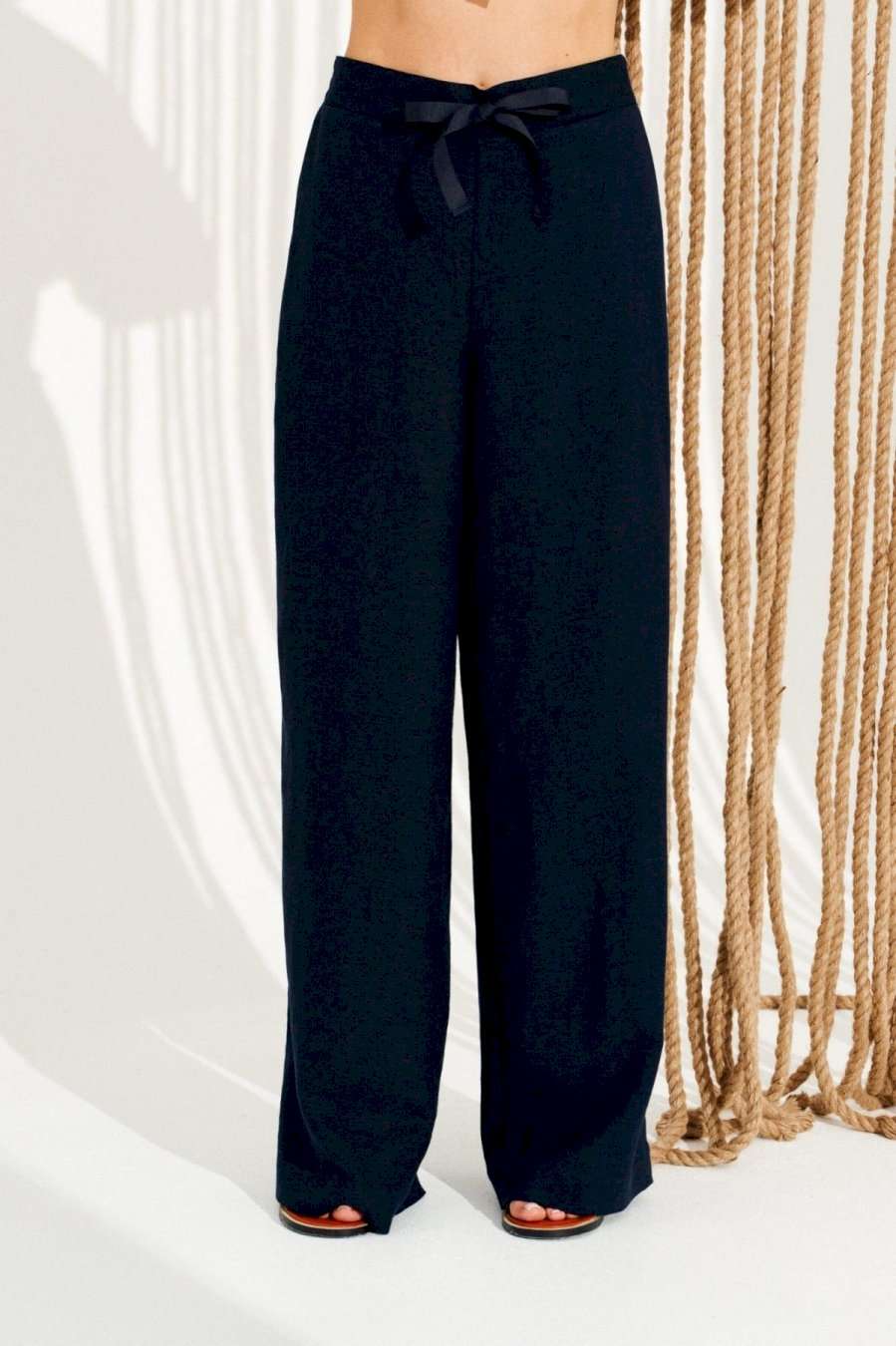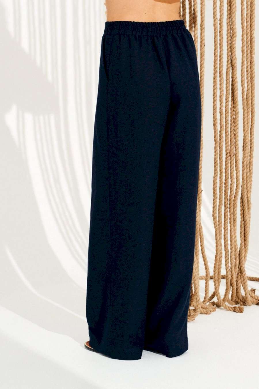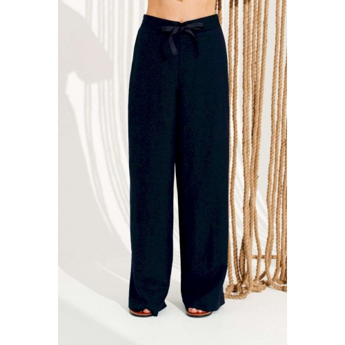 Брюки умеренного объема, прямого силуэта. На передних половинках выполнены боковые карманы с отрезным бочком. Пояс притачной, с резинкой по спинке и петлями по переду, в которые продета декоративная тесьма. Длина изделия на модели вдоль бокового шва с учетом пояса — 110,5 см (допустимое отклонение +/- 1 см)