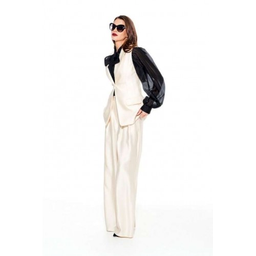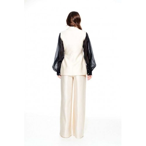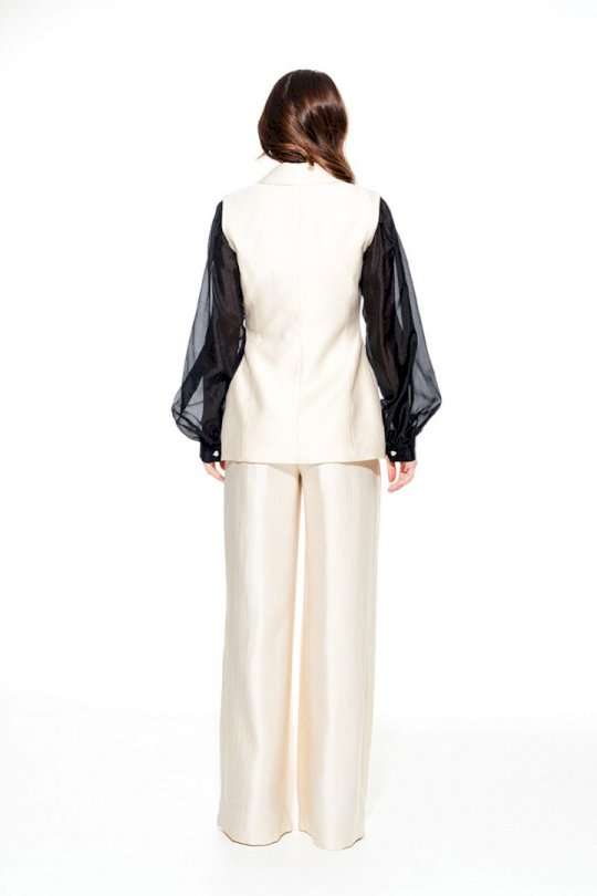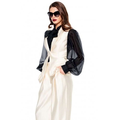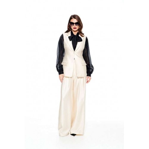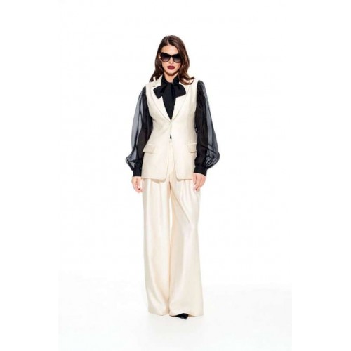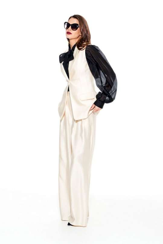 Жилет умеренного объема, приталенного силуэта, однобортный, с центральной застежкой на 1 петлю и 1 пуговицу, отложным воротником и лацканами пиджачного типа, на подкладке. Полочки с талиевыми вытачками и прорезными карманами с клапаном и двумя обтачками. Спинка со средним швом и талиевыми вытачками.