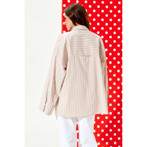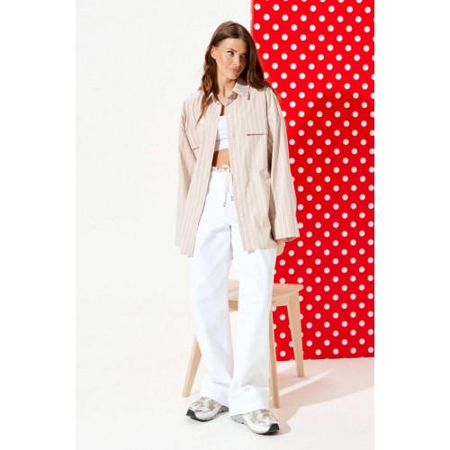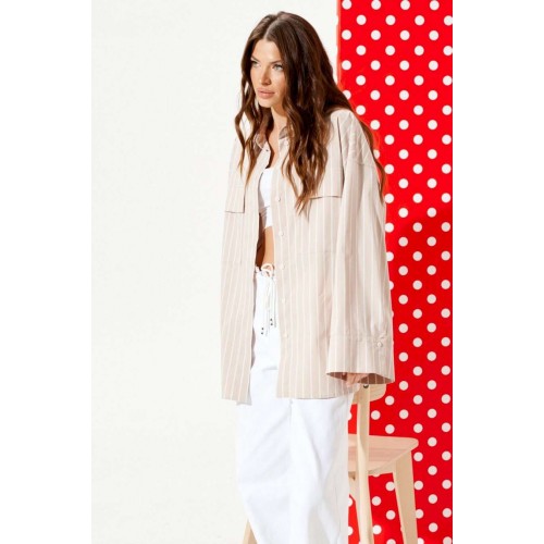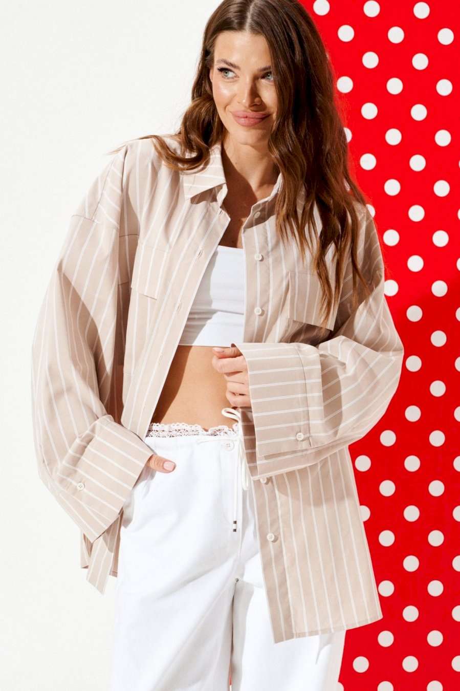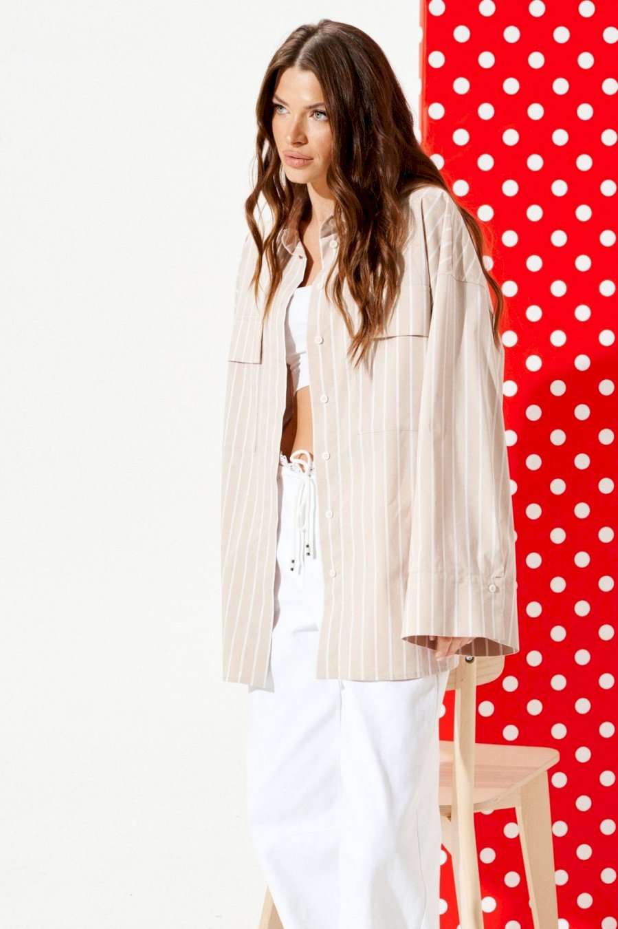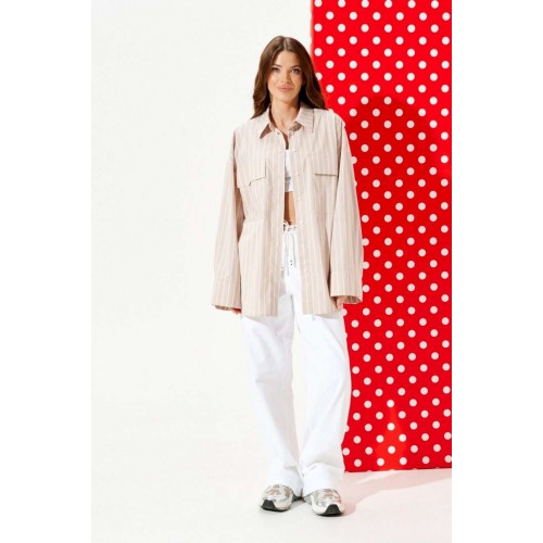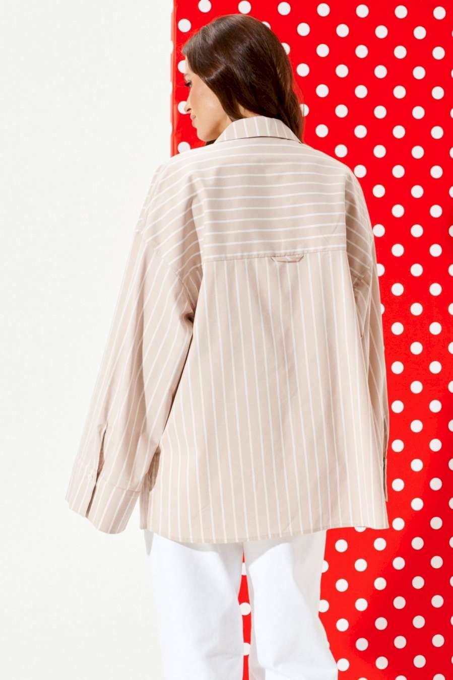 Блузка свободного объема, прямого силуэта, с центральной застежкой на обметанные петли и пуговицы. Воротник «рубашечный» стояче-отложной на отрезной стойке. Детали переда с накладными карманами с клапаном. Спинка с отрезной двойной кокеткой и декоративной шлевкой. Боковые швы заканчиваются разрезом. Рукав втачной, одношовный. Нижний срез рукава обработан притачной манжетой. Застежка манжеты на 1 обметанную петлю и 1 пуговицу.