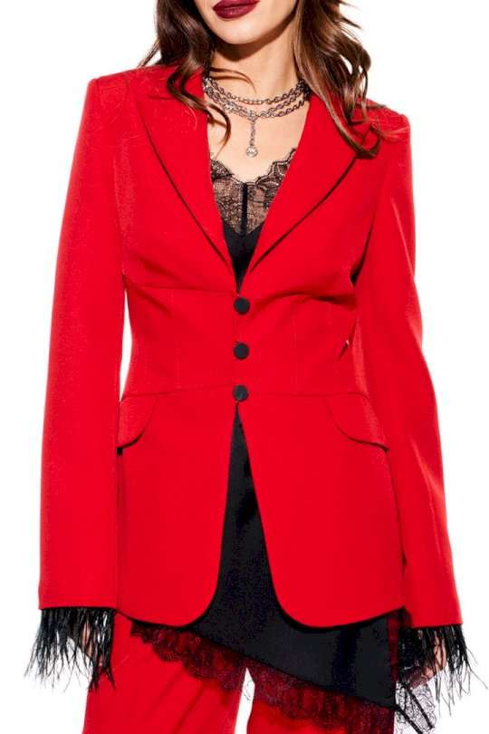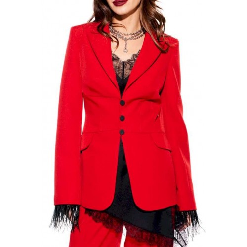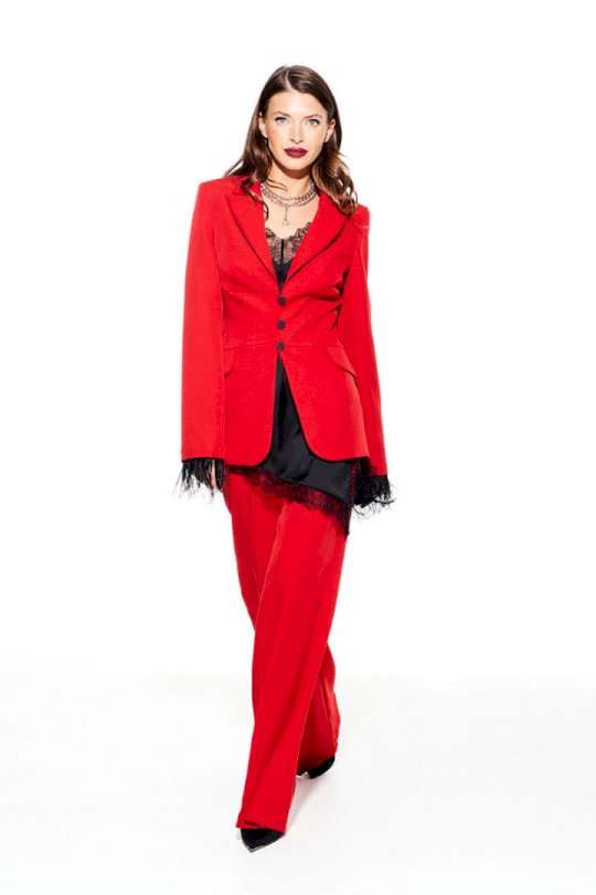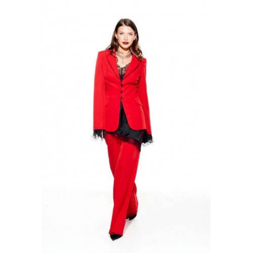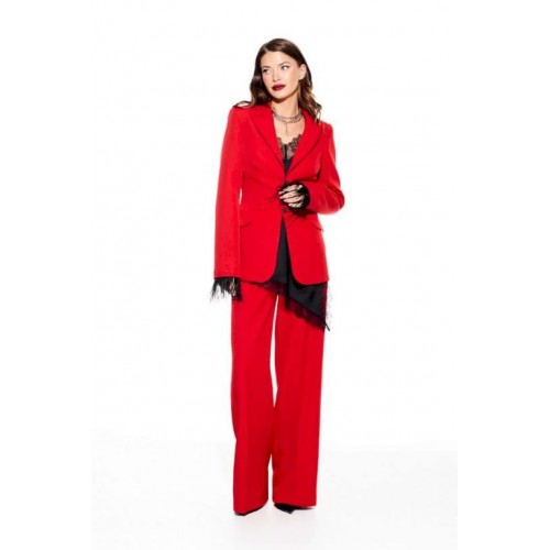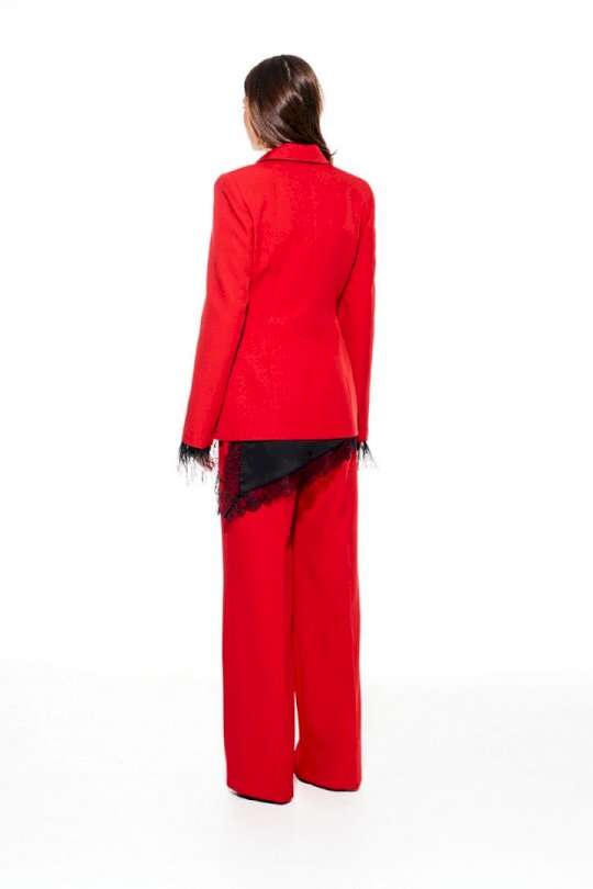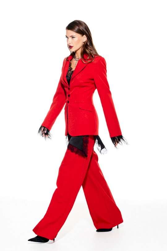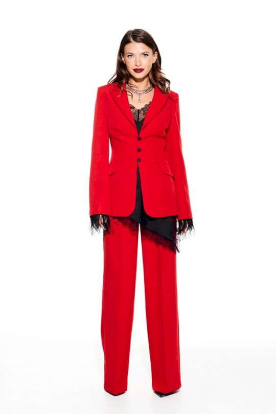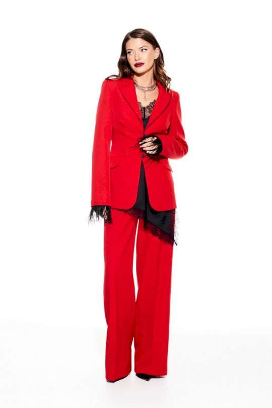 Костюм из костюмно-плательной ткани, 2-предметный, состоящий из жакета и брюк. Жакет приталенного силуэта, с отложным воротником и лацканами пиджачного типа, с центральной застежкой на 3 навесные петли и 3 пуговицы, на подкладке. Перед отрезной, с рельефами, нагрудными вытачками, имитацией кармана с клапаном. Спинка со средним швом и рельефами. Рукав втачной, двухшовный, длинный. Низ рукава со съемной тесьмой из перьев. Брюки умеренного объема, прямого силуэта. На передних и задних половинках заутюжены стрелки. На передних половинках выполнены односторонние складки и боковые карманы с отрезным бочком. Задние половинки с талиевыми вытачками. Застежка – гульфик на молнии. Пояс притачной, с резинкой по спинке, застежкой на крючок и потайную пуговицу.