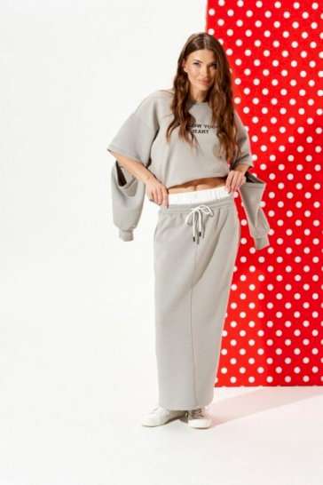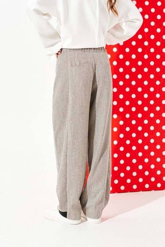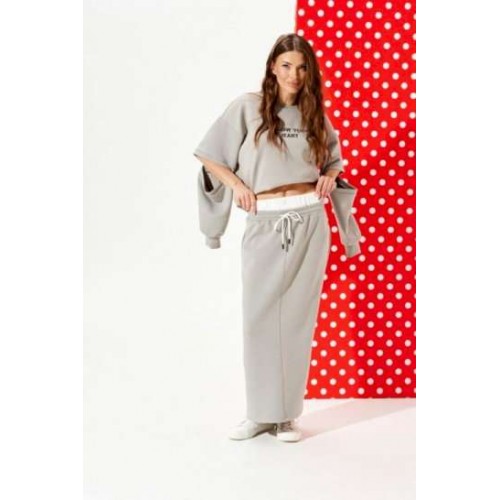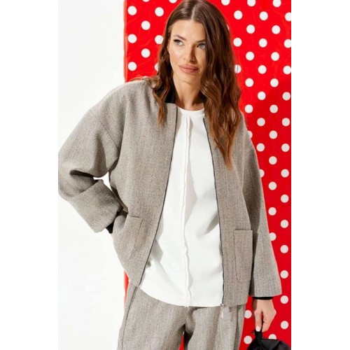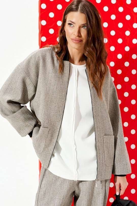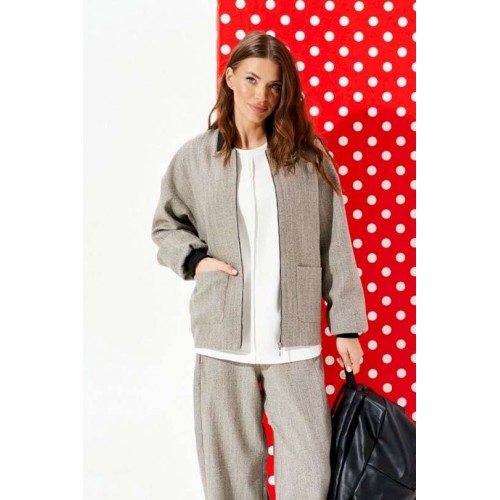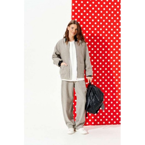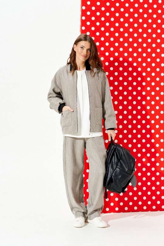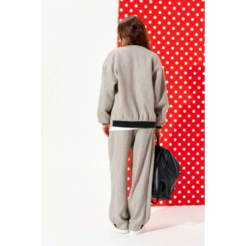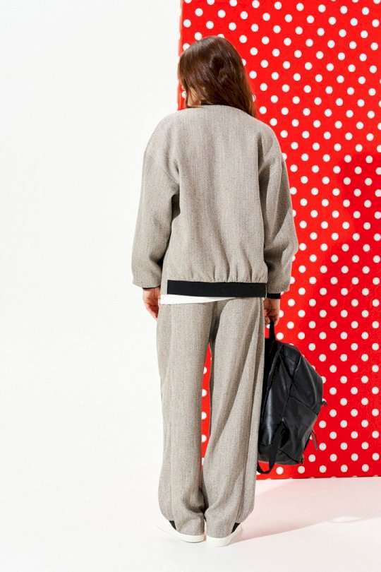 Комплект из костюмной ткани, 2-х предметный, состоящий из бомбера и брюк. Бомбер свободного объема, прямого силуэта, с центральной застежкой на тесьму-молнию, на подкладке. Вырез горловины обработан планкой из полотна «кашкорсе». Детали переда с накладными карманами. Спинка с притачным поясом из полотна «кашкорсе». Брюки свободного объема, слегка заужены книзу. Детали переда с прорезными боковыми карманами. Брюки с отрезной боковой частью по всей длине. Нижний срез боковой детали обработан притачной деталью из полотна «кашкорсе». Детали спинки с фигурной кокеткой, в которой обработаны прорезные карманы. Пояс притачной, на резинке по спинке.