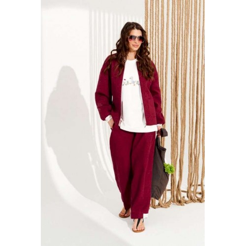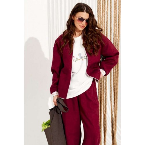Костюм 2-х предметный, состоящий из бомбера и брюк. Бомбер свободного объема, прямого силуэта, с центральной застежкой на тесьму-молнию, на подкладке. Вырез горловины обработан планкой из контрастного материала. Детали переда с накладными карманами. Спинка с притачным поясом из контрастного материала. Брюки свободного объема, слегка заужены книзу. Детали переда с прорезными боковыми карманами. Брюки с отрезной боковой частью по всей длине. Нижний срез боковой детали обработан притачной деталью из контрастного материала. Детали спинки с фигурной кокеткой, в которой обработаны прорезные карманы. Пояс притачной, на резинке по спинке. Длина блузона на модели вдоль середины спинки — 64 см. Длина брюк на модели вдоль бокового шва с учетом пояса — 102 см (допустимое отклонение +/- 1 см).