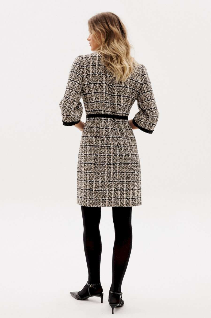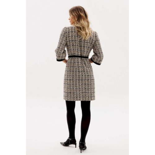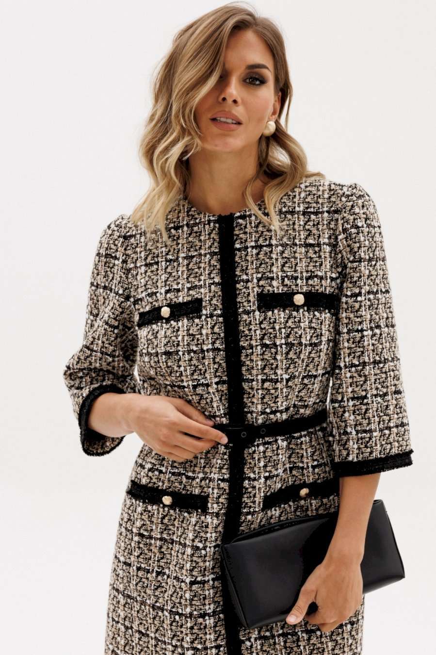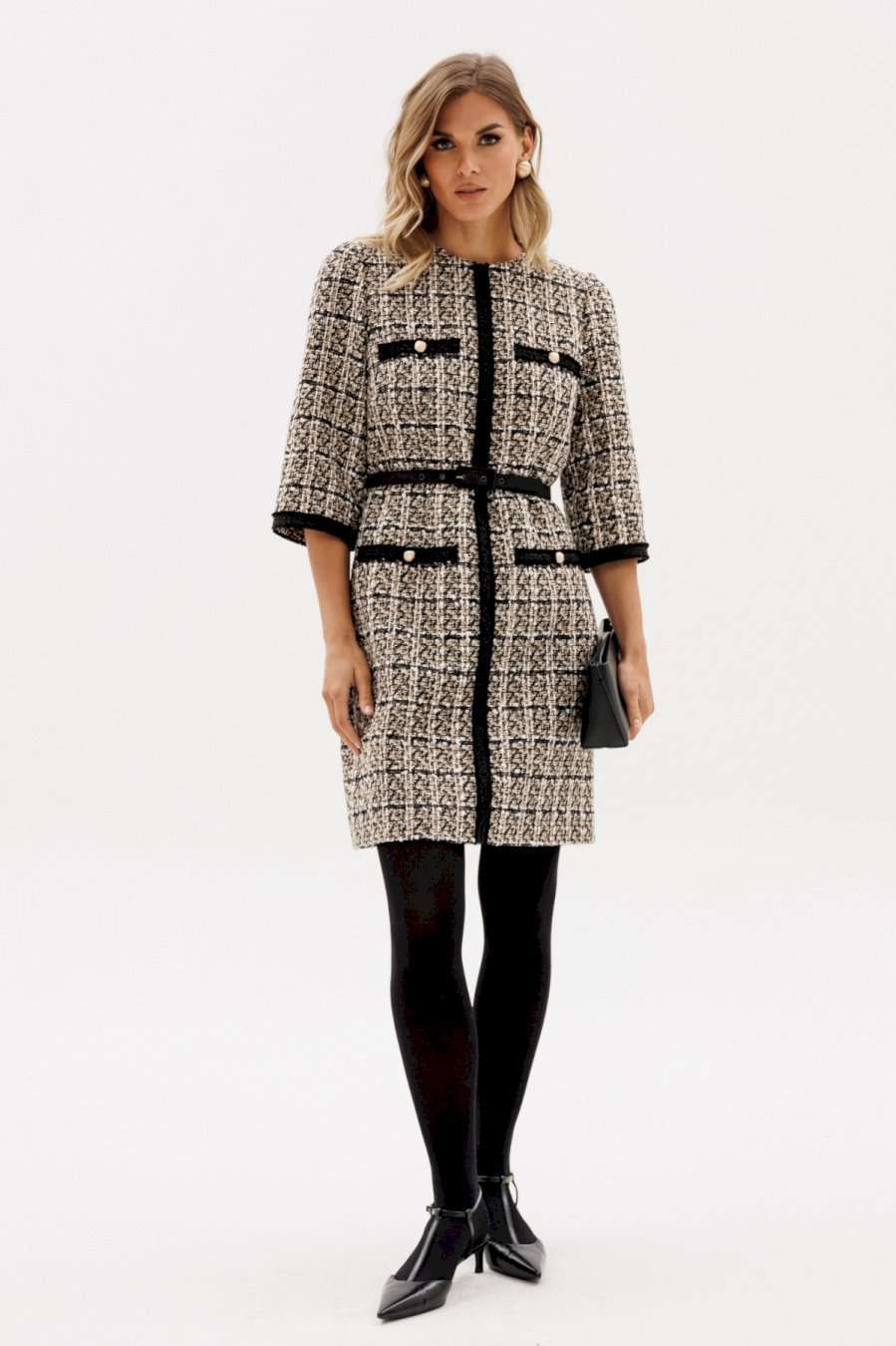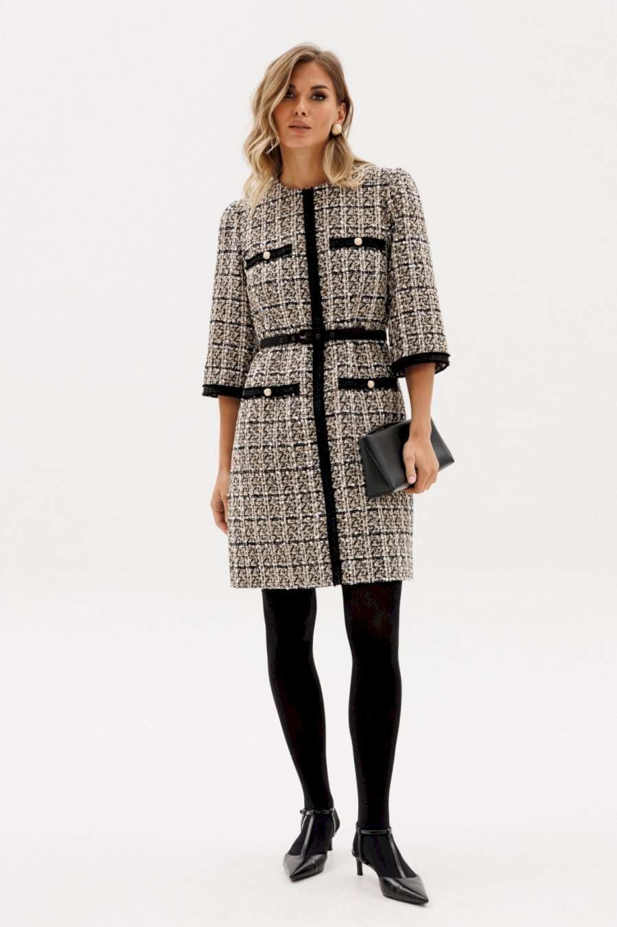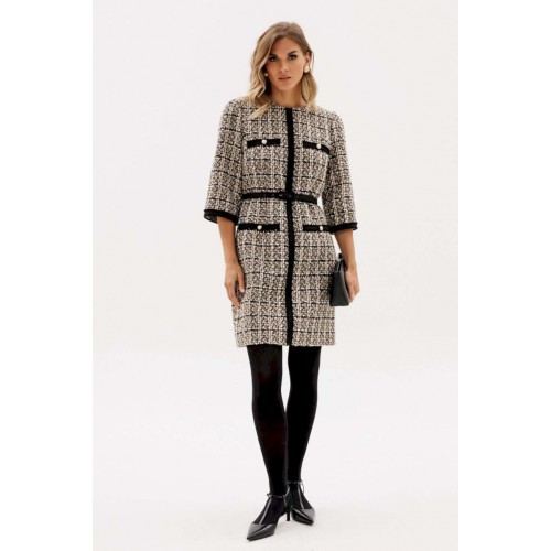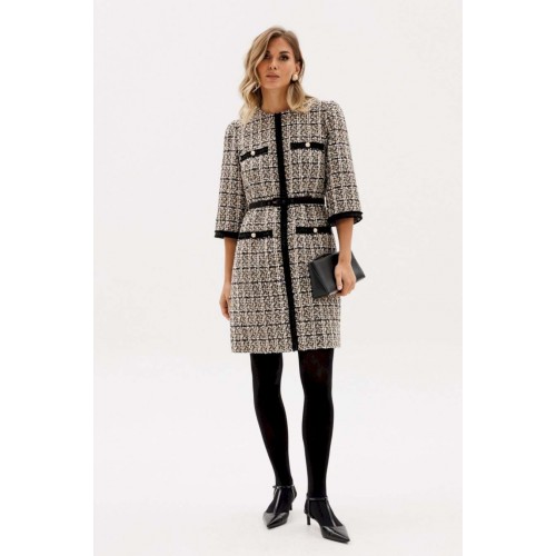 Платье выполнено из твида. Платье полуприлегающего силуэта, длиной выше линии колена. Застежка на потайную молнию в среднем шве спинки. Горловина округлой формы. Плечевой шов заужен. Рукав втачной одношовный, длиной 3/4. Платье декорировано настрочной тесьмой по центру переда, низу рукава. В комплект входит ремень из отделочной ткани с обтяжной пряжкой. Длина платья: р.44-48 - 89 см, р. 50-54 - 94 см. Длина рукава: р.44-48 - 56 см, р. 50-54 - 57,5 см.