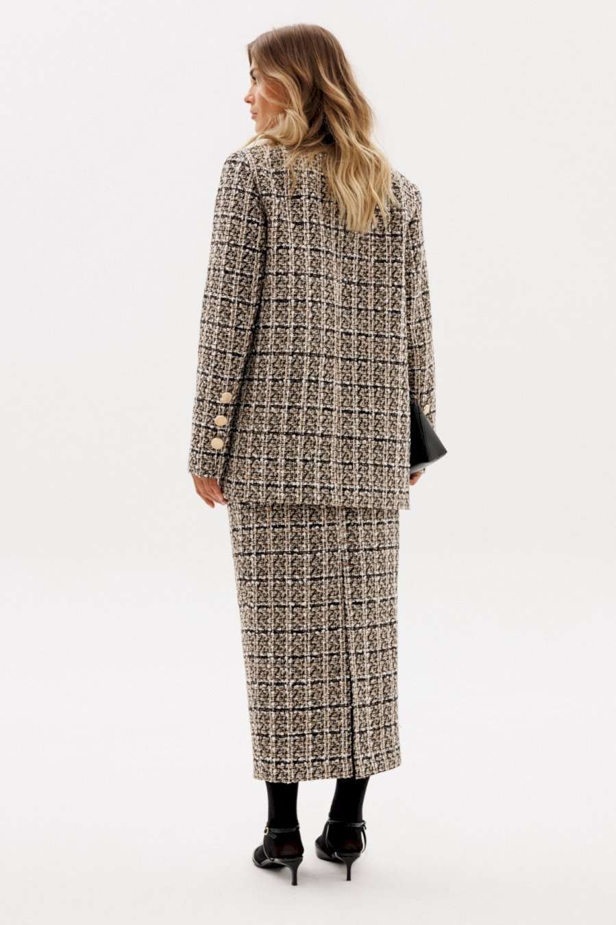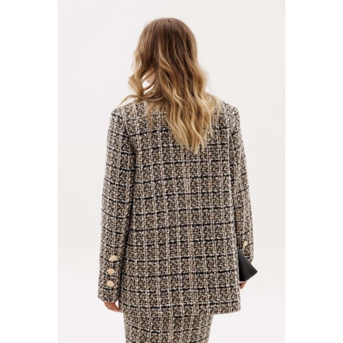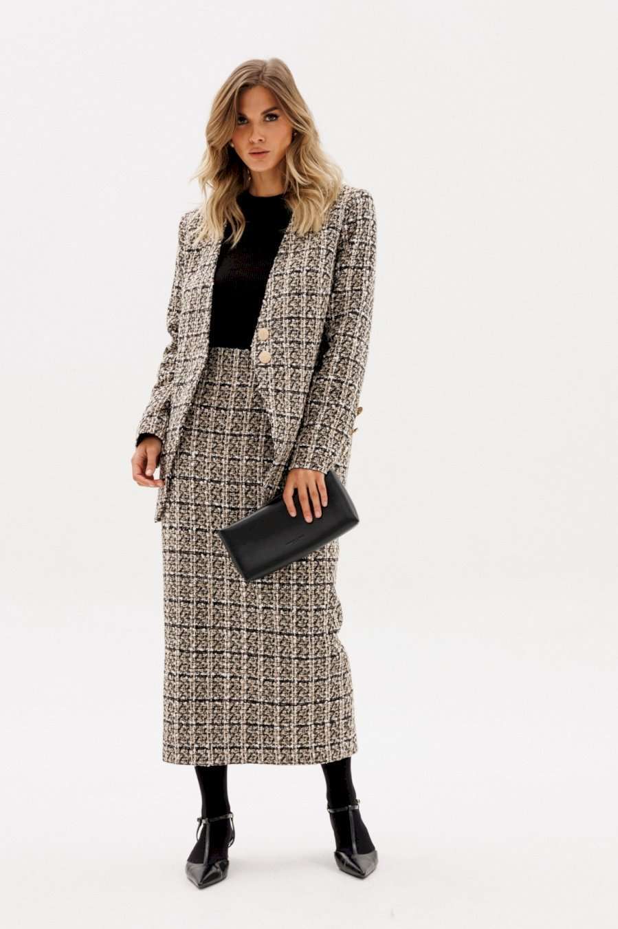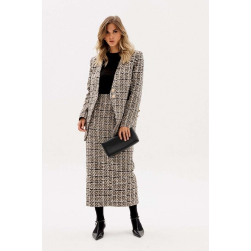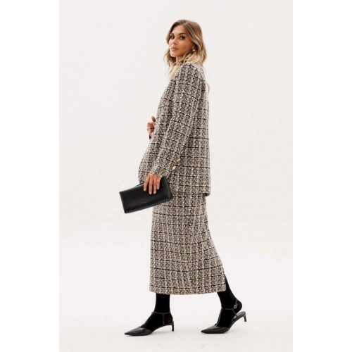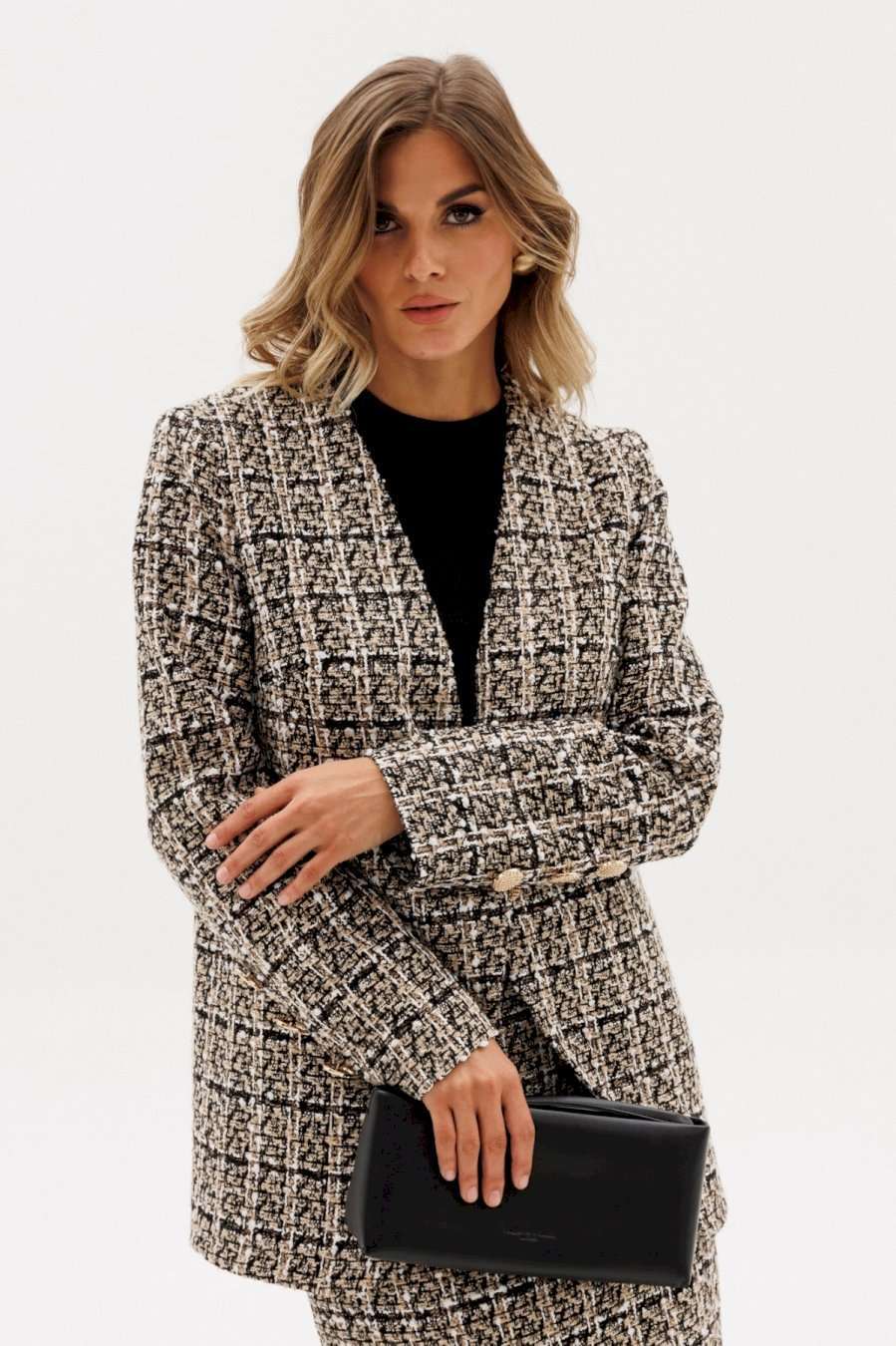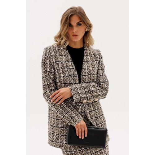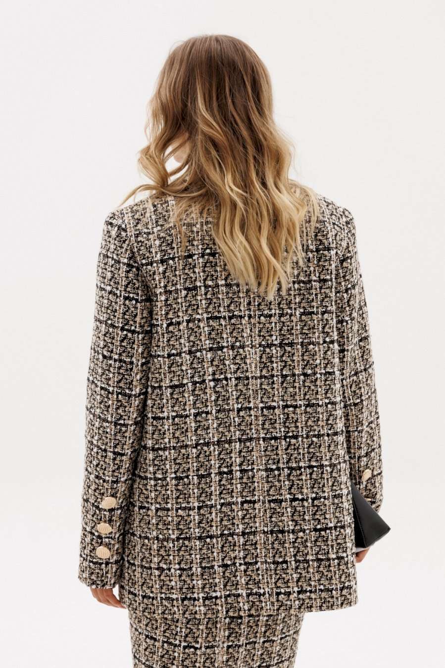Жакет выполнен из твида. Жакет прямого силуэта, длиной до линии бедер. Спереди центральная застежка на пуговицы. Край борта фигурной формы. На спинке средний шов. Горловина V-образной формы. Рукав втачной двухшовный с декоративными пуговицами. Жакет на притачной по низу подкладке. Длина жакета: р. 44-48 - 74 см, р. 50-54 - 75,5 см. Длина рукава: р. 44-48 - 63 см, р. 50-54 - 64 см.
