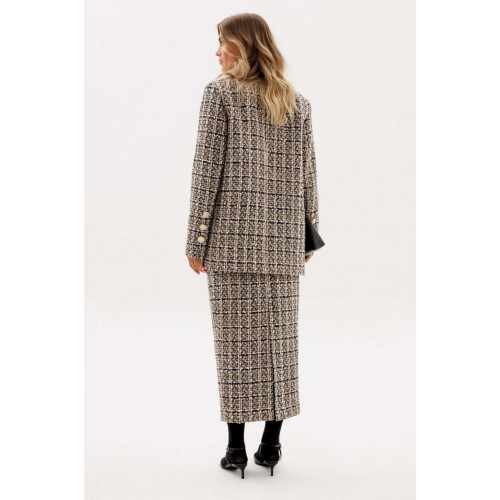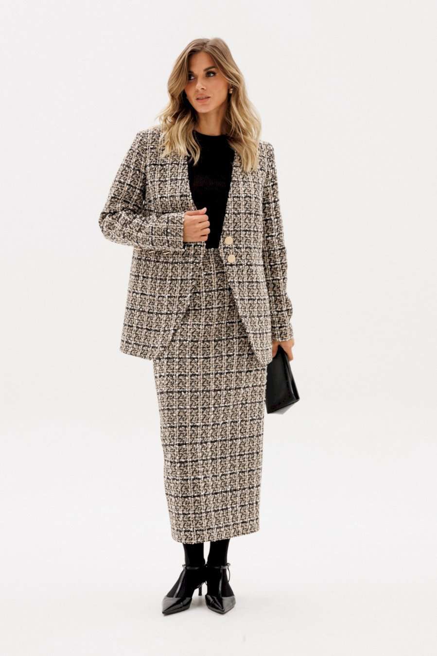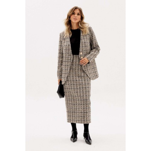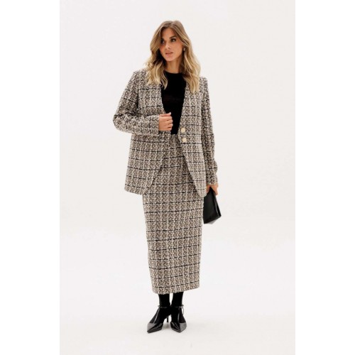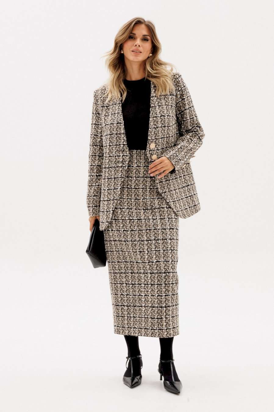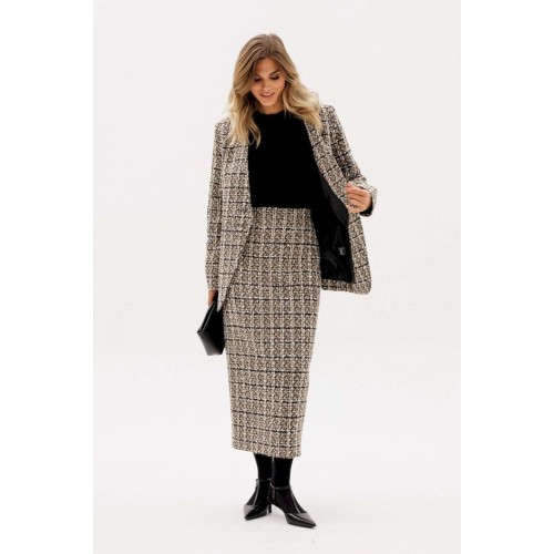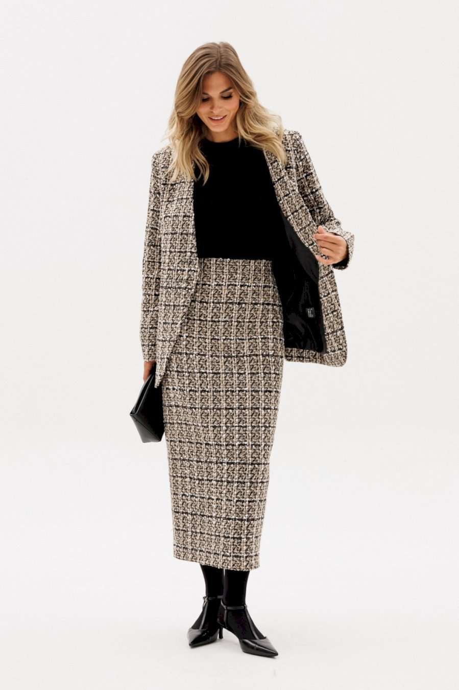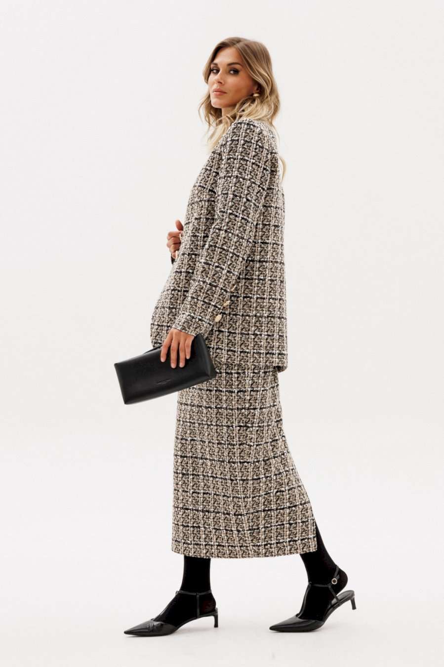 Юбка выполнена из твида. Юбка заужена к низу, длиной миди. Юбка на притачном поясе. Сзади в среднем шве разрез и застежка на потайную молнию и пуговицу. Юбка на отлетной по низу подкладке. Длина юбки: р. 44-48 - 89 см, р. 50-54 - 90 см.