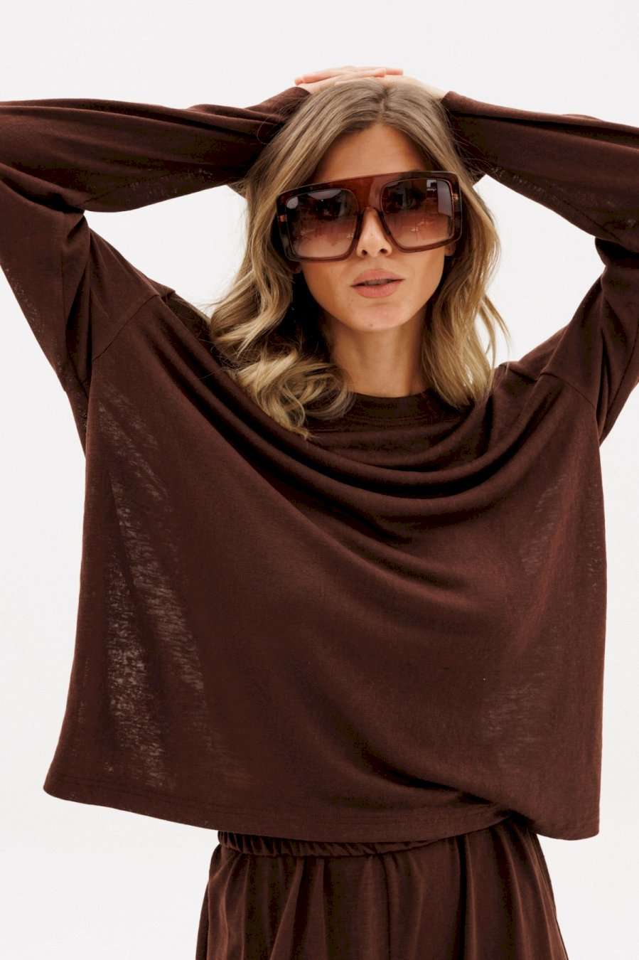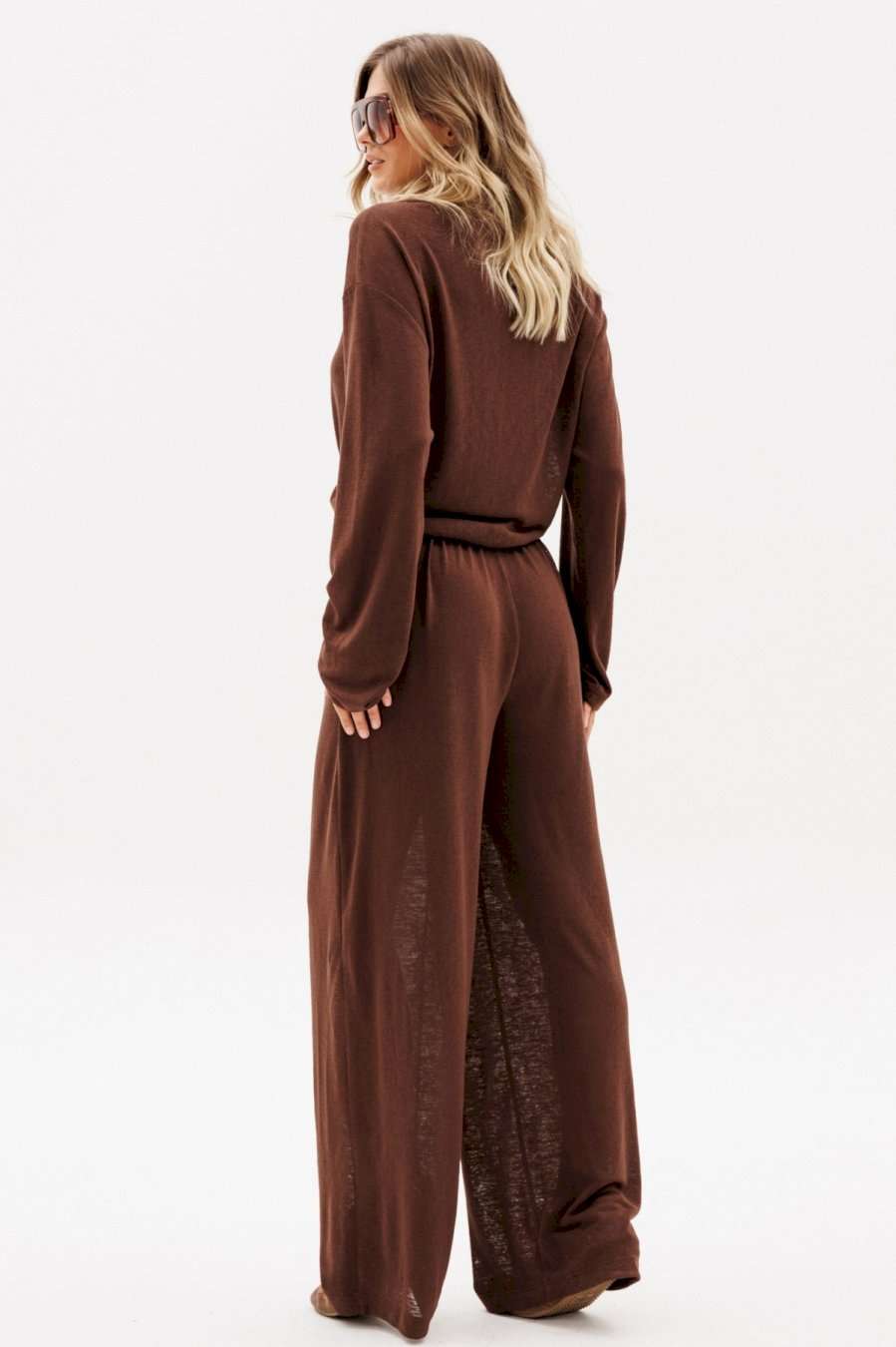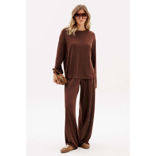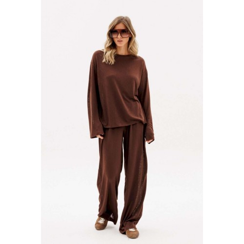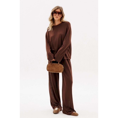 Комплект: джемпер + брюки. Комплект выполнен из трикотажного полотна. Джемпер прямого силуэта, длиной до линии бедра. Перед и спинка цельные. Горловина округлой формы, обработана широкой бейкой. Плечевой шов удлинен. Рукав рубашечного покроя, одношовный. Брюки прямого покроя, длиной в пол, на притачном поясе с эластиной тесьмой. Длина джемпера: р.44-48 - 63 см, р.50-54 - 64,5 см. Длина рукава от горловины: р.44-48 - 78 см, р.50-54 - 79 см. Длина брюкпо боковому шву: р.44-48 - 111 см, р.50-54 - 112 см.
